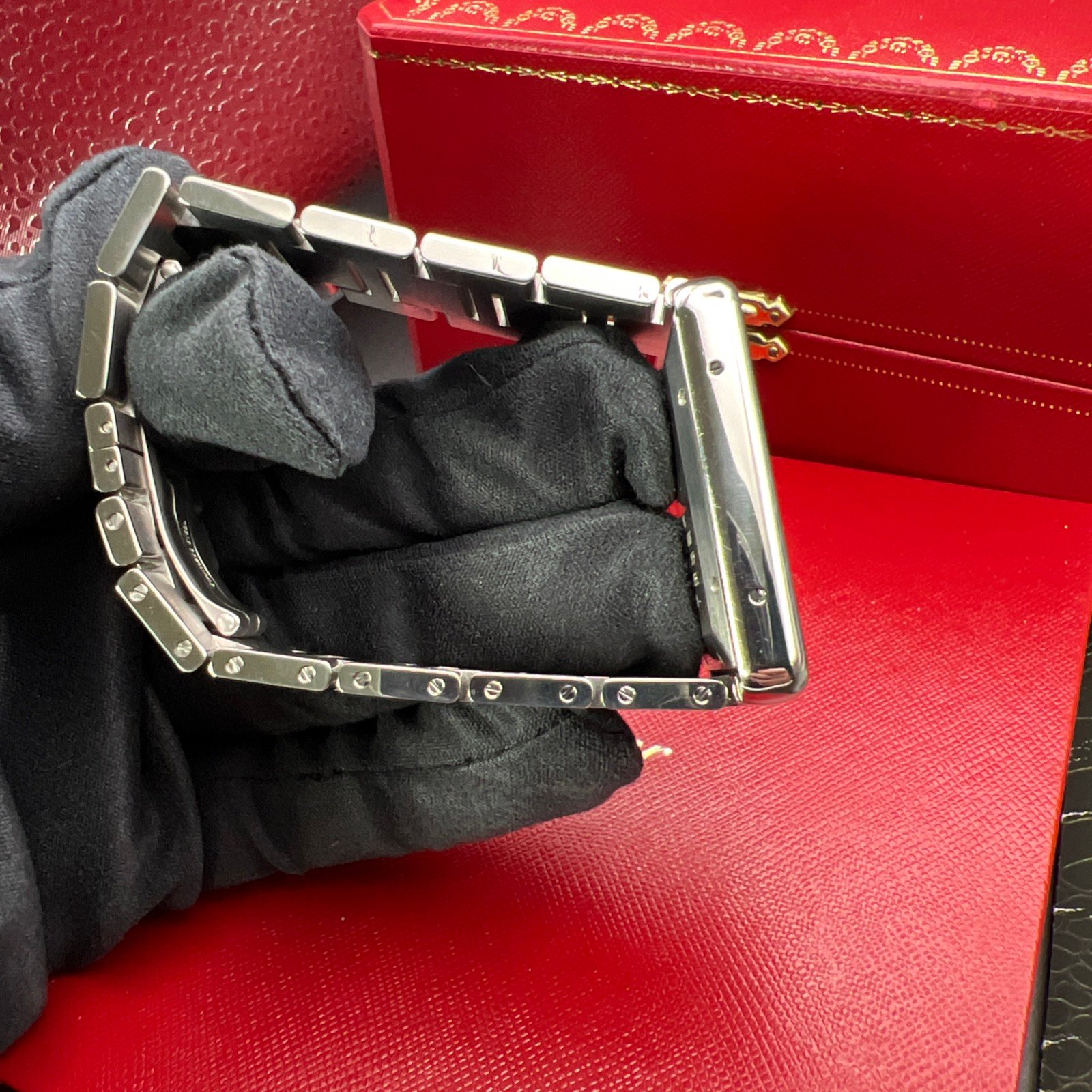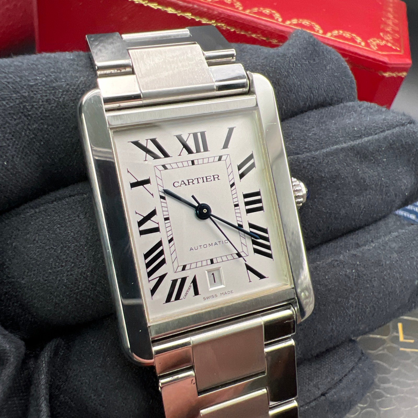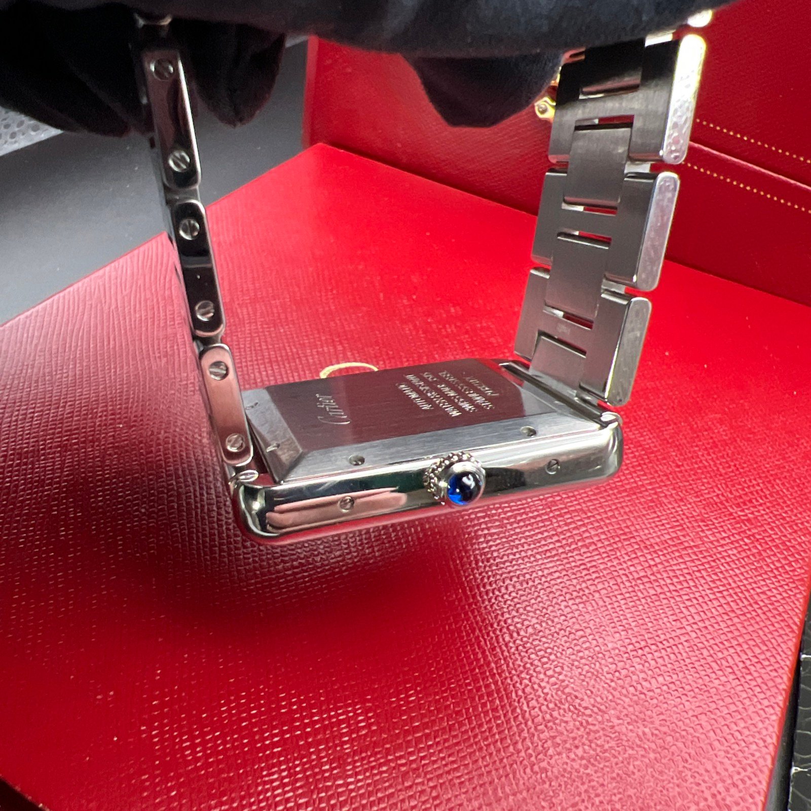 Cartier tank solo XL model reference 3515. This is the largest size automatic variety of this model. The Watch is in very good condition with only very minor surface marks from use. It comes presented with original box and papers, also included is a service receipt from Cartier And the original bill of sale from Laing’s jewellers. Watch was originally sold in 2014. The watch has been inspected prior to listing and thoroughly cleaned. The inner cushion of the box has lost It’s covering. Cartier boxes from this era often breakdown. |