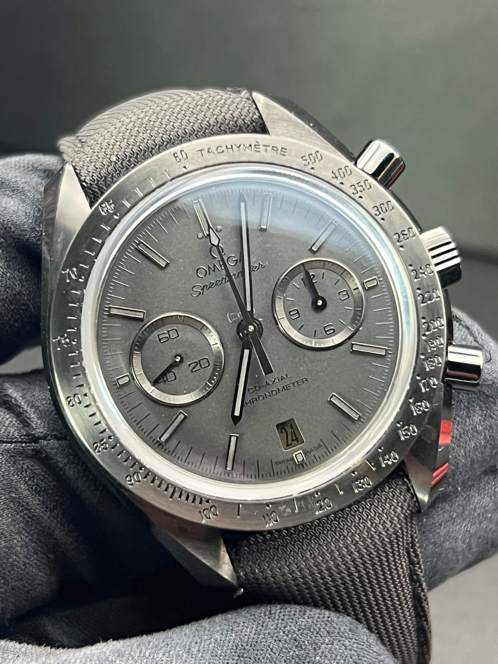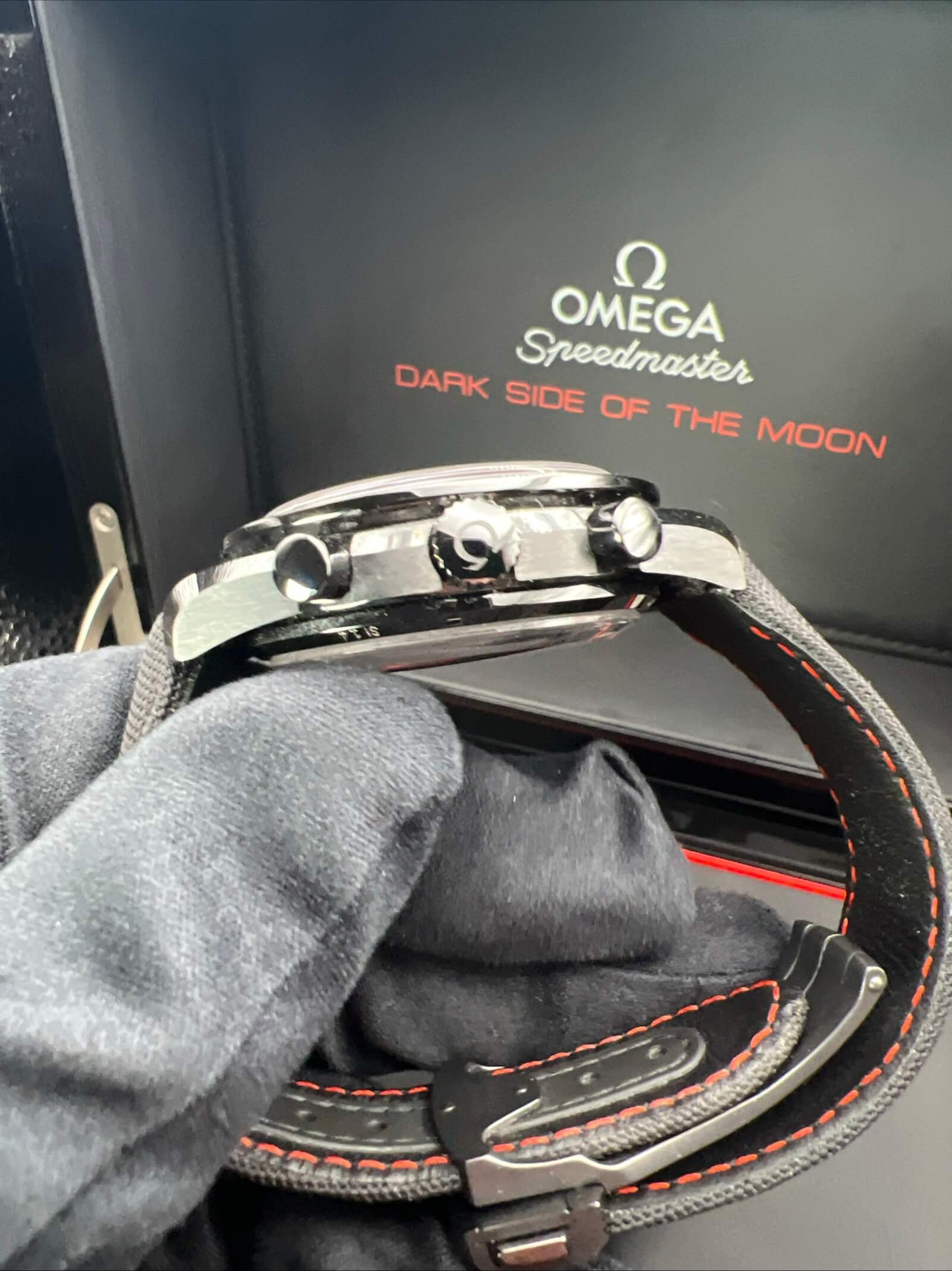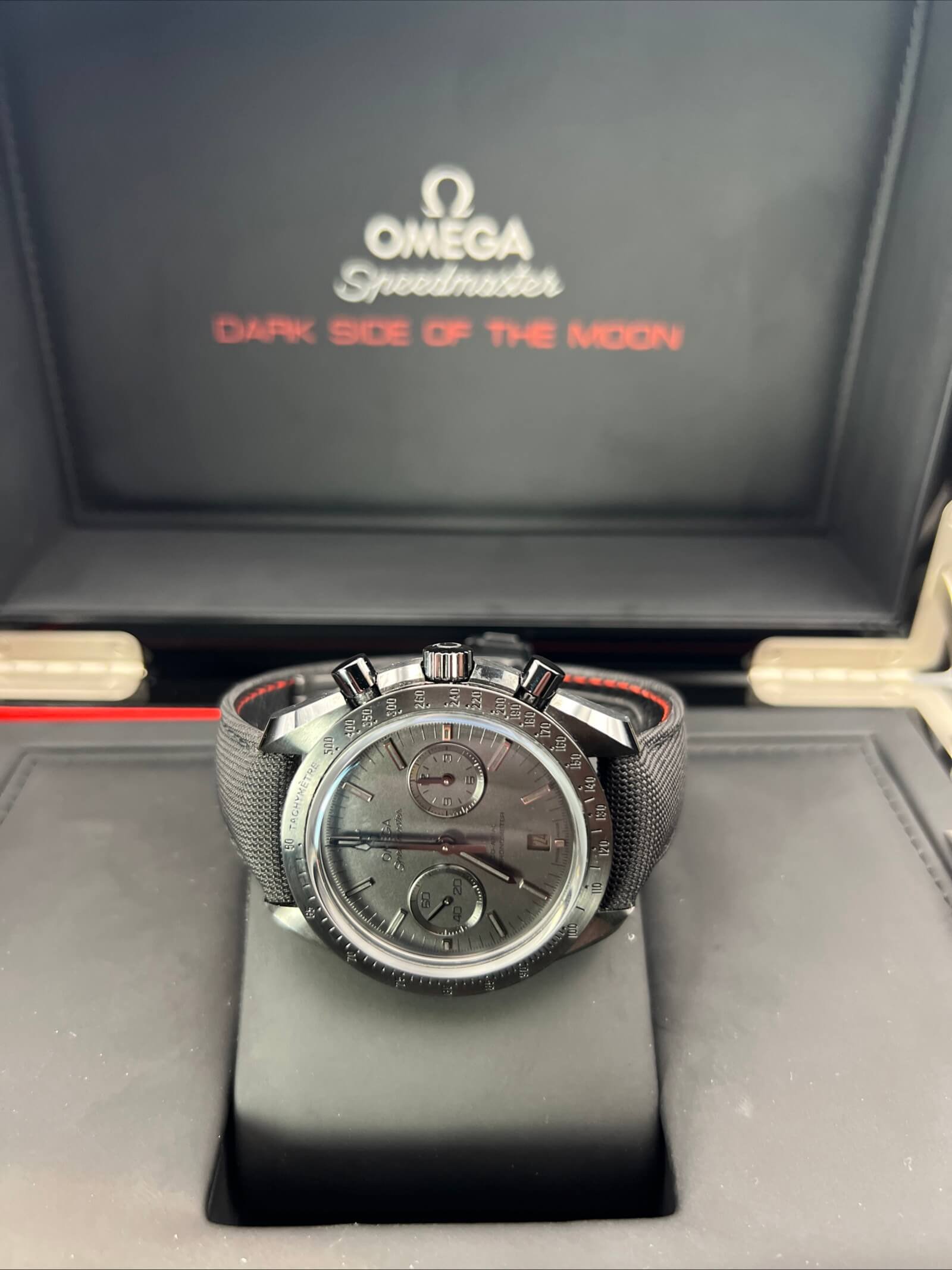 Omega Speedmaster chronograph gents wristwatch. This is the black dark side of the moon edition.