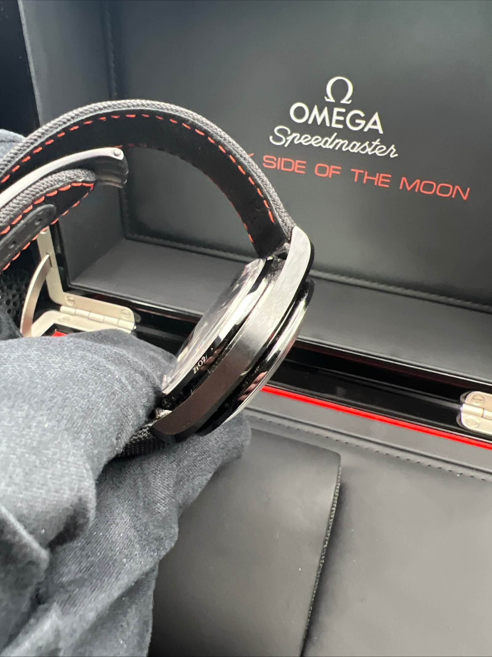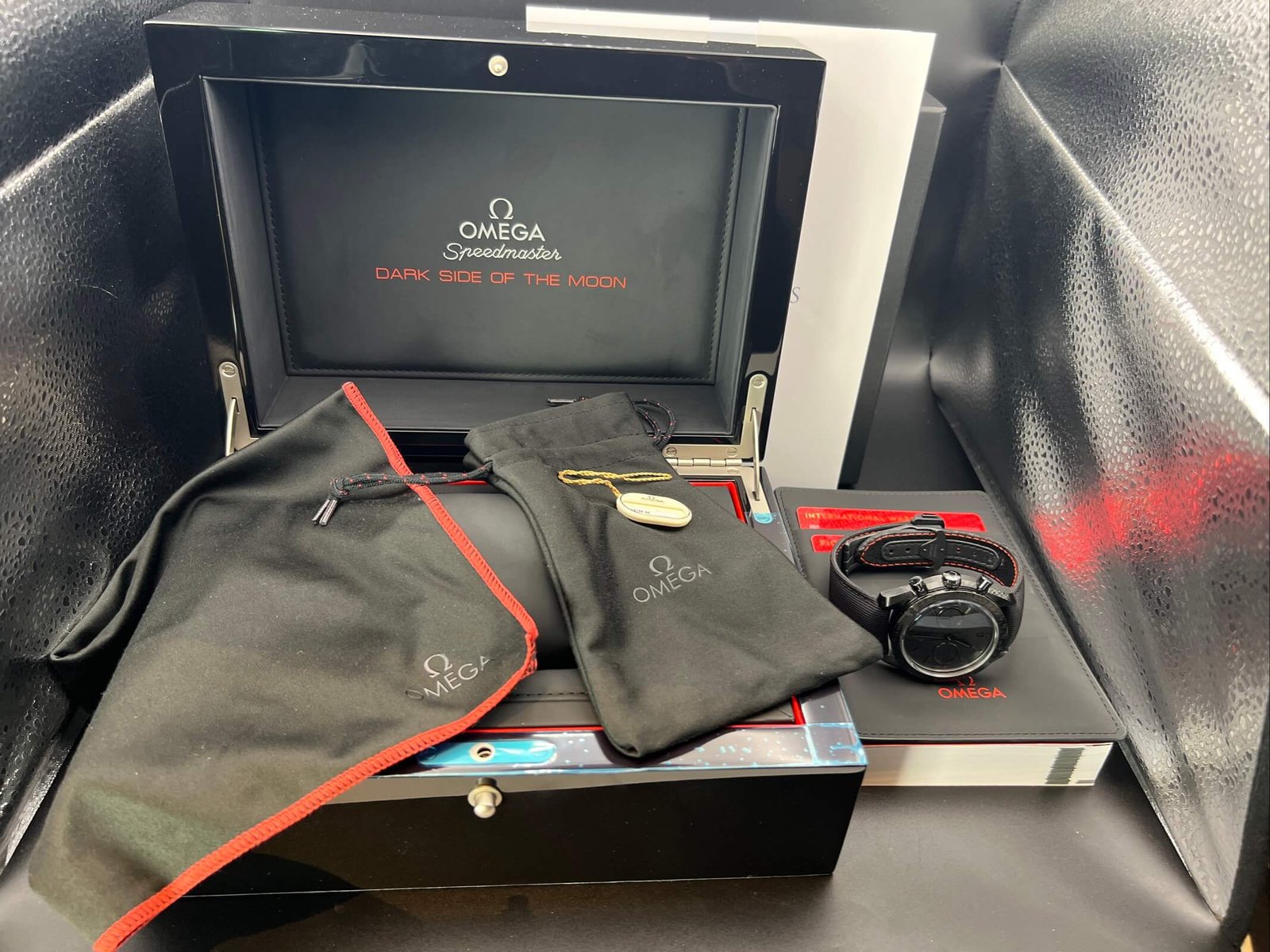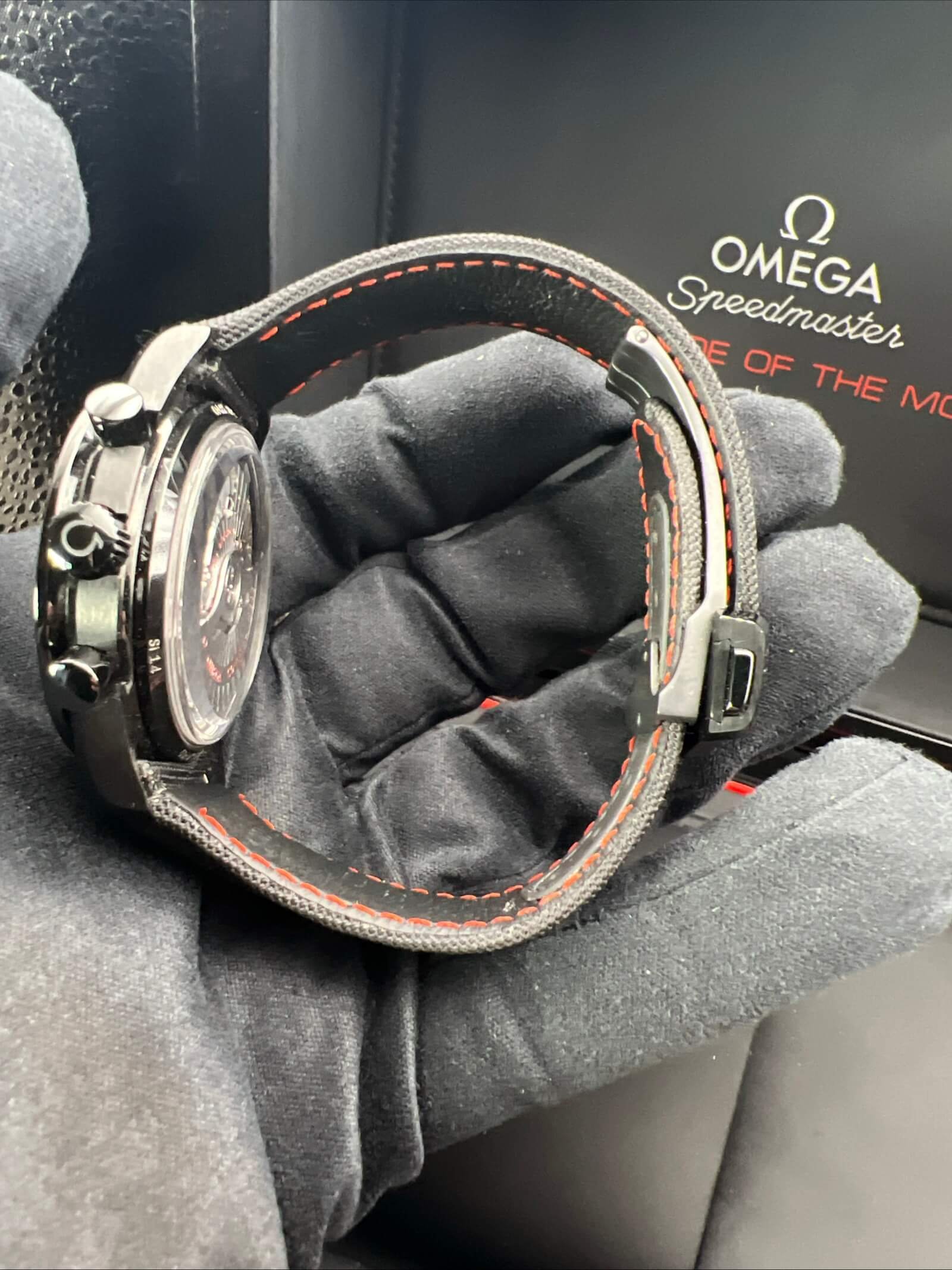 Omega Speedmaster chronograph gents wristwatch. This is the black dark side of the moon edition.