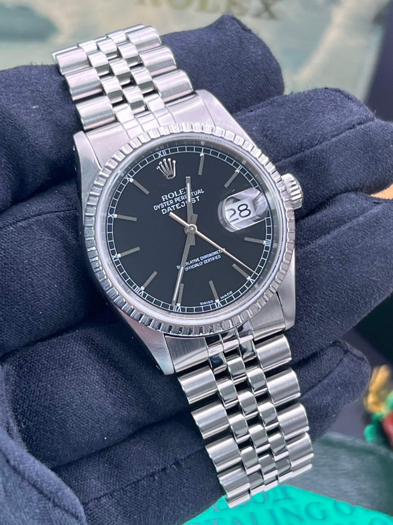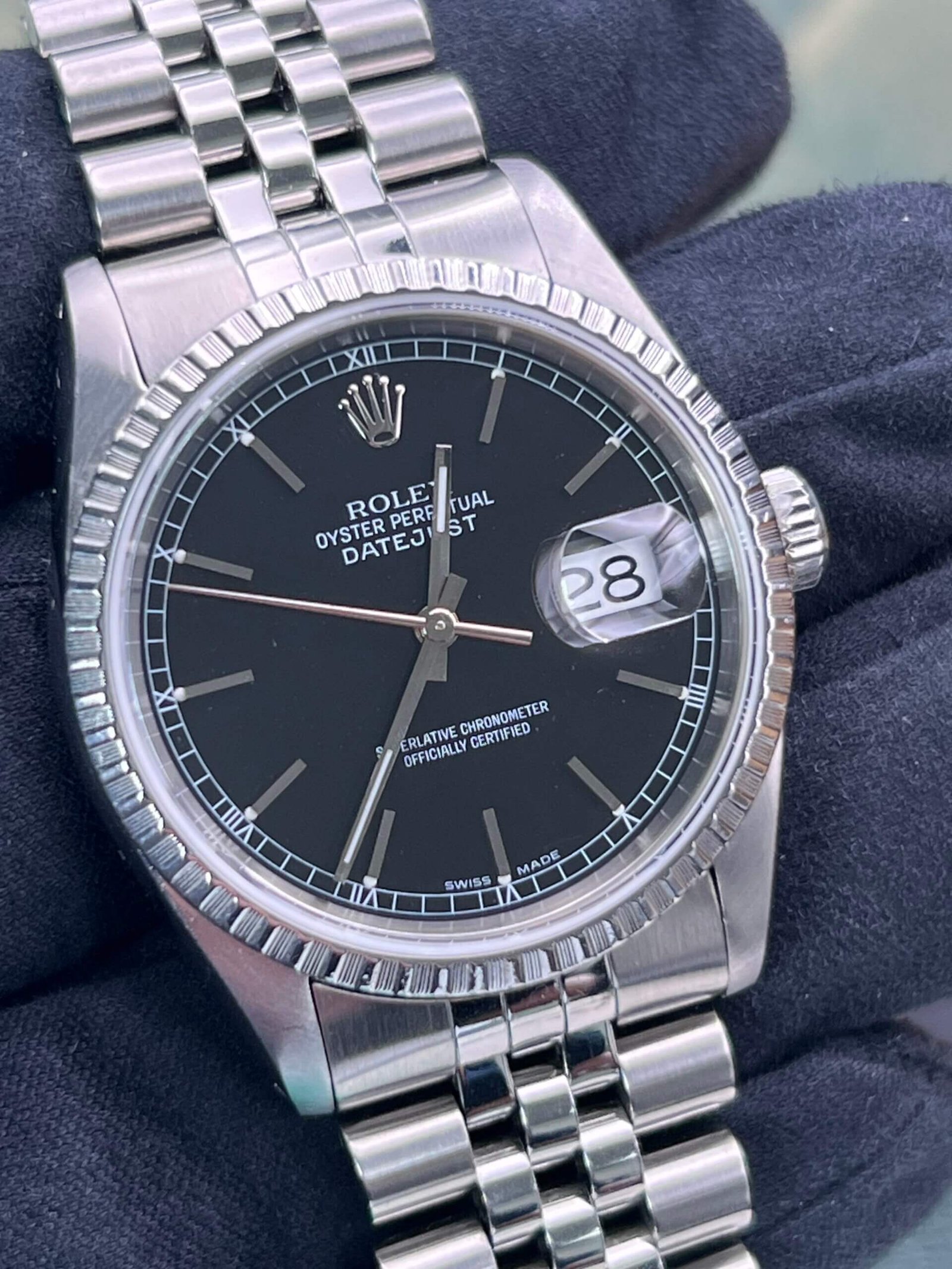 Rolex Datejust 36 mm reference 16220 stainless steel wristwatch. This Watch has the E serial number dating it to 1990.