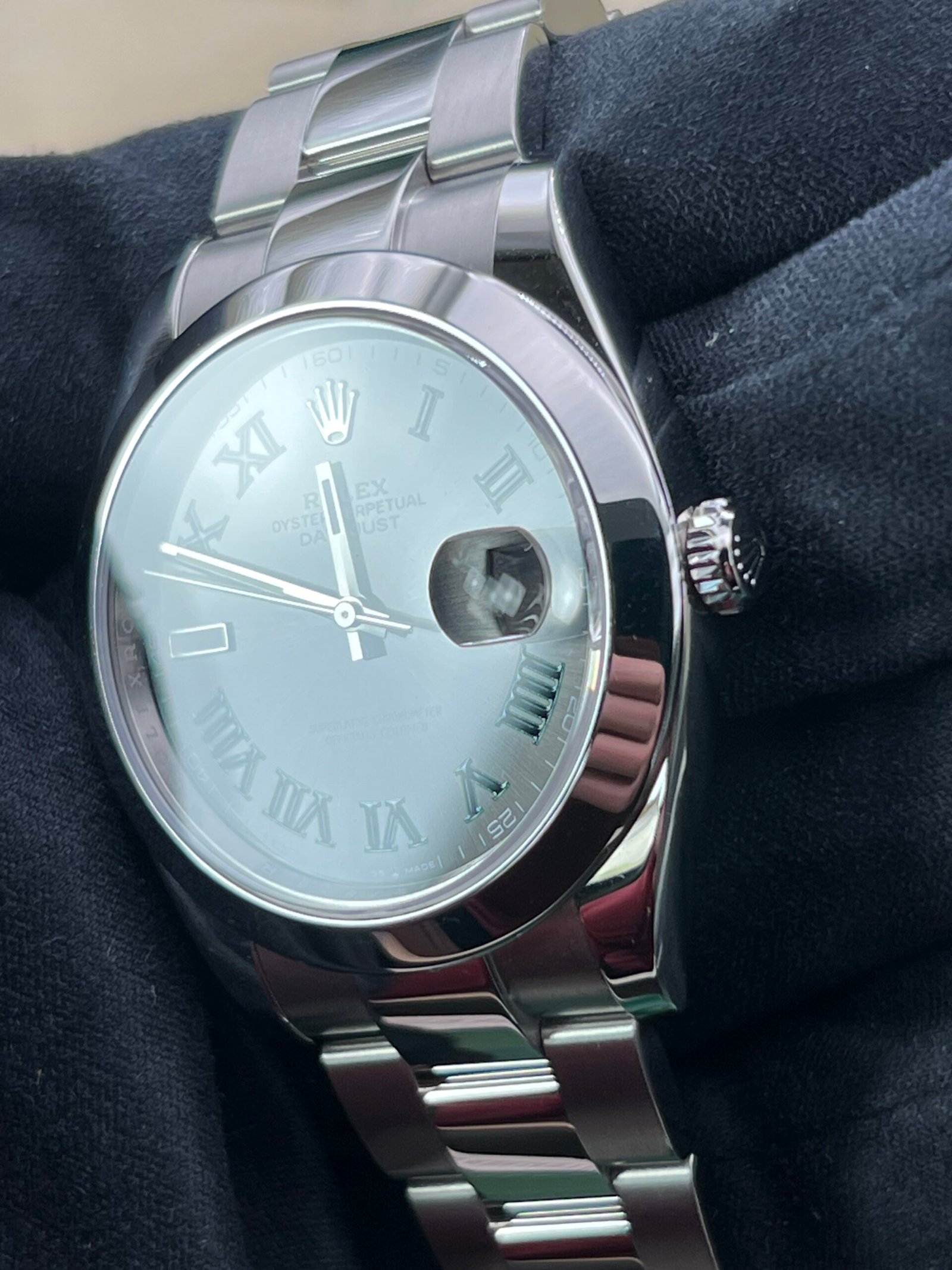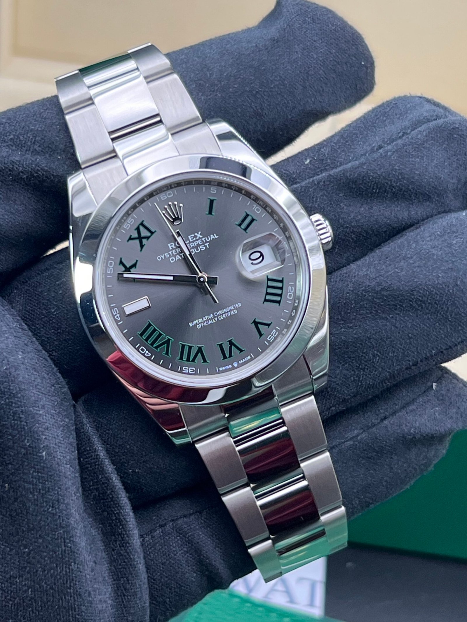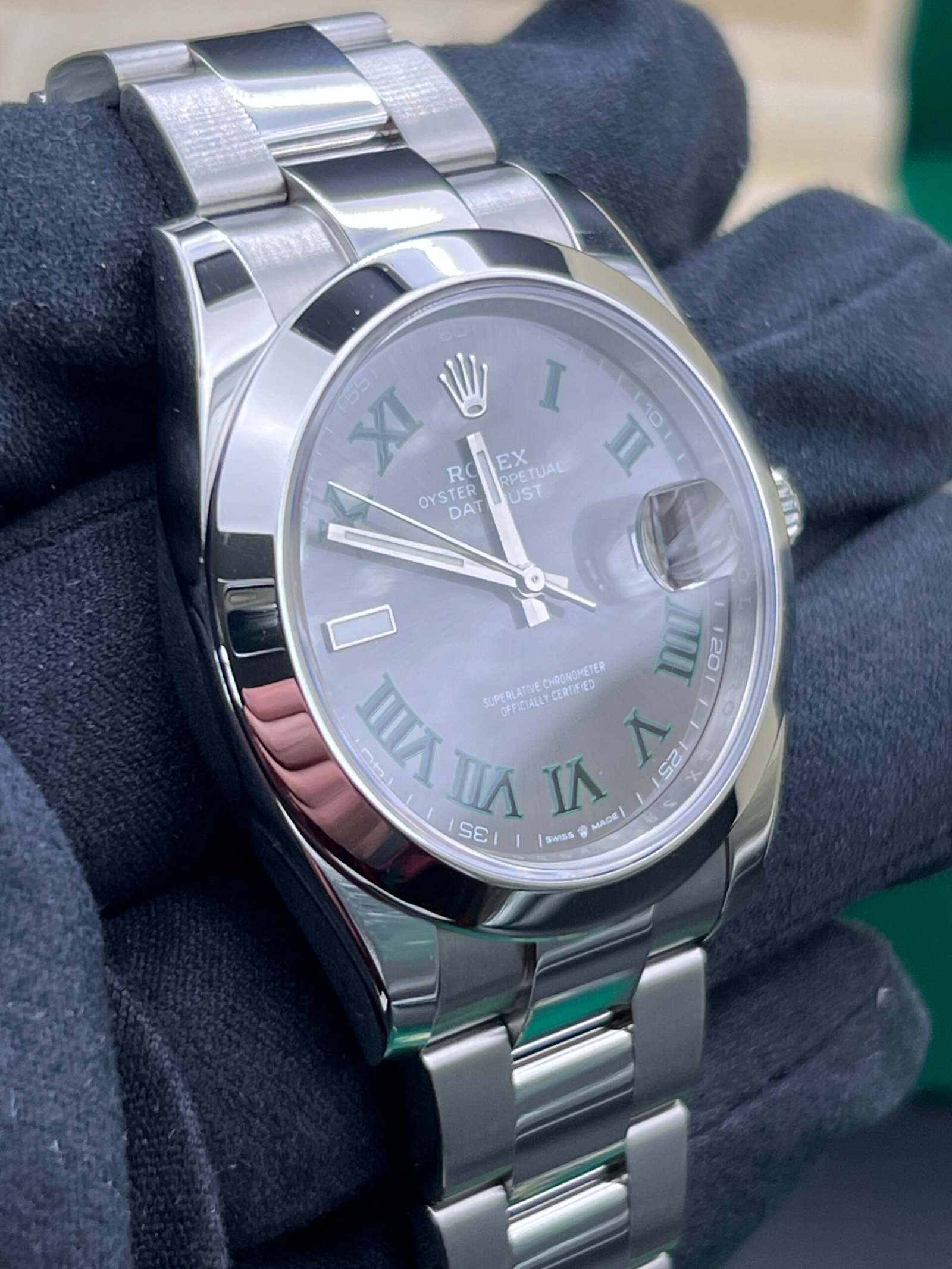 Rolex Datejust 41 mm stainless steel gents wristwatch. This is the reference 126300 with the popular sort after Wimbledon Dial.