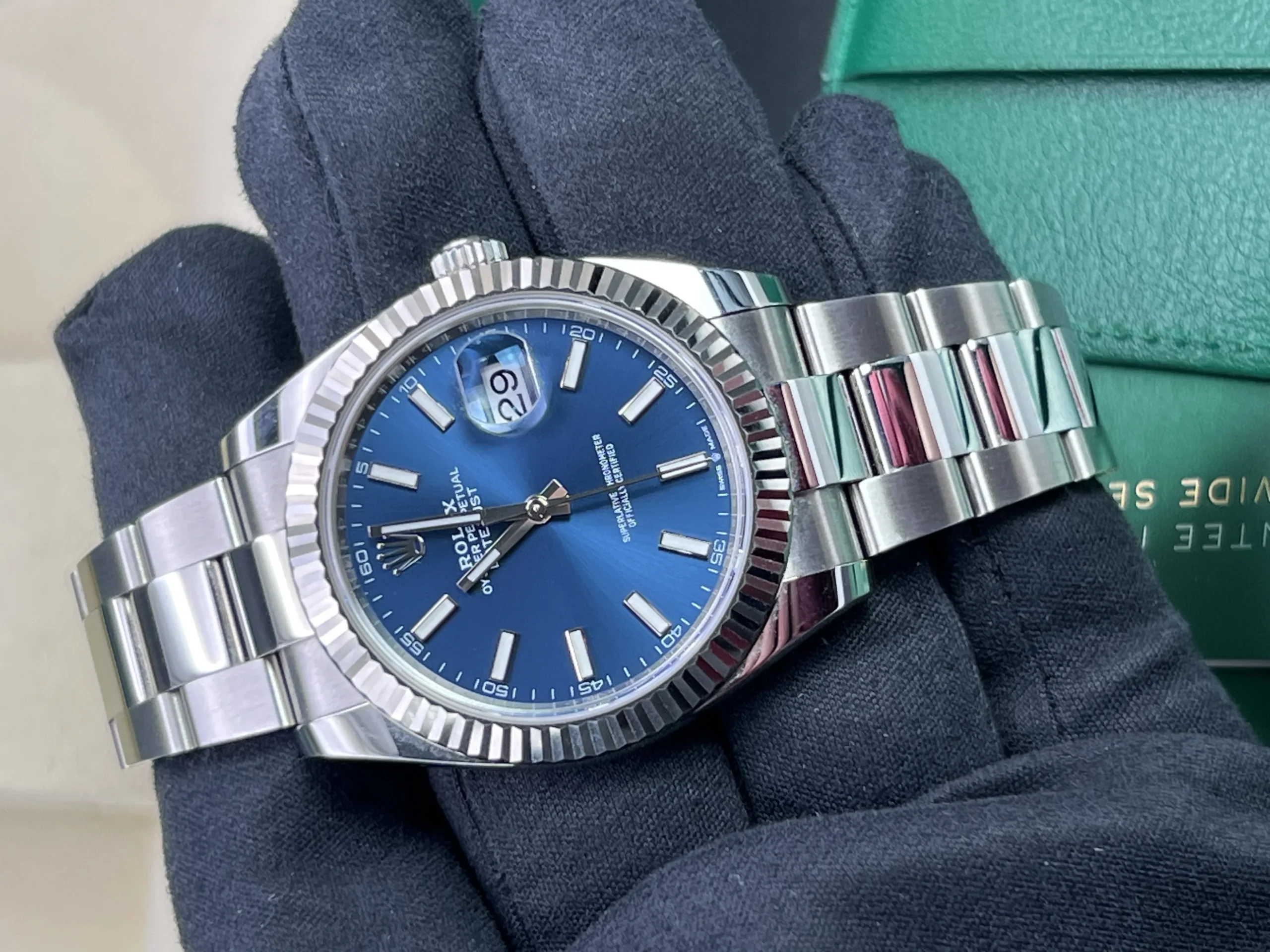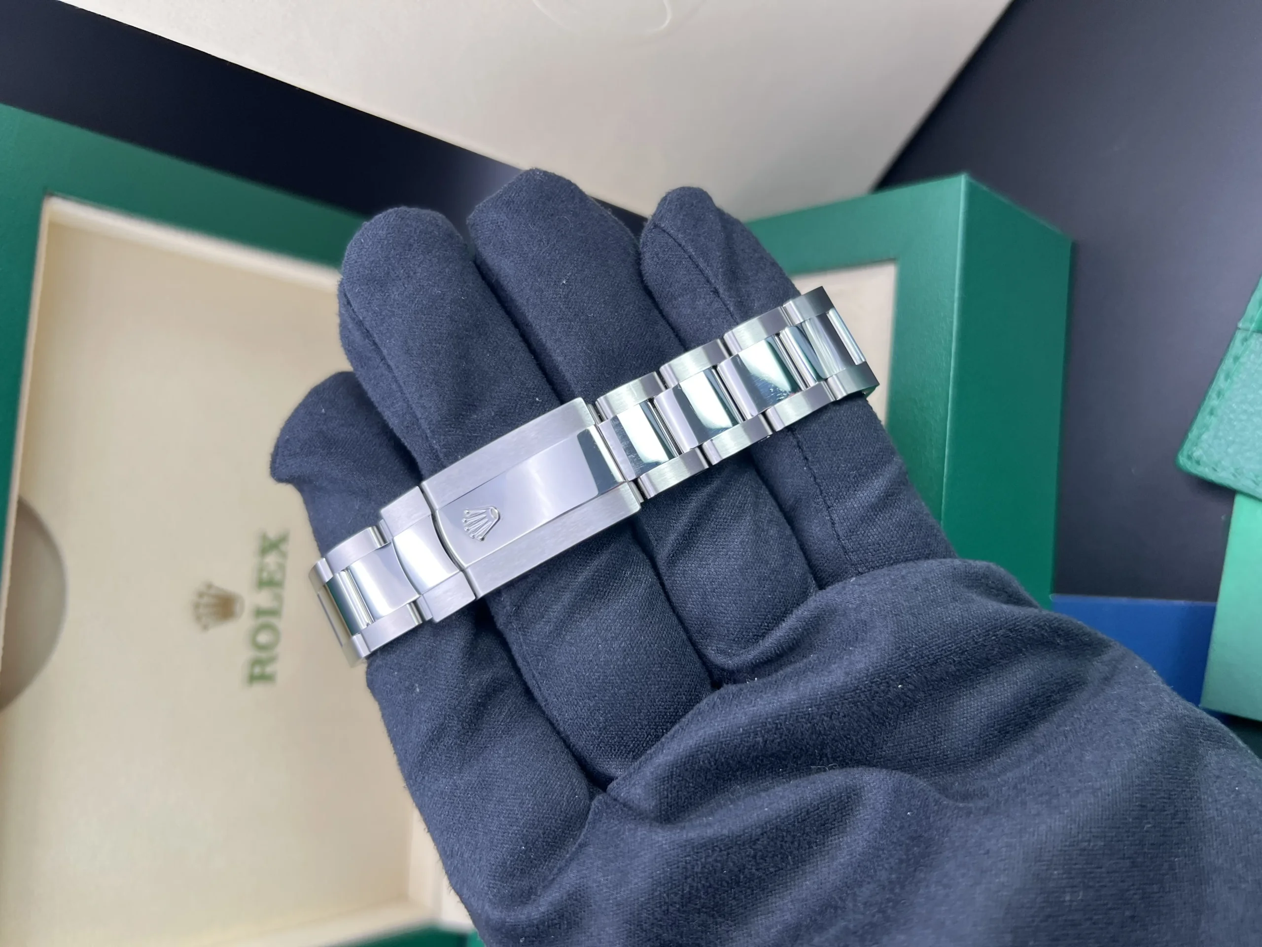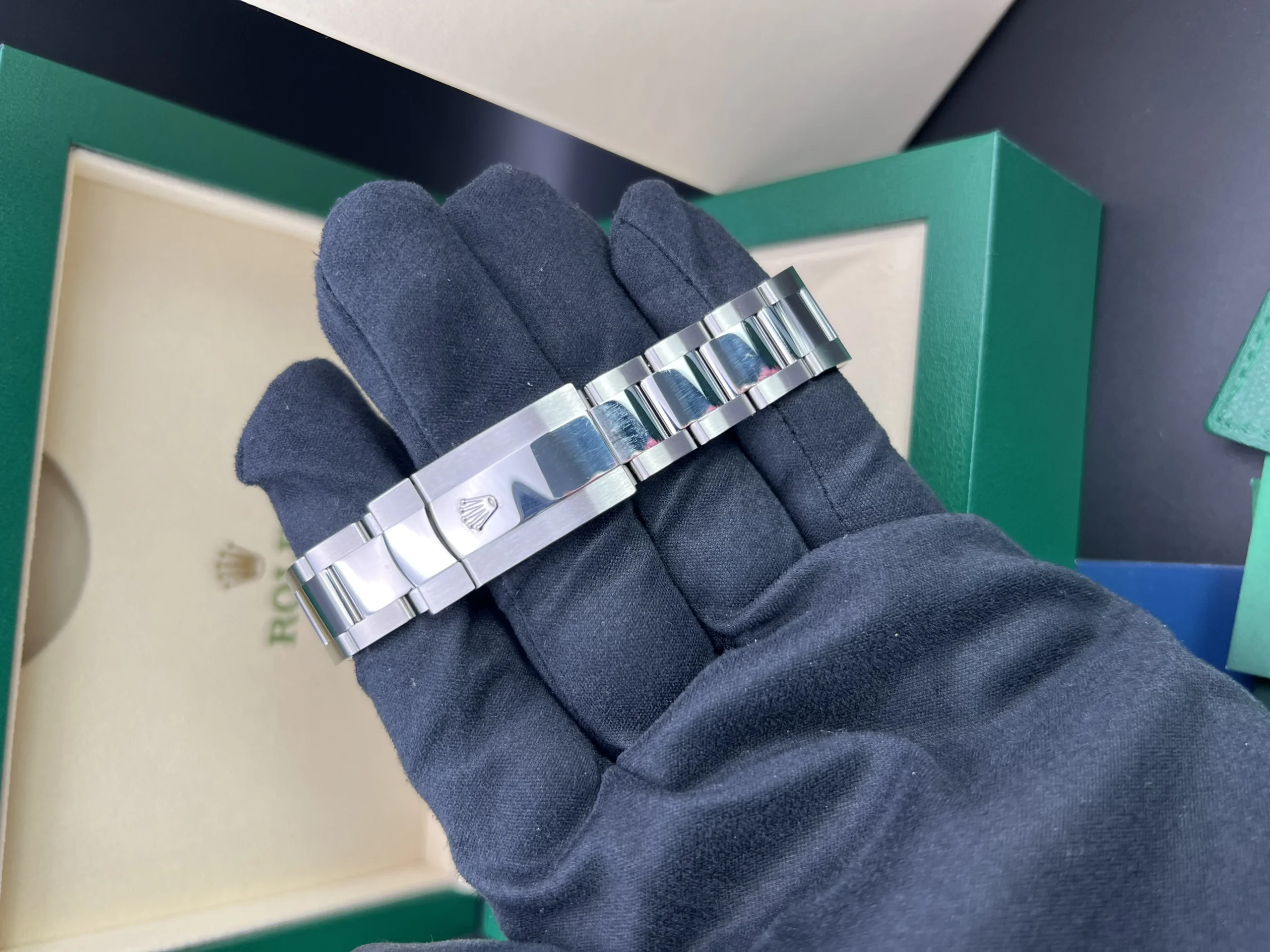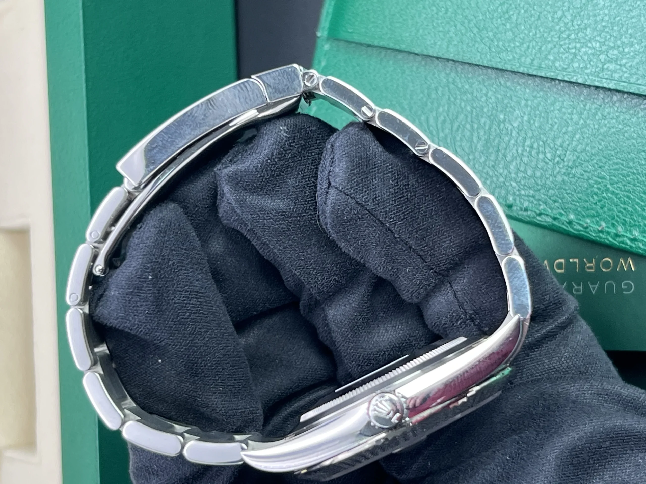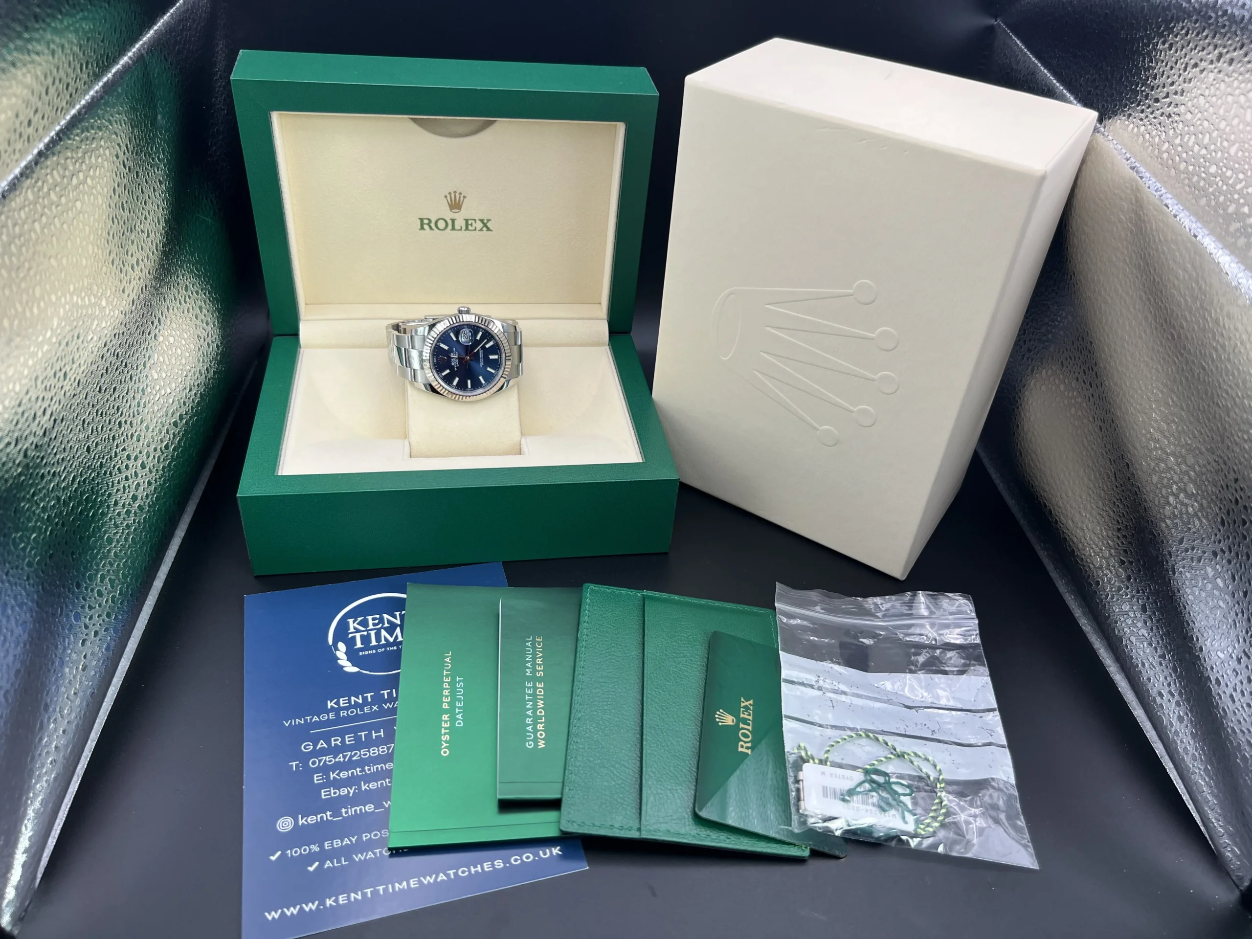 This Watch comes presented as a full set, including Rolex boxes, Rolex warranty card, booklets, wallet and both hangtags. You will also receive a Watch register certificate and an Ebay digital ID card.