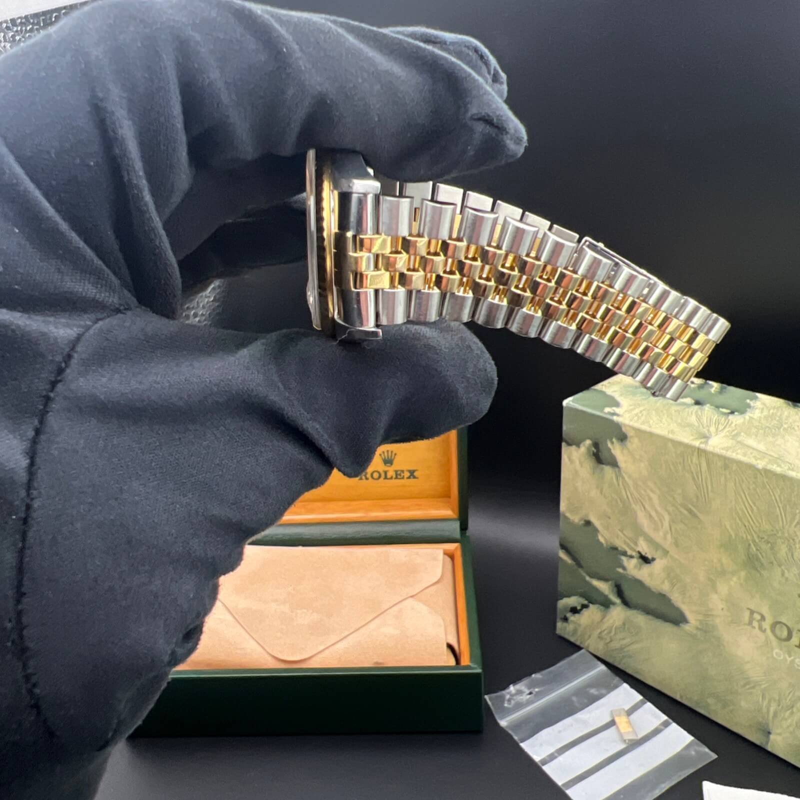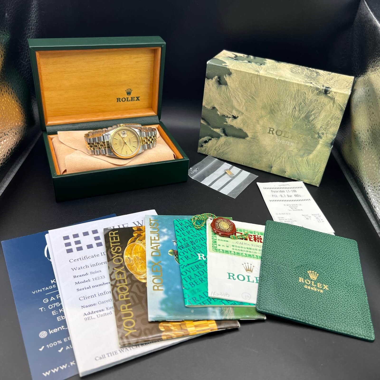 It comes complete with what you see in the pictures. Rolex boxes, papers, wallets,tag, booklets and watch register certificate.