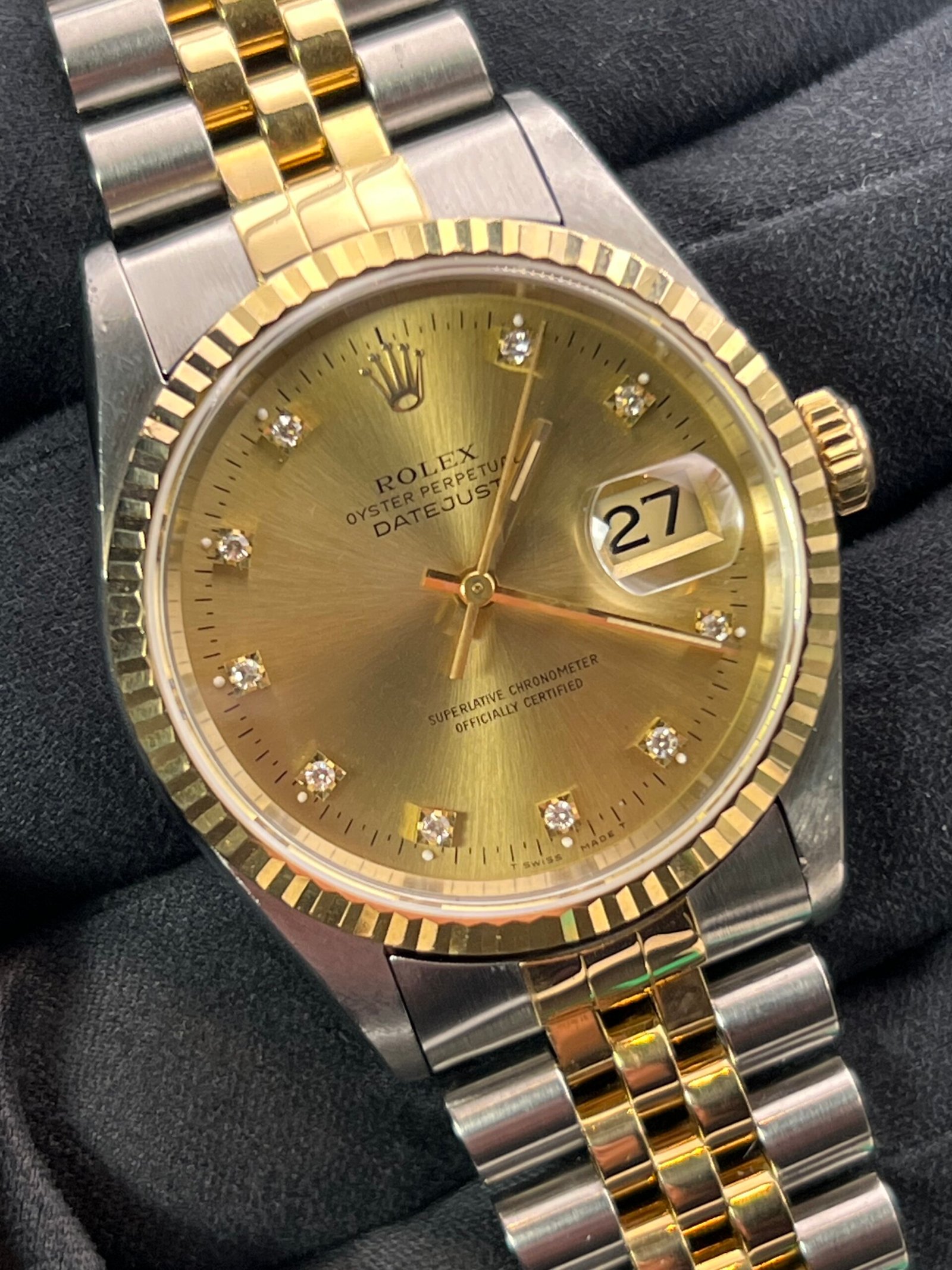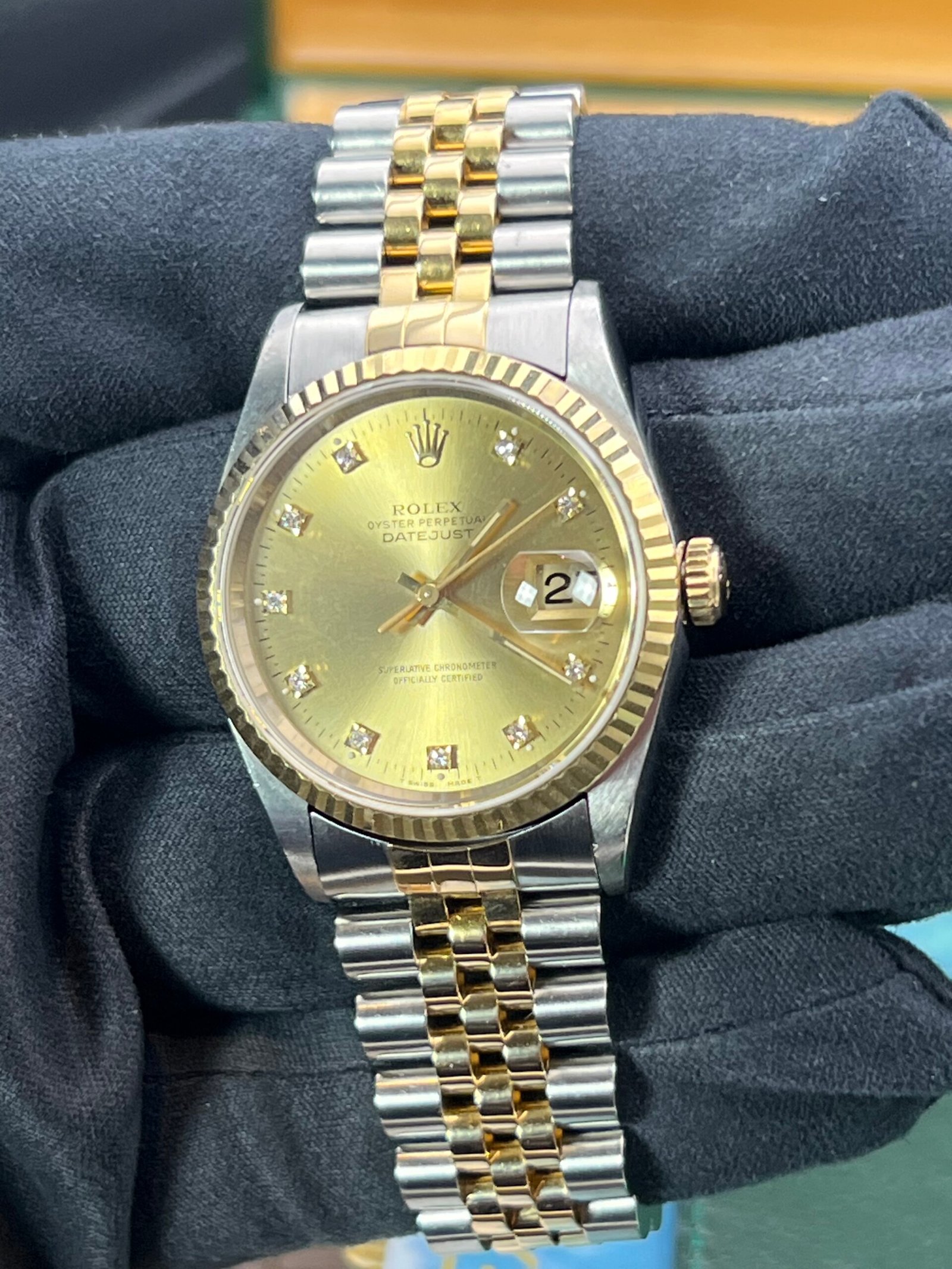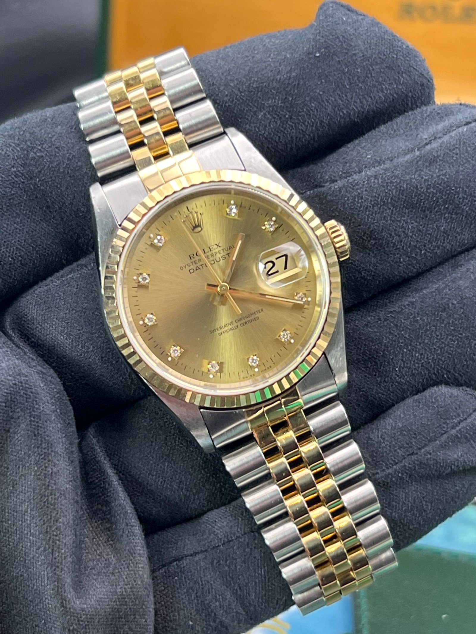 | Rolex Datejust 36 mm reference 16233 from 1996. This Watch is supplied with original box and papers. Watch comes with Rolex boxes, papers, booklets, calendar card, wallet and Tag you will also receive a Watch registered certificate showing the Watches free of claims and Ebay is authentication guarantee card. Watch is presented in good condition. It does have light marks from being used. Remember this is a 30-year-old Watch. The factory diamond champagne Dial is unmarked as is the glass. Please see all the photos as they form part of the description. The Watch has been thoroughly inspected and cleaned prior to listing. Please see our feedback and our other |