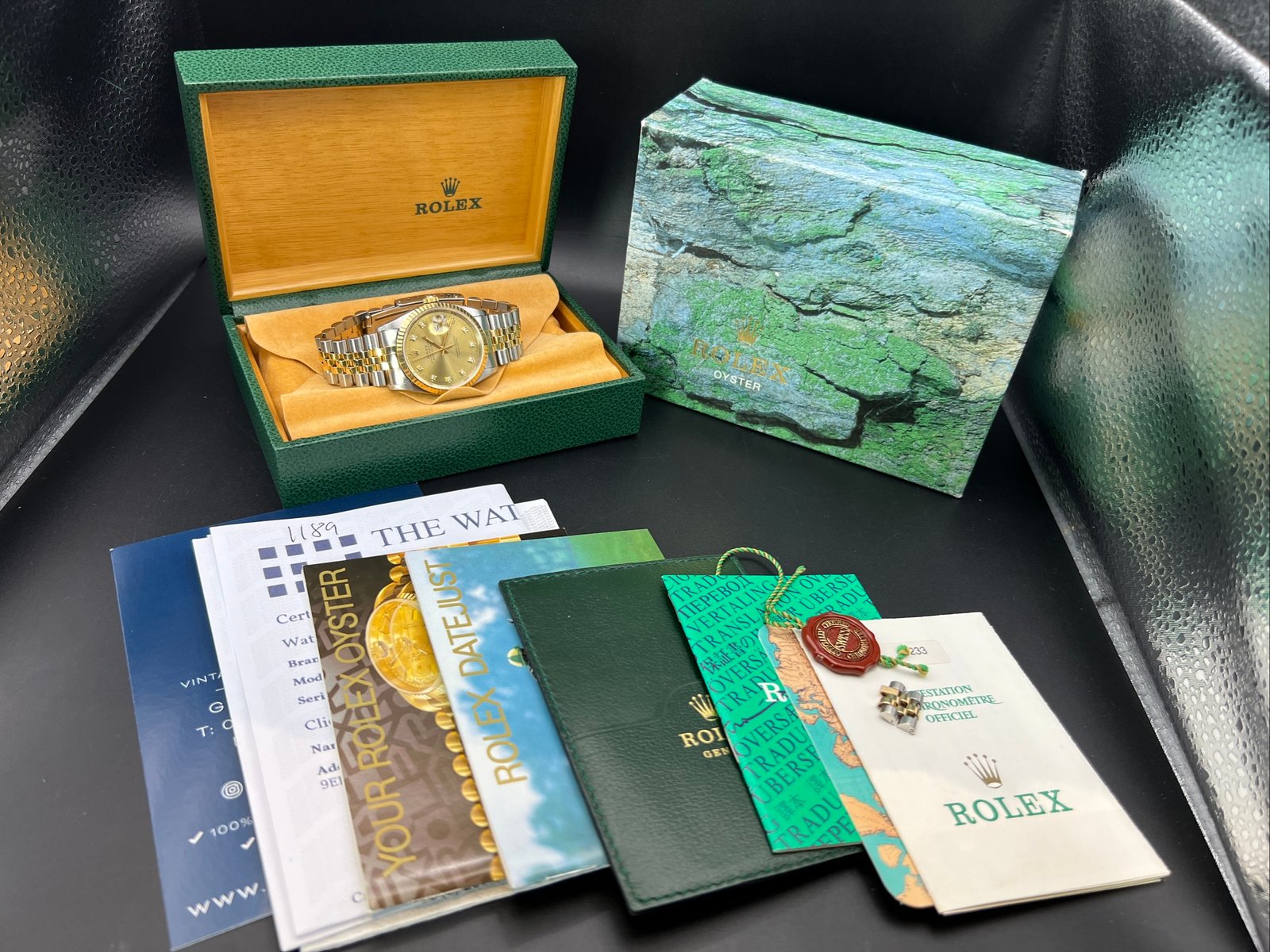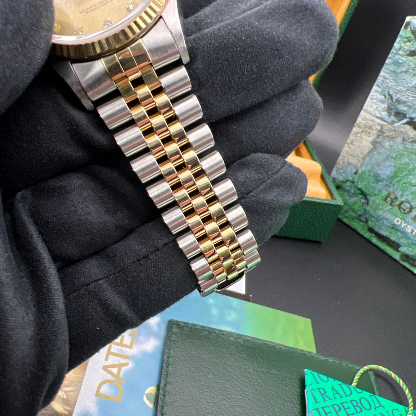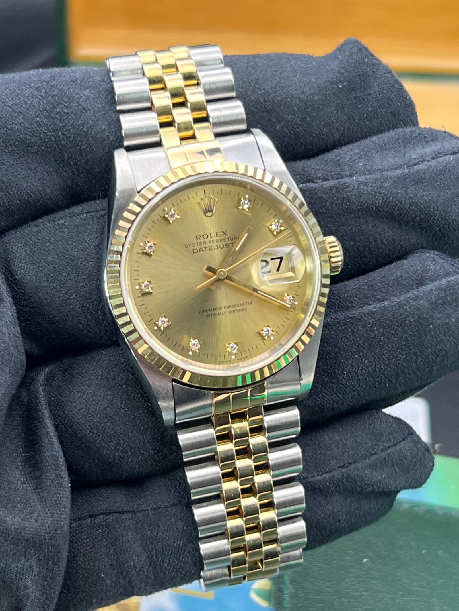 | Rolex Datejust 36 mm reference 16233 from 1996. This Watch is supplied with original box and papers. Watch comes with Rolex boxes, papers, booklets, calendar card, wallet and Tag you will also receive a Watch registered certificate showing the Watches free of claims and Ebay is authentication guarantee card. Watch is presented in good condition. It does have light marks from being used. Remember this is a 30-year-old Watch. The factory diamond champagne Dial is unmarked as is the glass. Please see all the photos as they form part of the description. The Watch has been thoroughly inspected and cleaned prior to listing. Please see our feedback and our other |