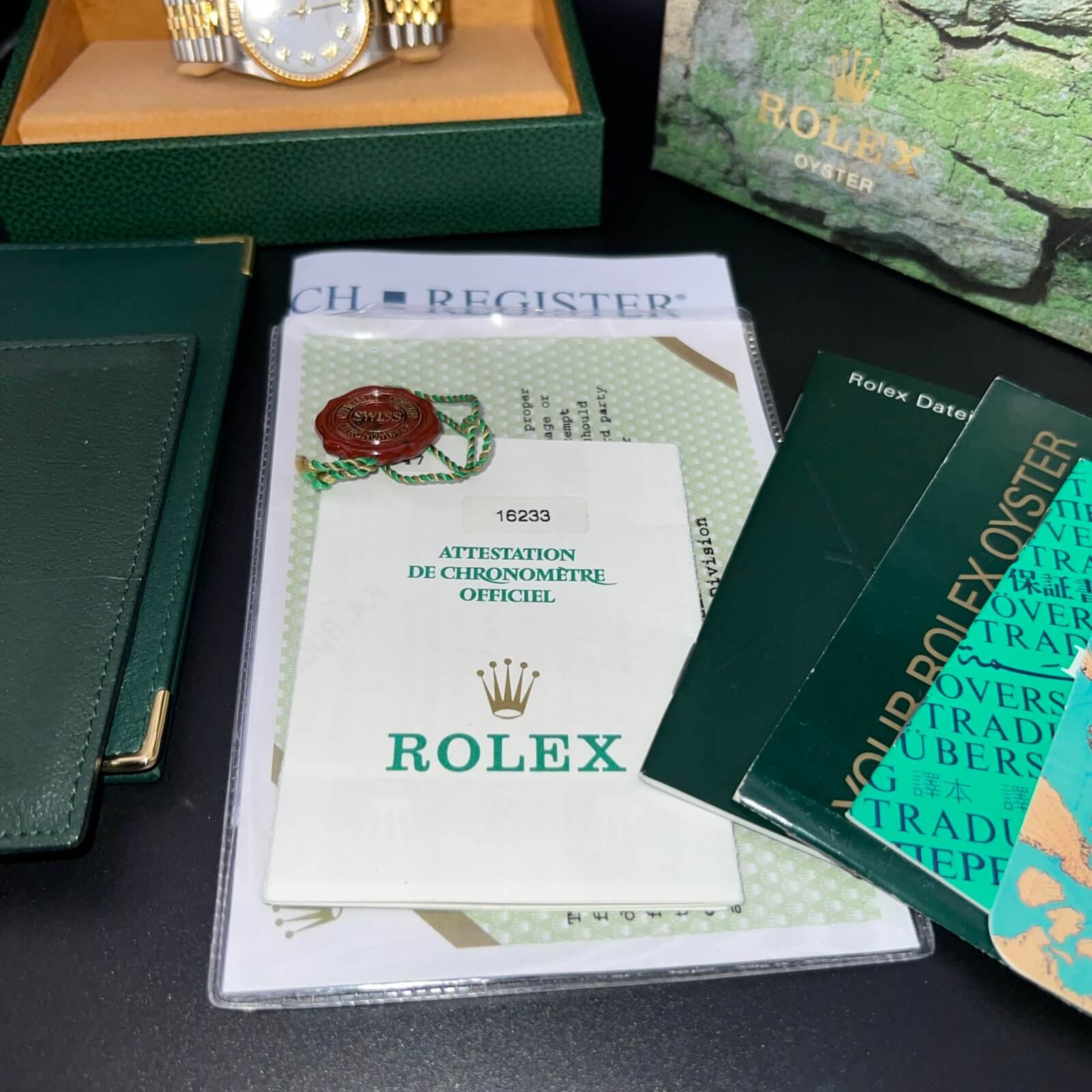 It comes complete with what you see in the pictures. Rolex boxes, papers , calendar, wallets, tag, booklets and watch register certificate.