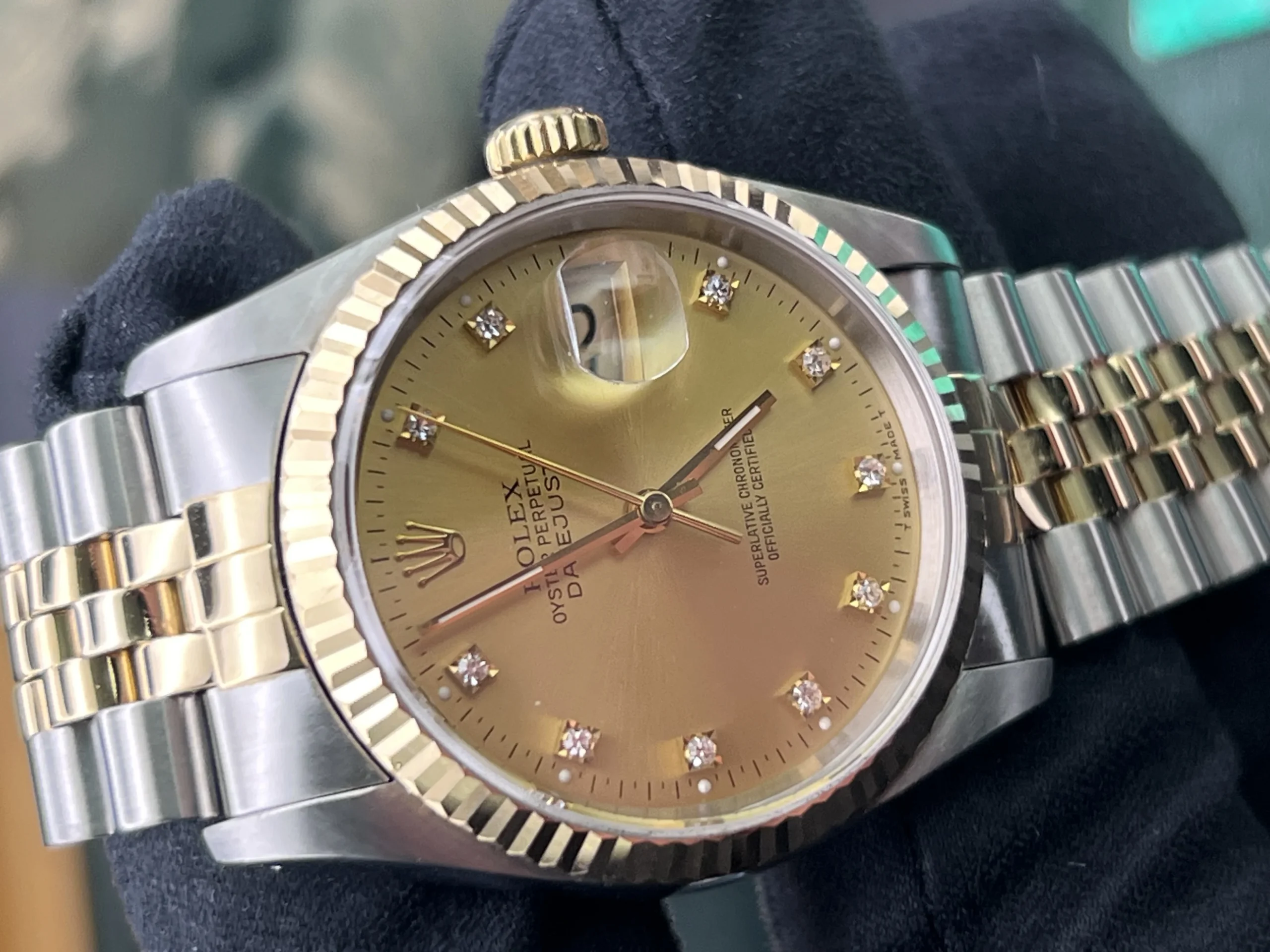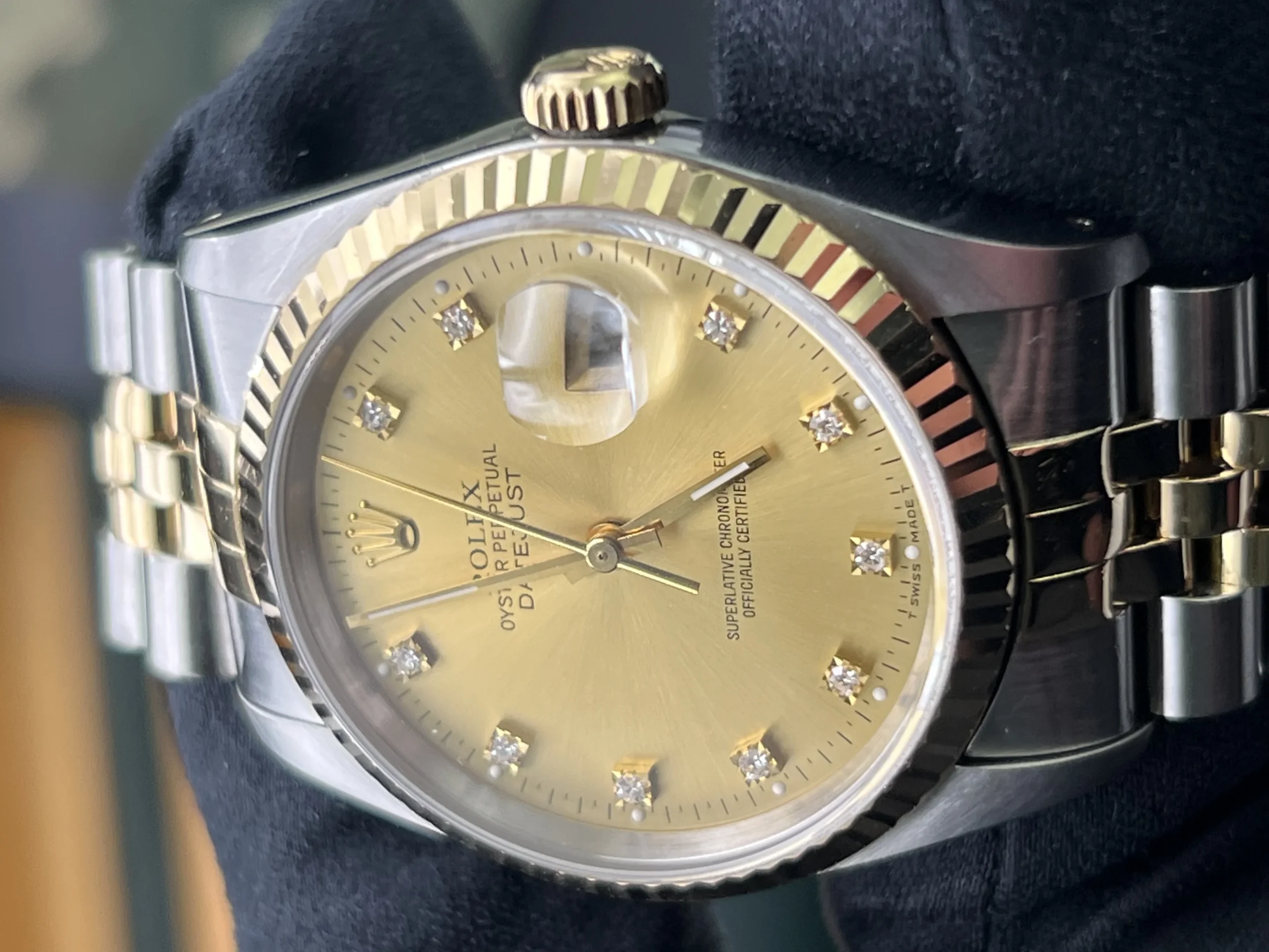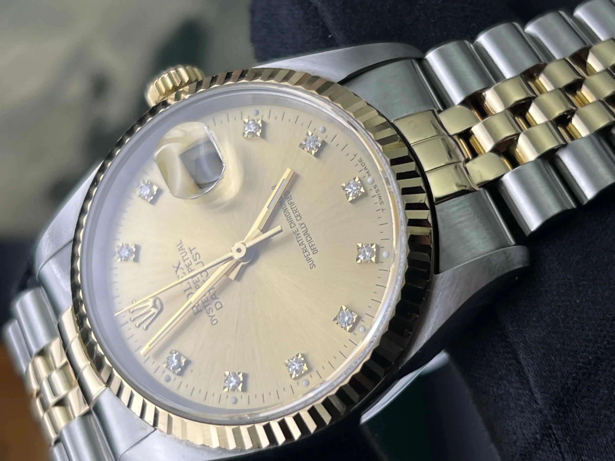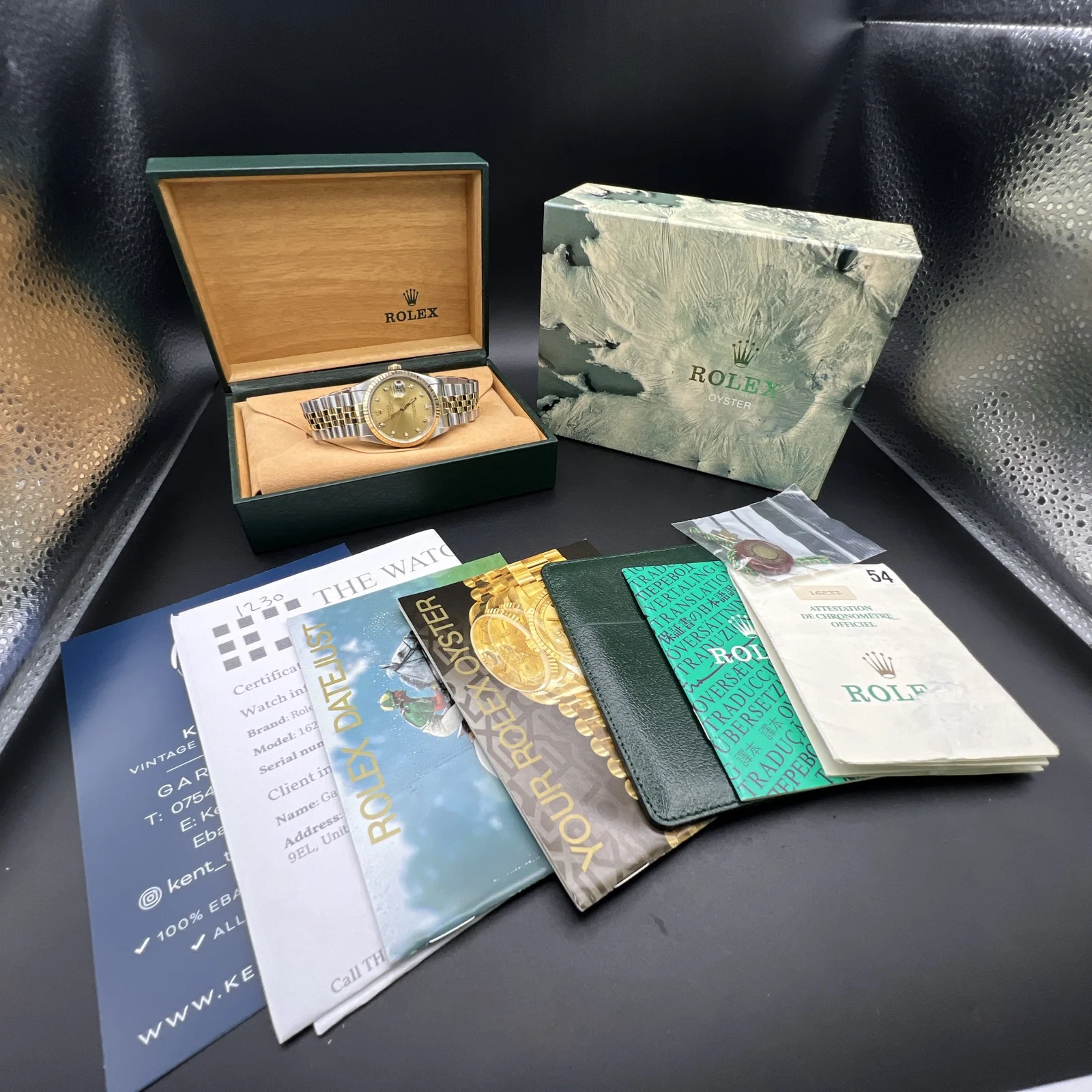 | Stunning Rolex Datejust 16233 from 1994. The watch is presented in very nice condition., keeping time and operating as it should. It has been inspected by our watchmaker prior to listing. There are light marks from use , nothing you wouldn’t expect from a watch of this period. It retains its original case back sticker and the bracelet hasn’t much stretch . The diamond dial is stunning. It comes complete with what you see in the pictures. Rolex boxes, papers, tag, booklets and watch register certificate. |