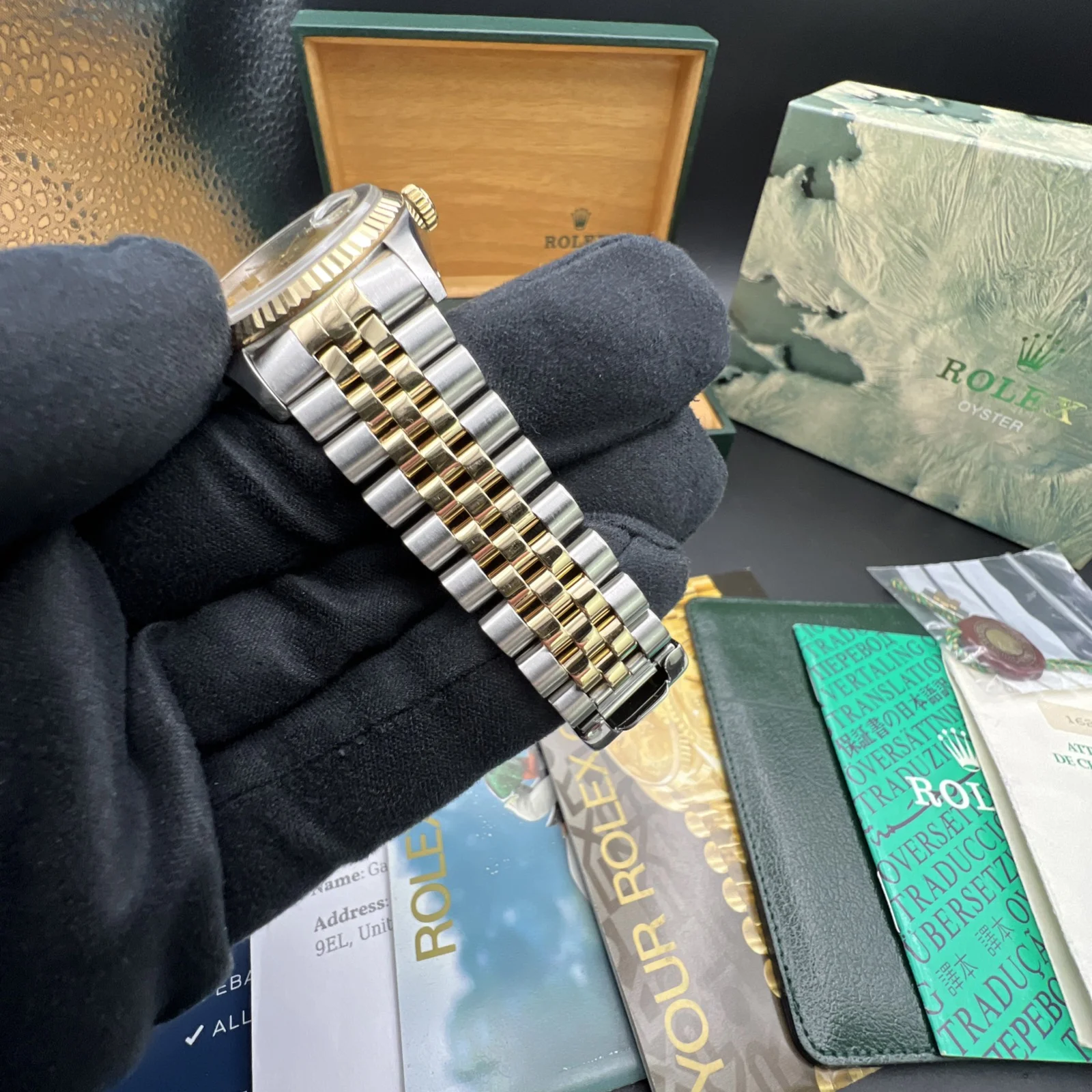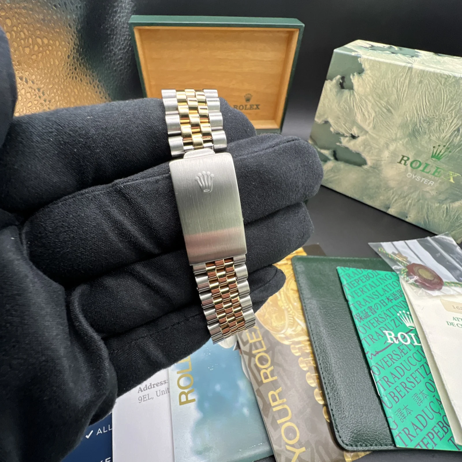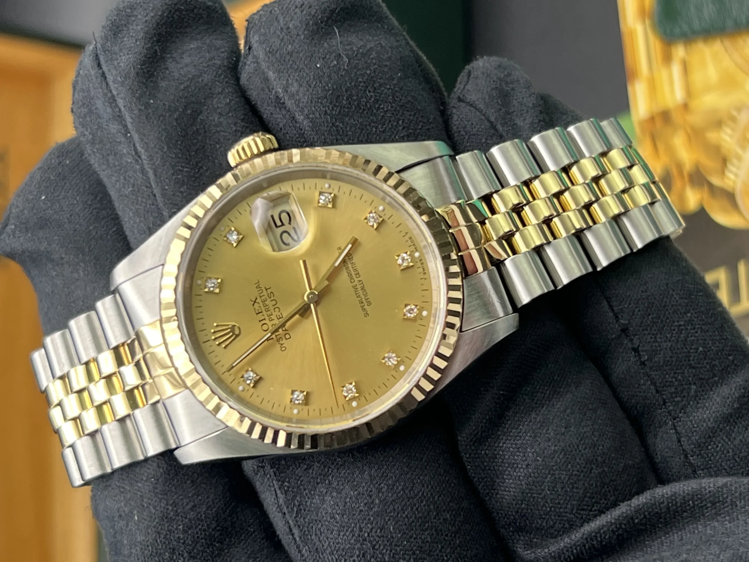 | Stunning Rolex Datejust 16233 from 1994. The watch is presented in very nice condition., keeping time and operating as it should. It has been inspected by our watchmaker prior to listing. There are light marks from use , nothing you wouldn’t expect from a watch of this period. It retains its original case back sticker and the bracelet hasn’t much stretch . The diamond dial is stunning. It comes complete with what you see in the pictures. Rolex boxes, papers, tag, booklets and watch register certificate. |
