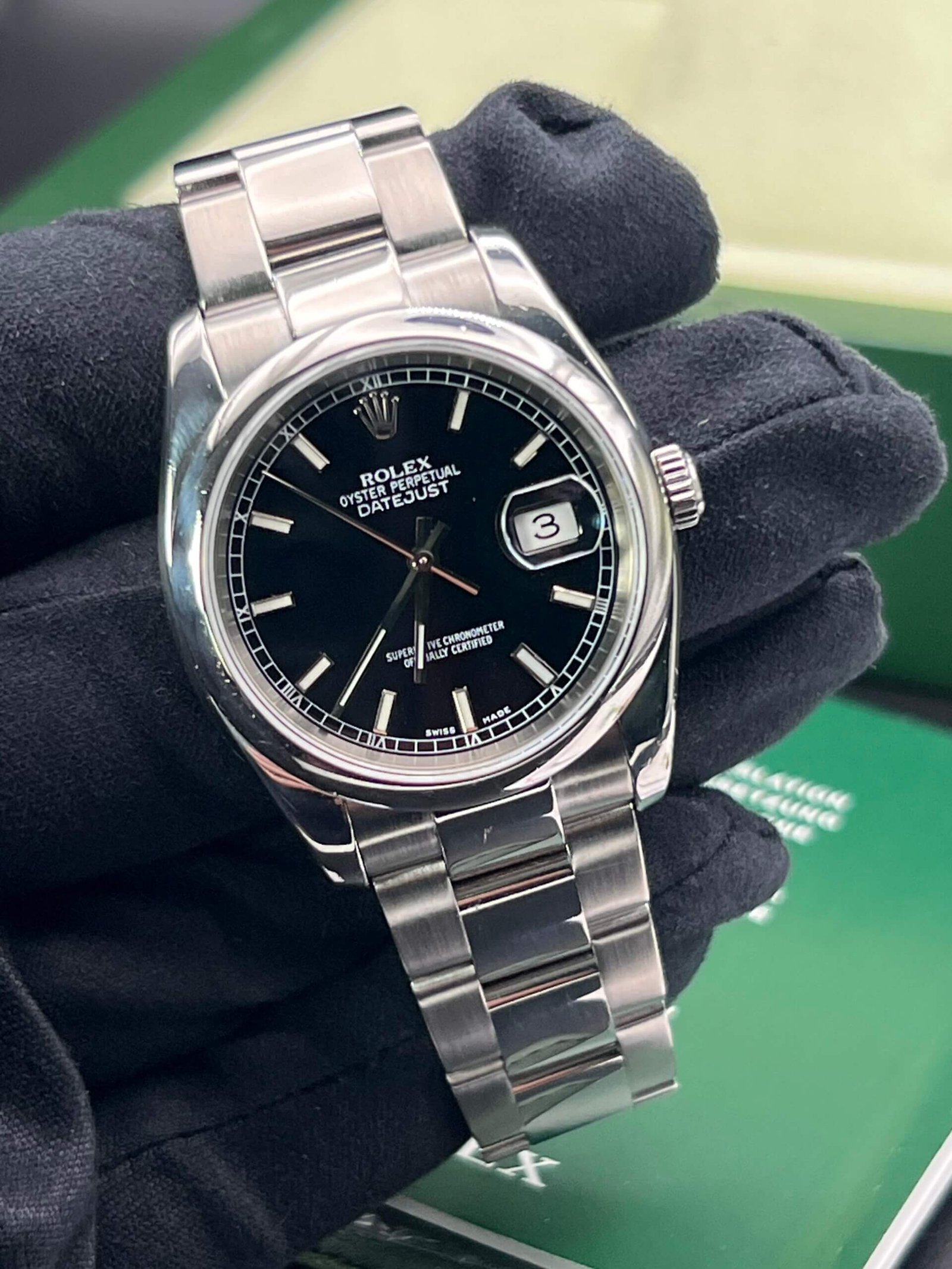 -Factory black baton dial.