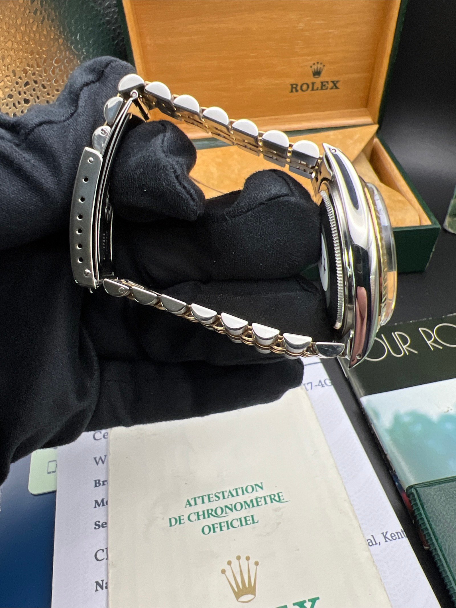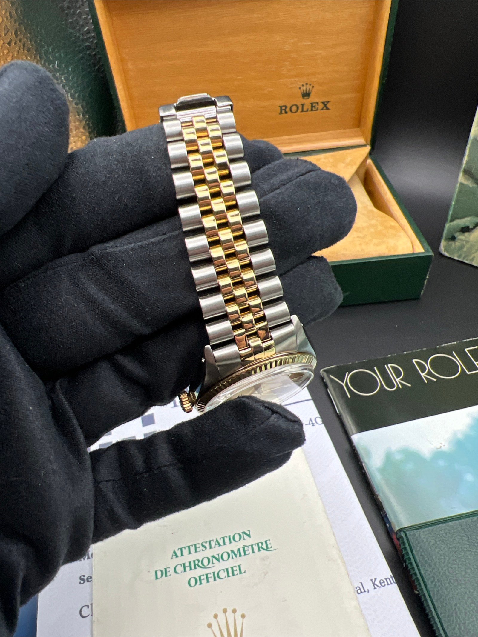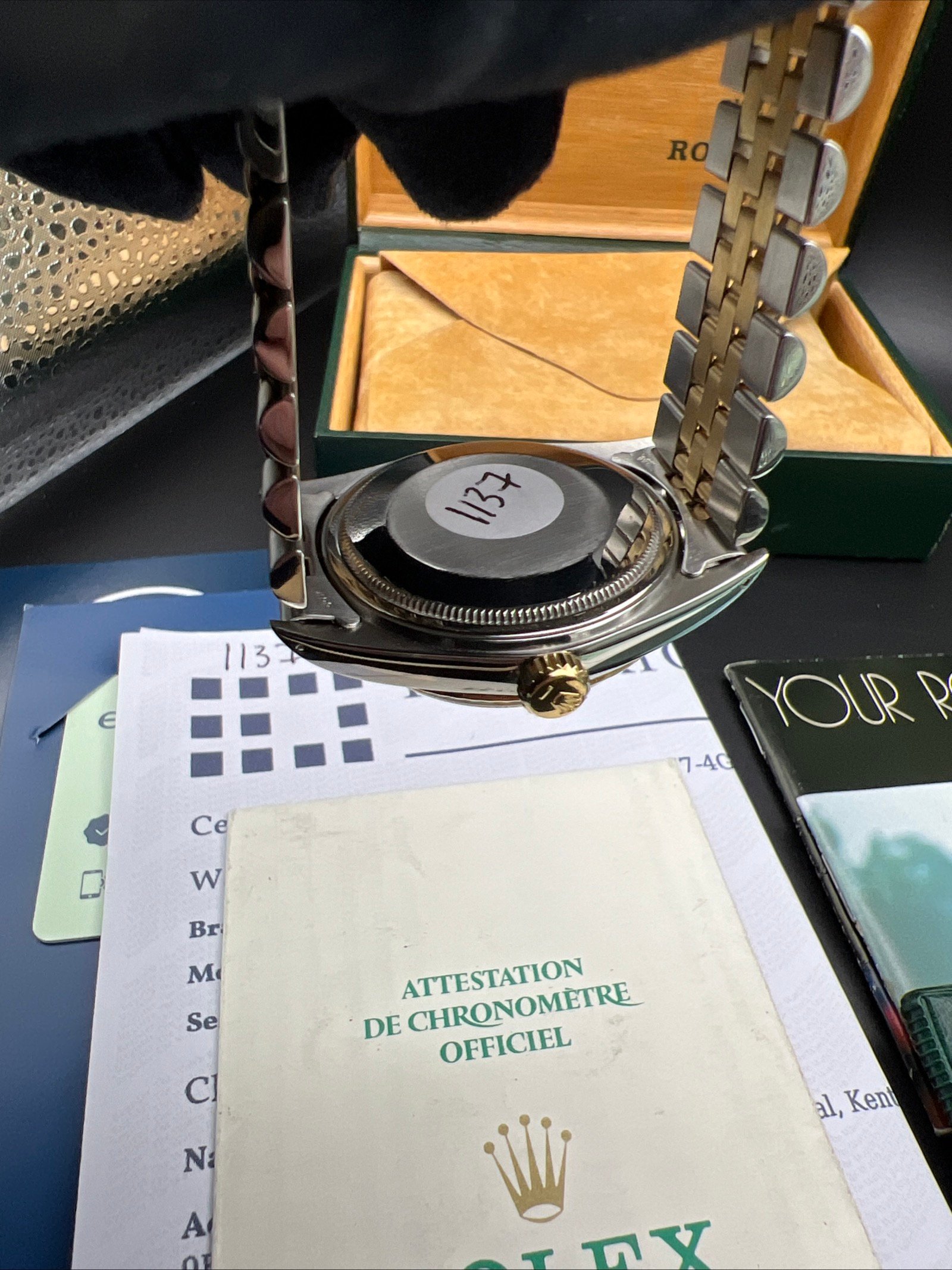 | Rolex Datejust 36 mm golden stainless steel automatic wristwatch. This is the reference 16013 and was first sold in 1984. The watch comes with its original box and papers, including accessories . Also included are two Rolex service documents., and the Watch register certificate. The Watches in good condition given its year and is keeping Time . It’s operating as it should and has been inspected by our watchmaker prior to listening.. Please see our feedback our other listings and the photos . |
