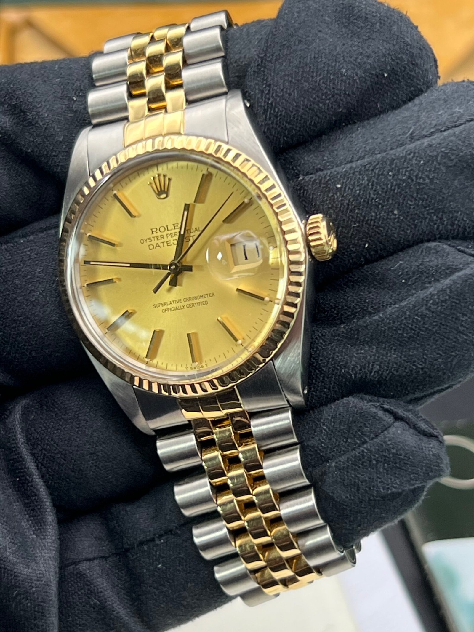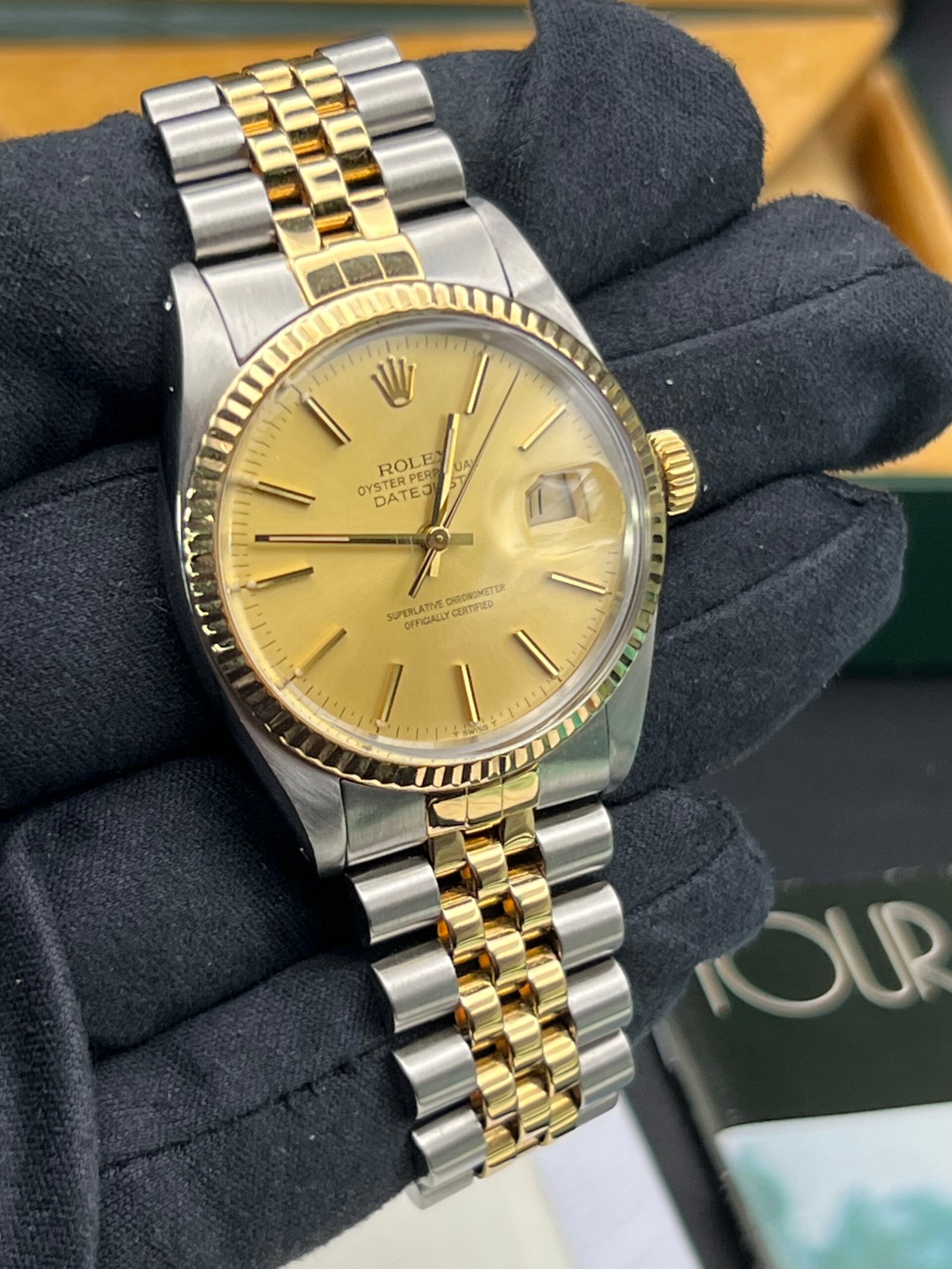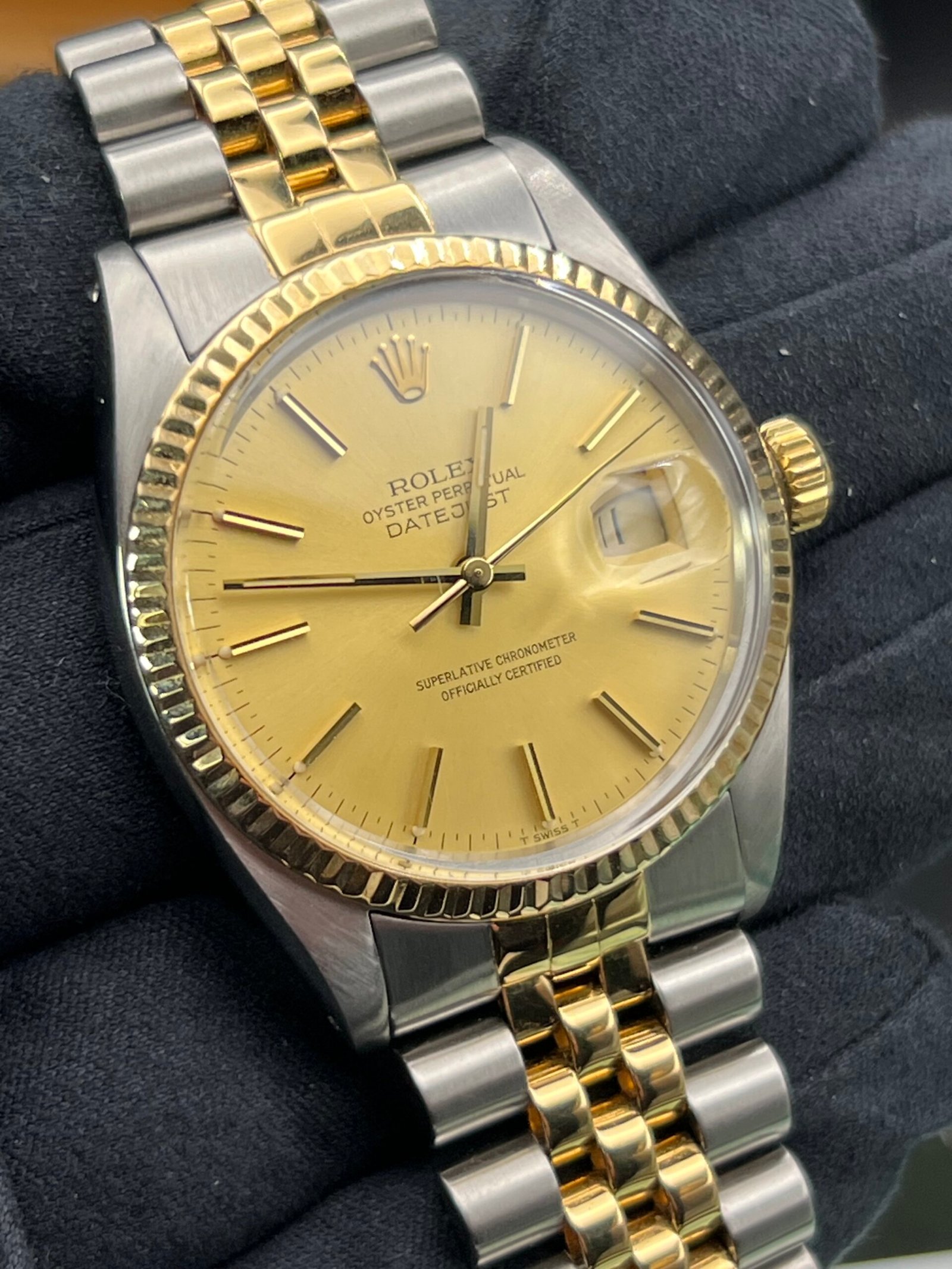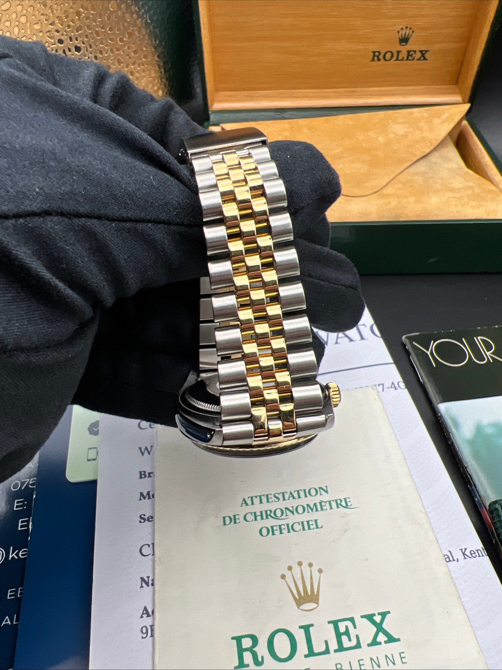 | Rolex Datejust 36 mm golden stainless steel automatic wristwatch. This is the reference 16013 and was first sold in 1984. The watch comes with its original box and papers, including accessories . Also included are two Rolex service documents., and the Watch register certificate. The Watches in good condition given its year and is keeping Time . It’s operating as it should and has been inspected by our watchmaker prior to listening.. Please see our feedback our other listings and the photos . |