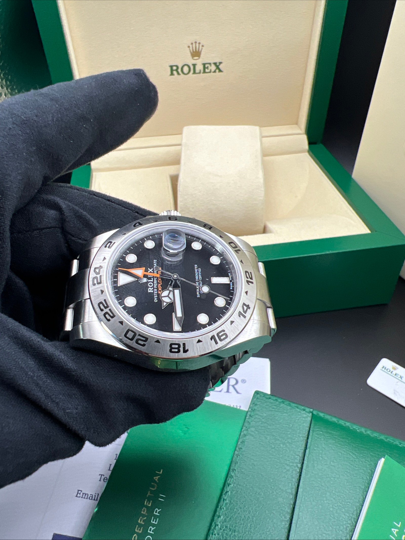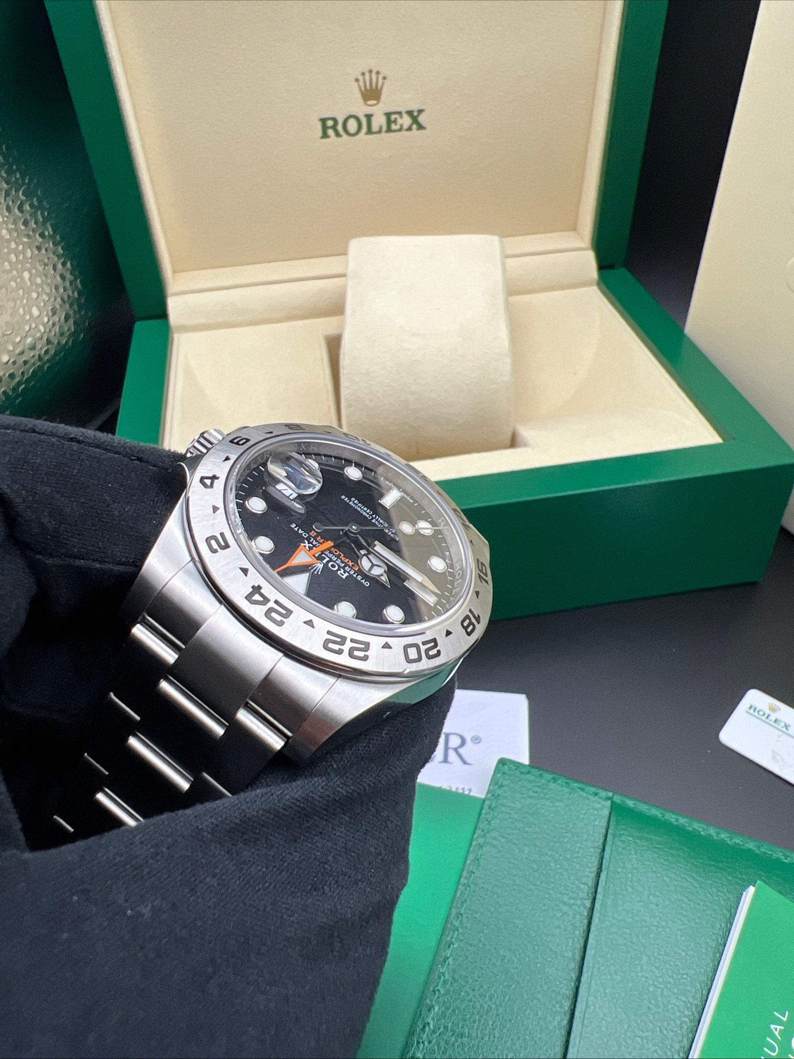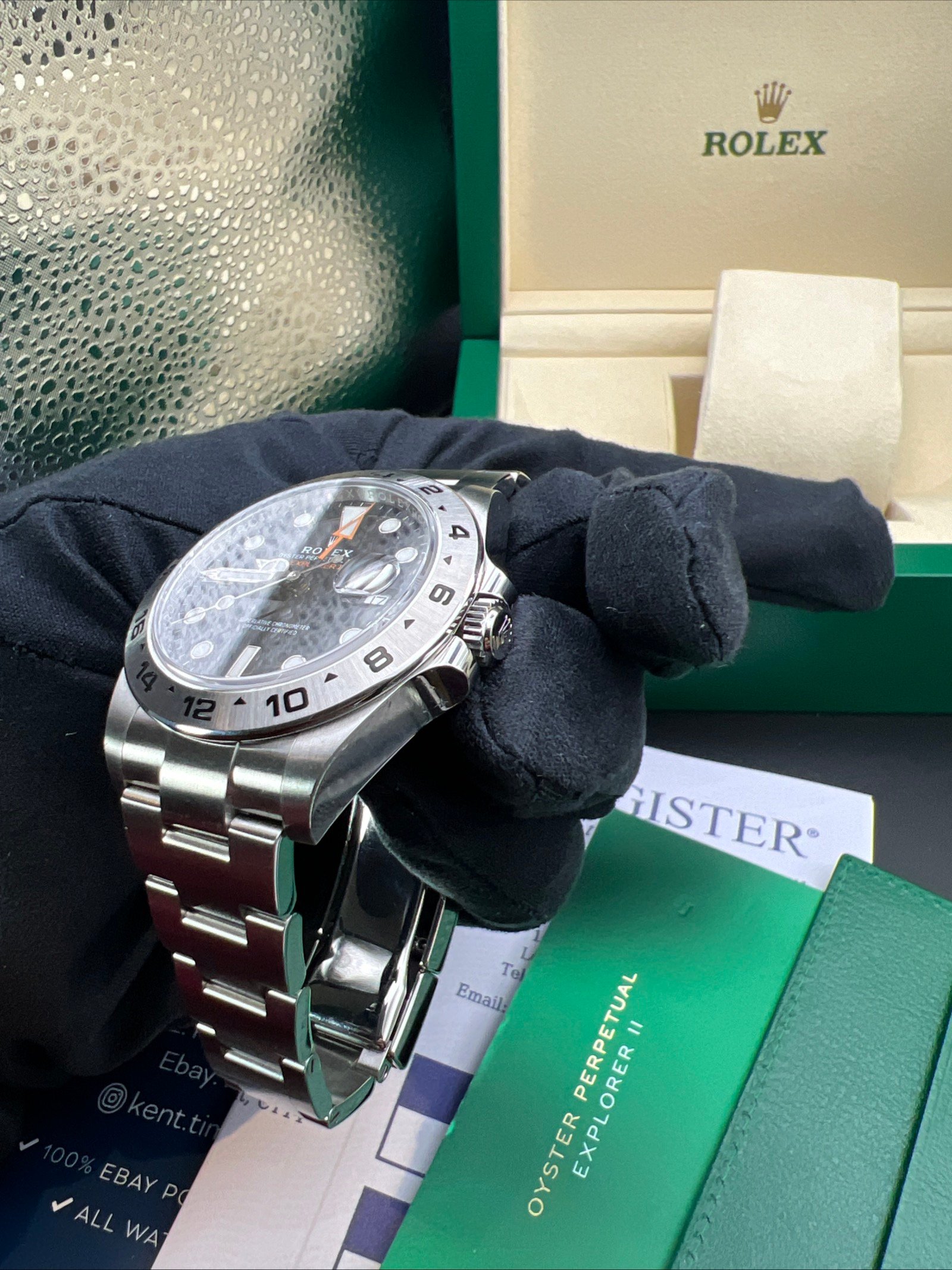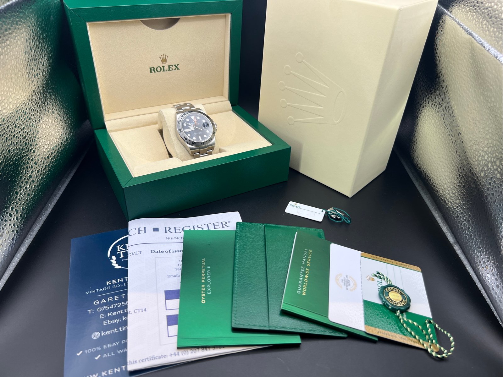 | Rolex Explorer II REFERENCE 116570 42 MM GMT WATCH. The watch was first sold in 2019 and comes as a full set presented in original Rolex box with warranty card, both tags, spare linkS,booklets and wallet. It also comes with Watch register certificate included. Watch is in very good overall condition with only the odd mark as evidence of use. The watch is running well as you can see from the time graph photos. Please see our feedback, the photos and our other listings. |