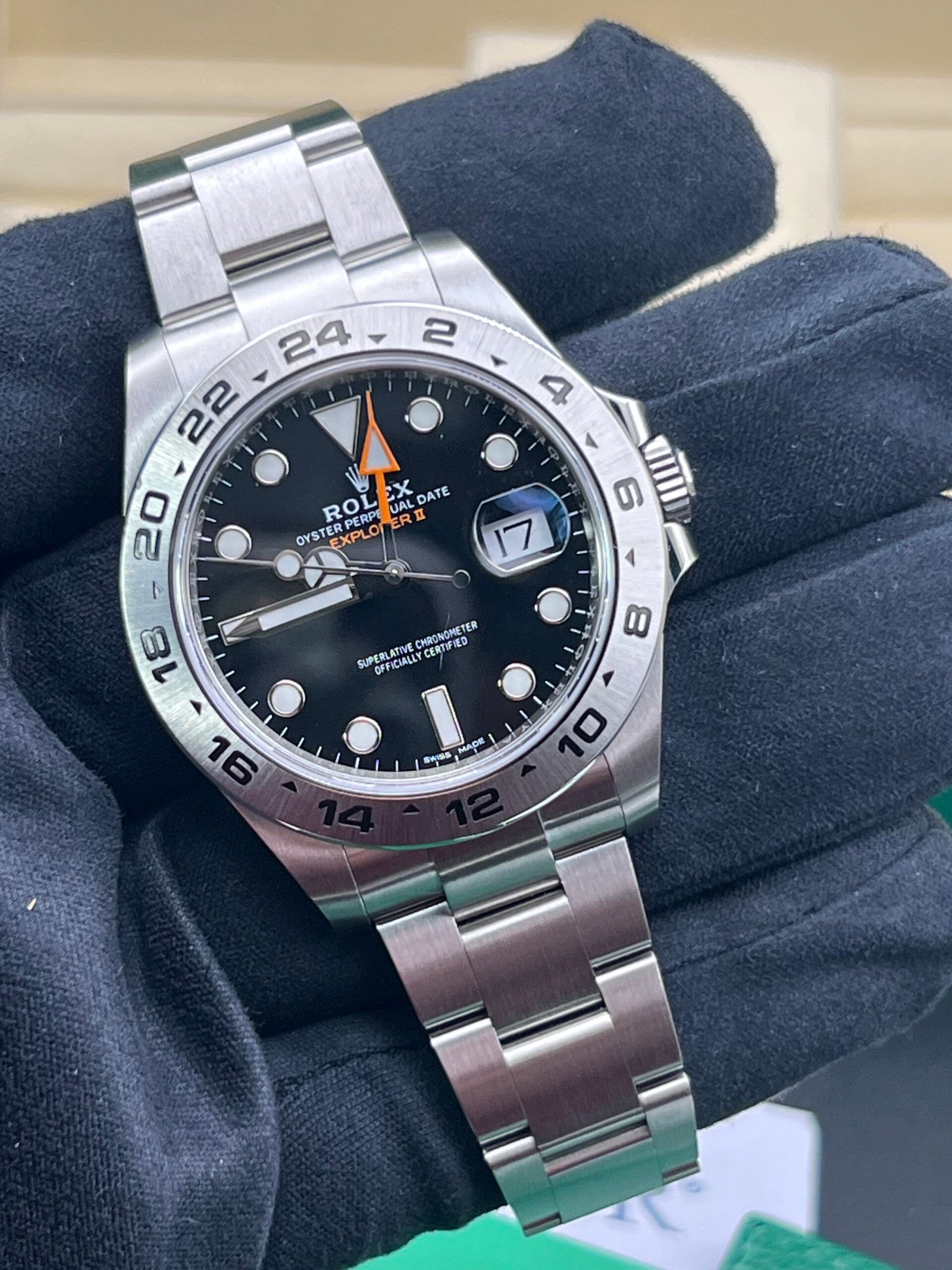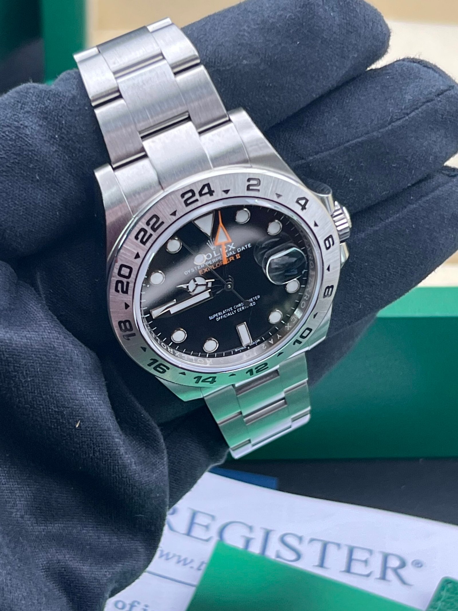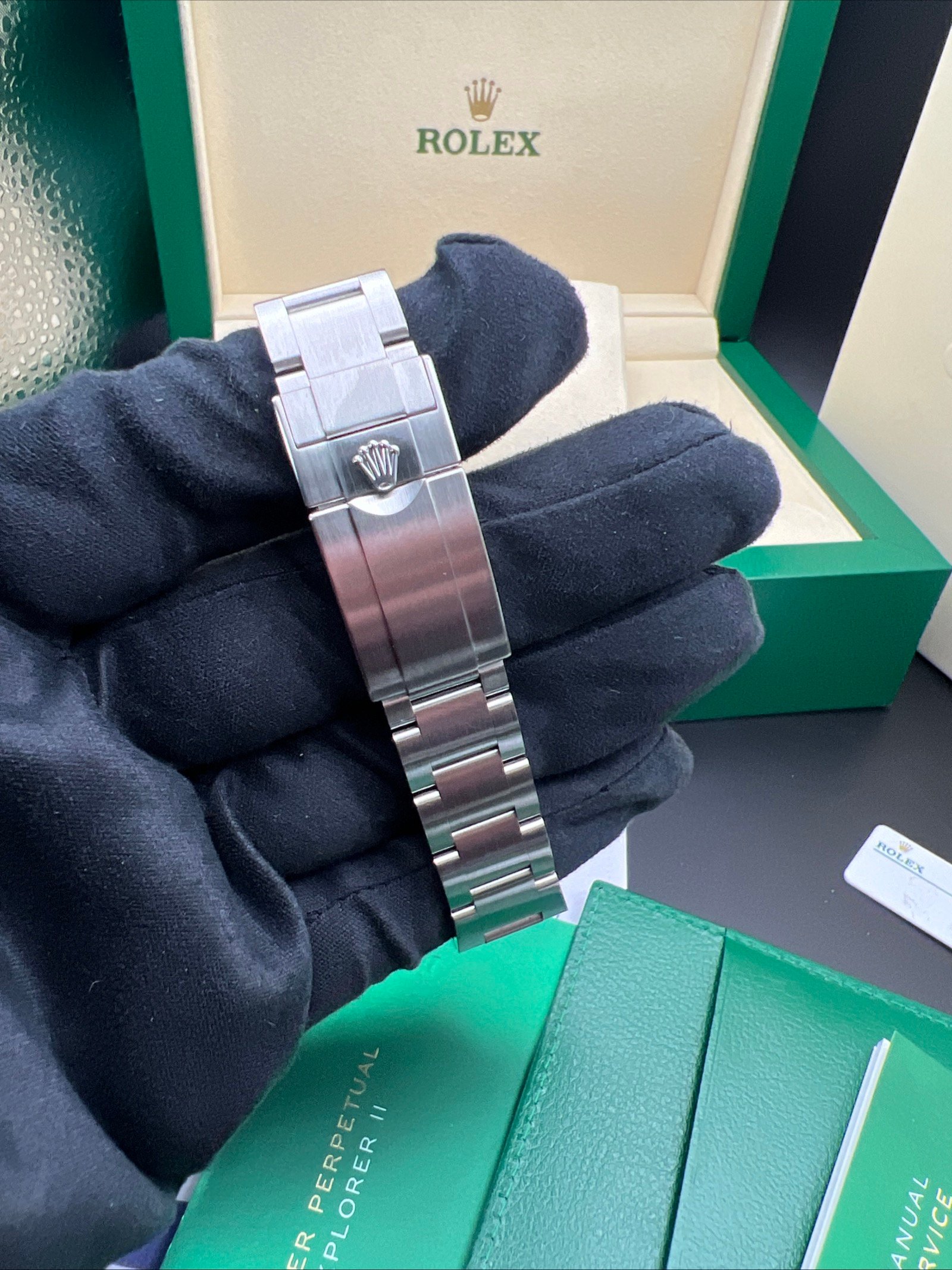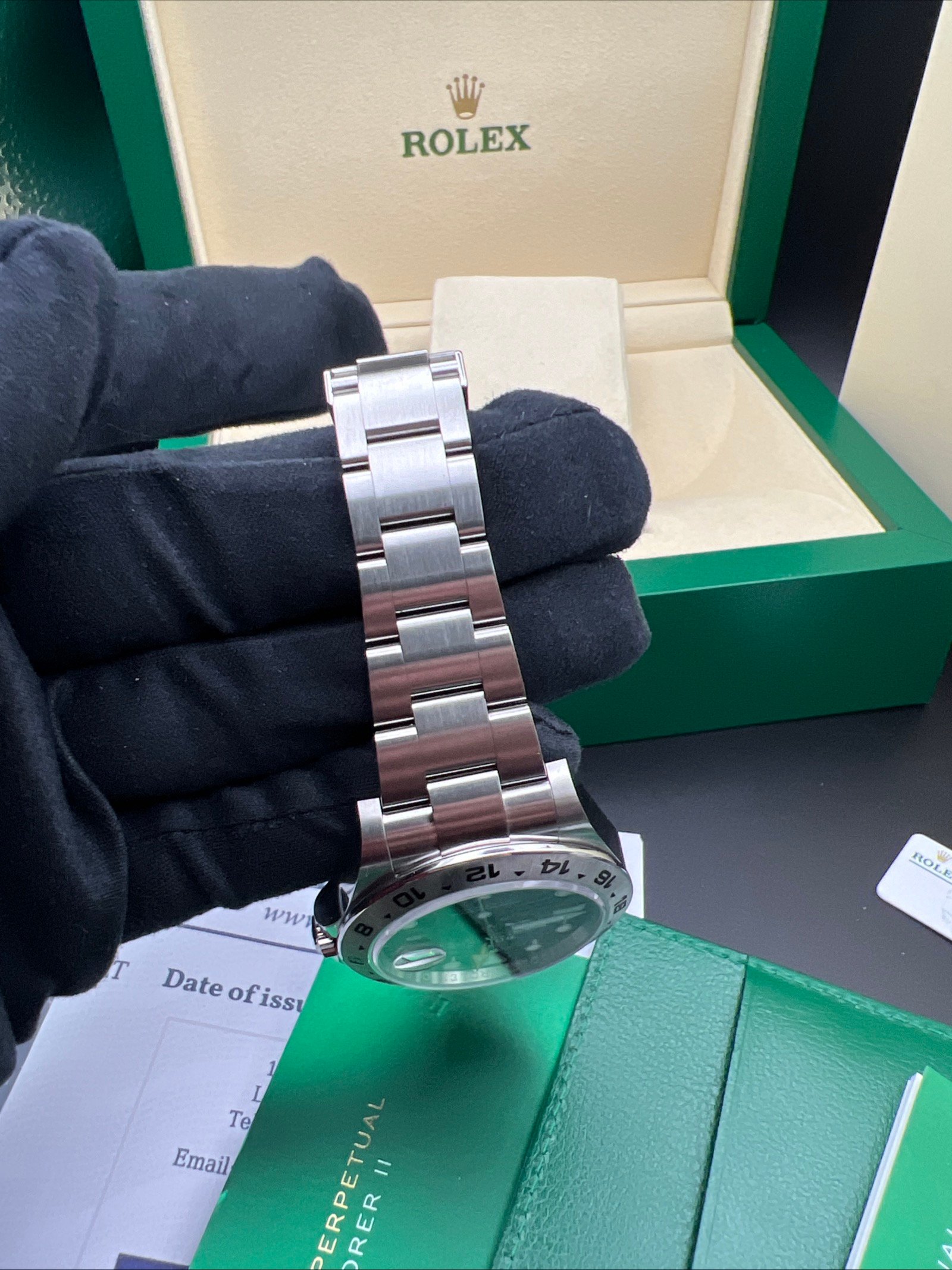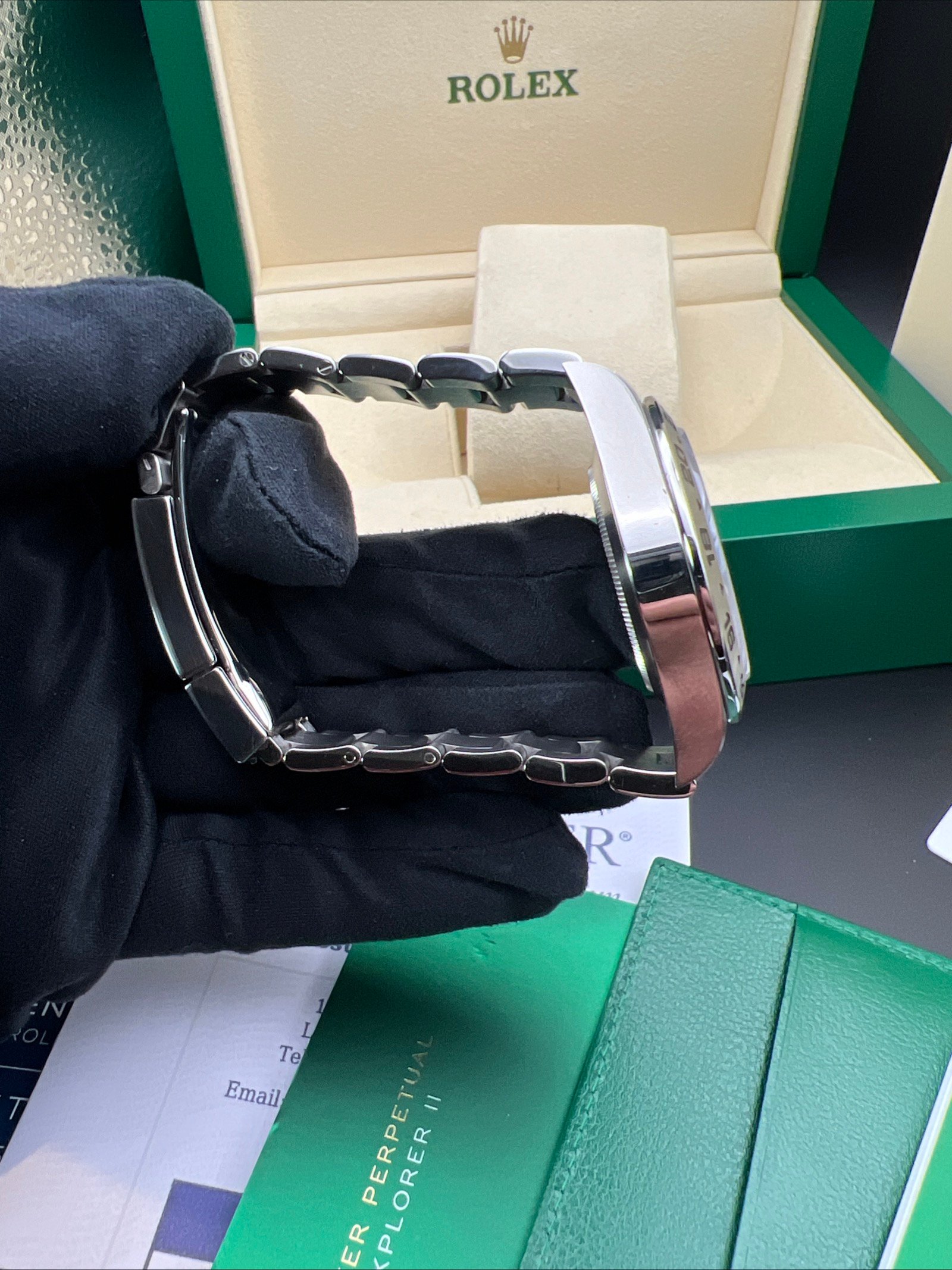 | Rolex Explorer II REFERENCE 116570 42 MM GMT WATCH. The watch was first sold in 2019 and comes as a full set presented in original Rolex box with warranty card, both tags, spare linkS,booklets and wallet. It also comes with Watch register certificate included. Watch is in very good overall condition with only the odd mark as evidence of use. The watch is running well as you can see from the time graph photos. Please see our feedback, the photos and our other listings. |
