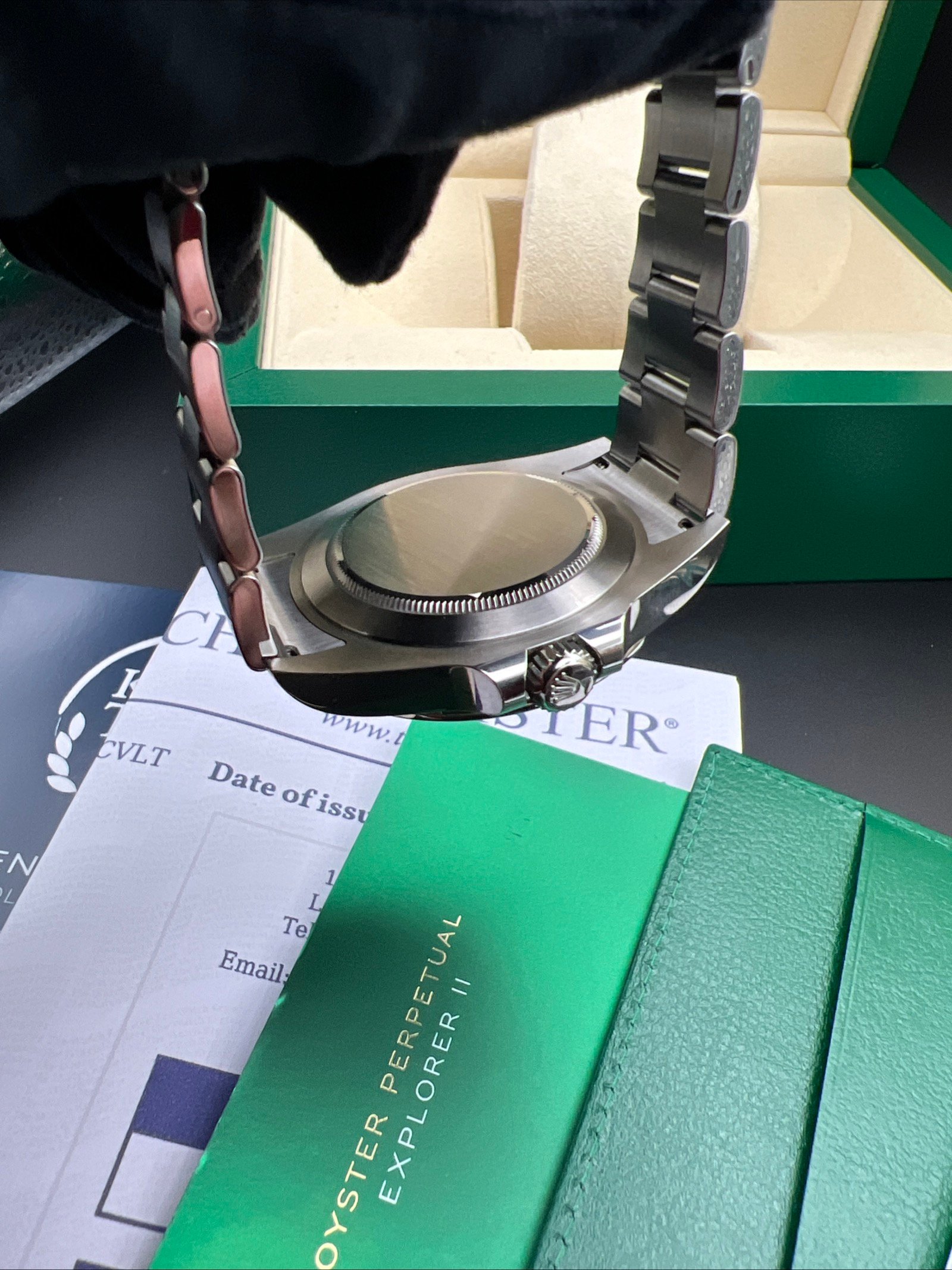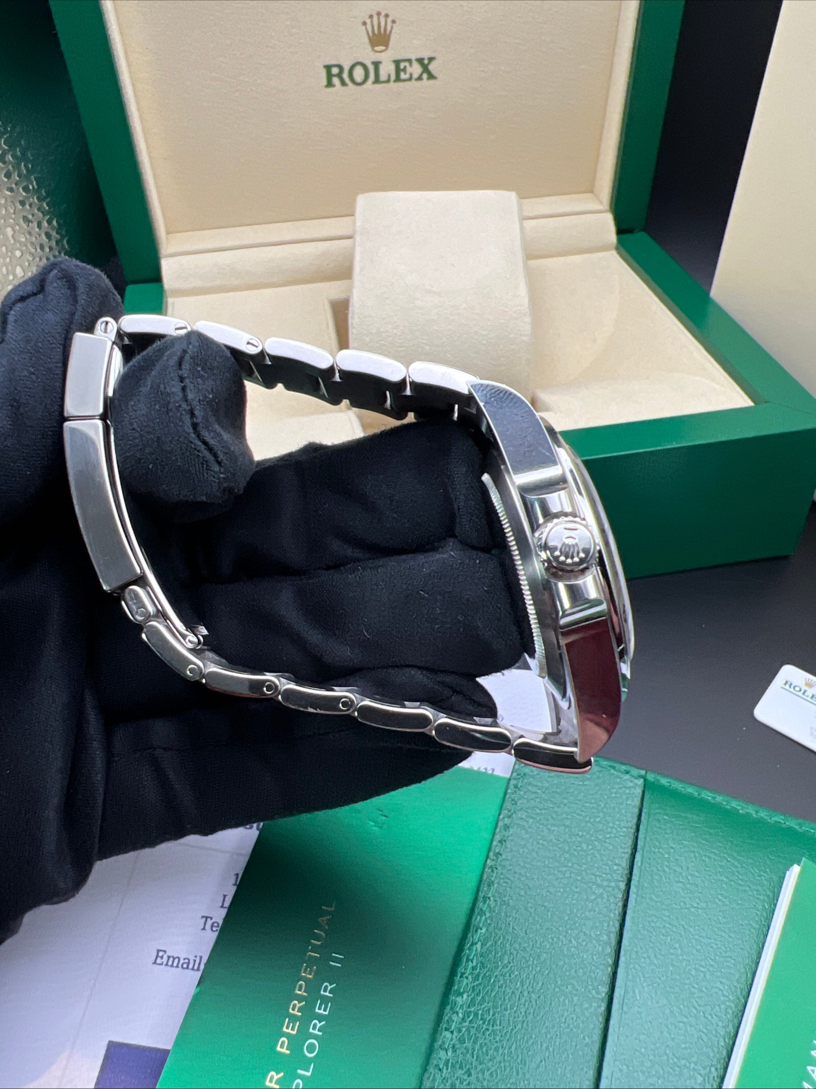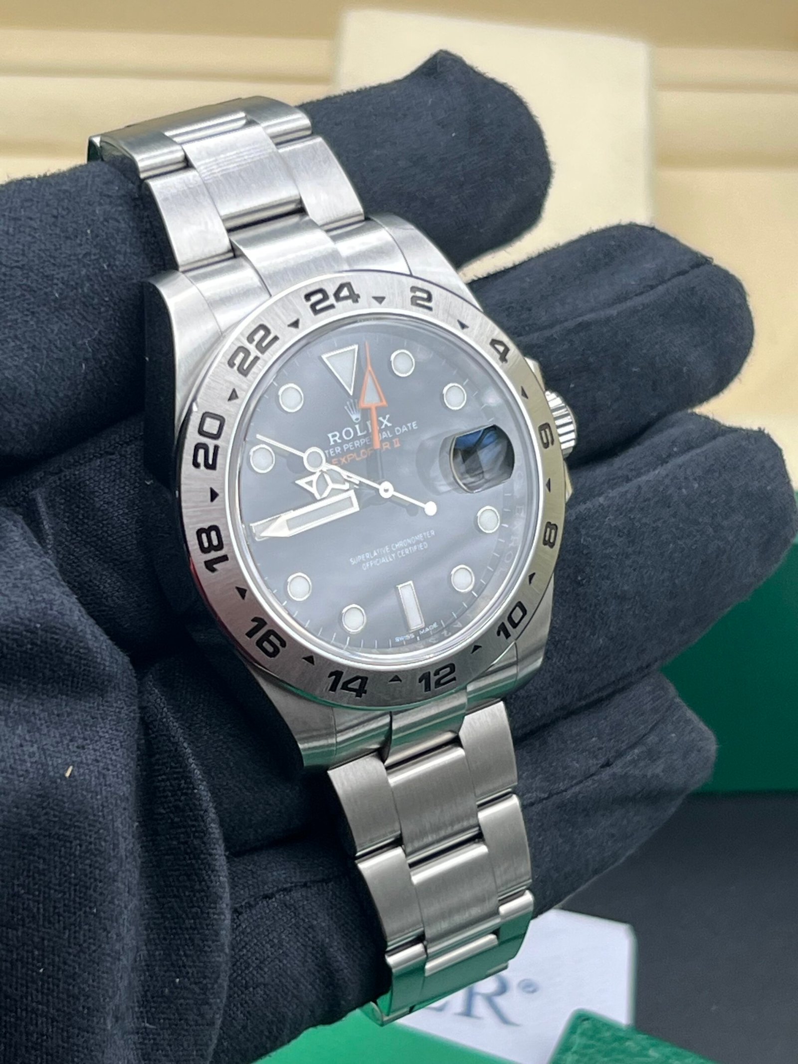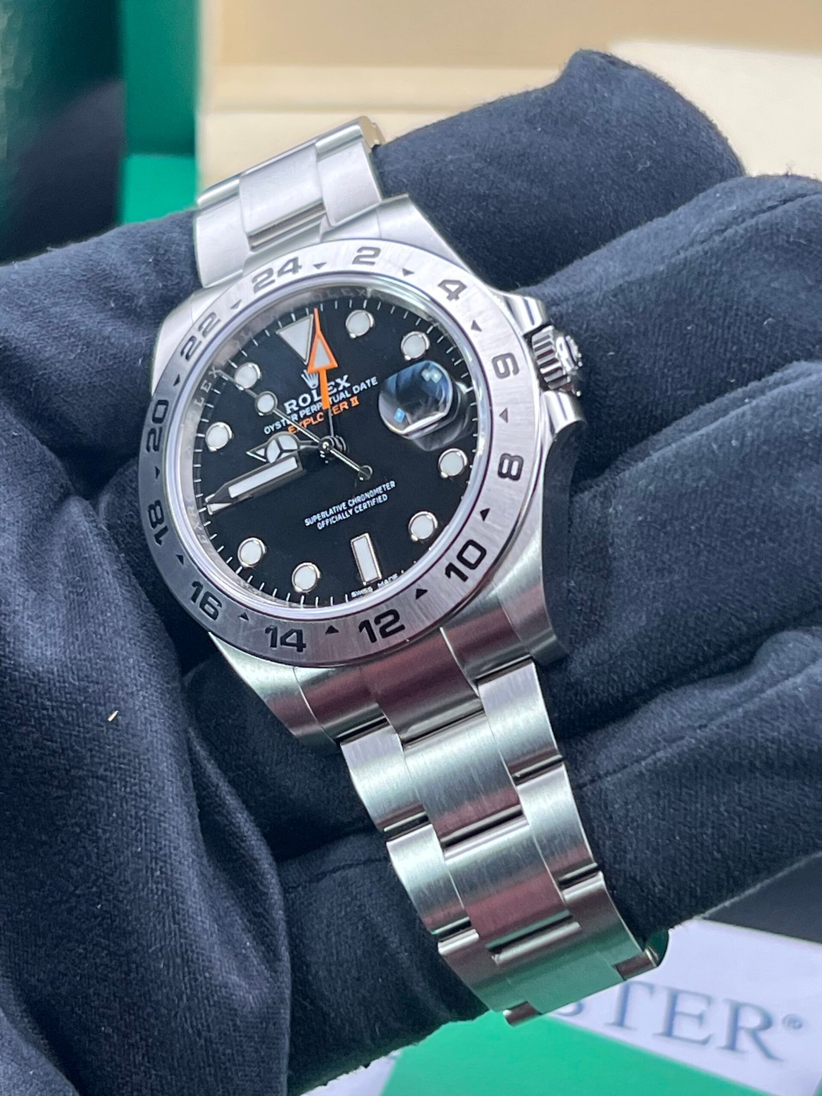 | Rolex Explorer II REFERENCE 116570 42 MM GMT WATCH. The watch was first sold in 2019 and comes as a full set presented in original Rolex box with warranty card, both tags, spare linkS,booklets and wallet. It also comes with Watch register certificate included. Watch is in very good overall condition with only the odd mark as evidence of use. The watch is running well as you can see from the time graph photos. Please see our feedback, the photos and our other listings. |