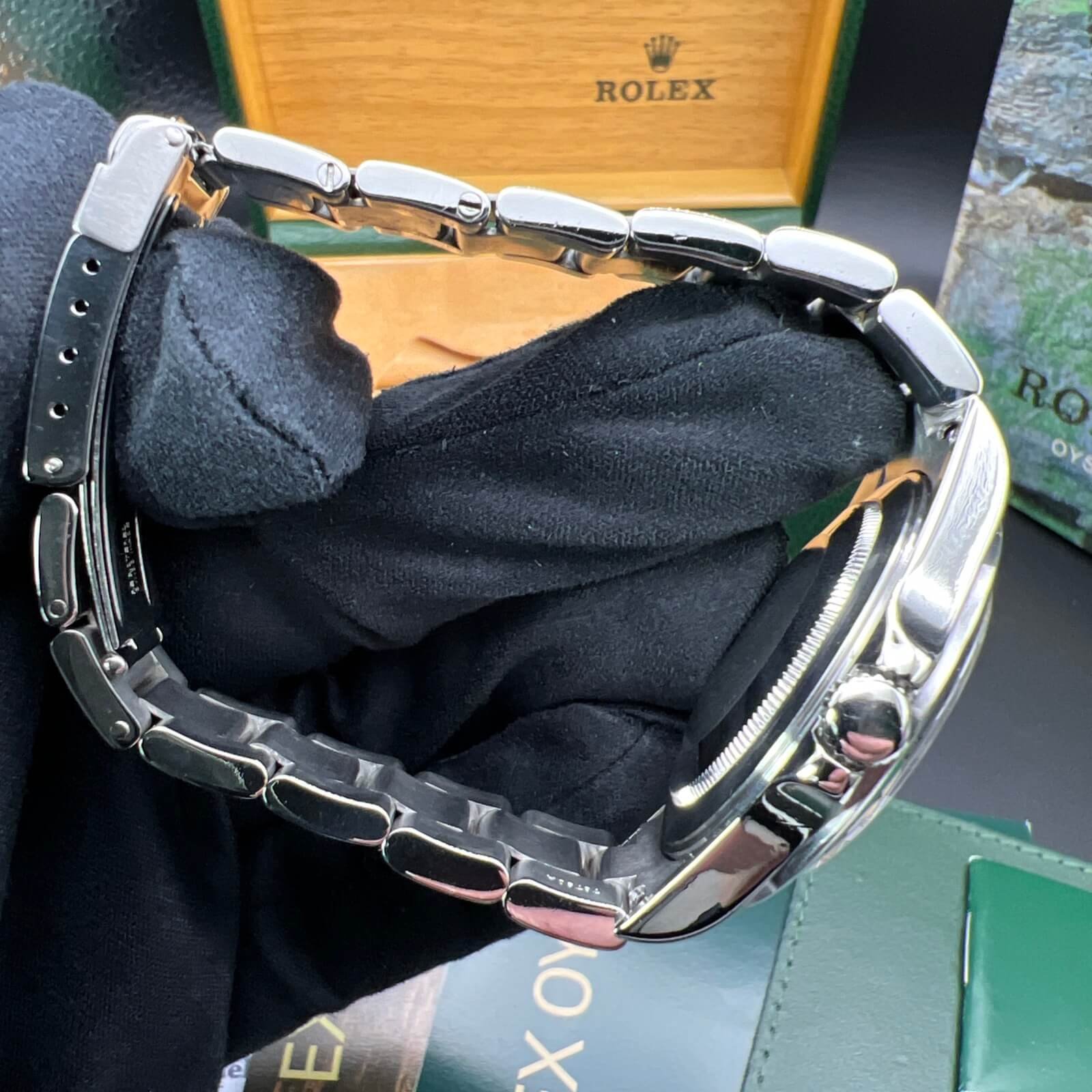 The watch is in good condition and is running well. It has been inspected by our watchmaker prior to listing. The Watch does have minor marks from being used as you’d expect a 20-year-old piece.