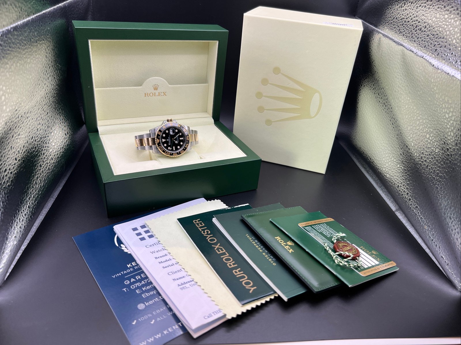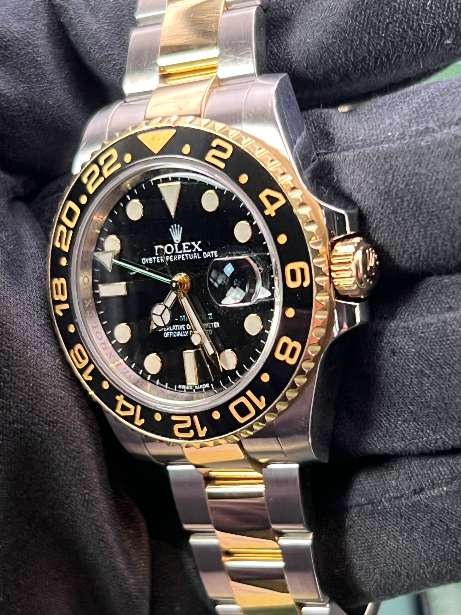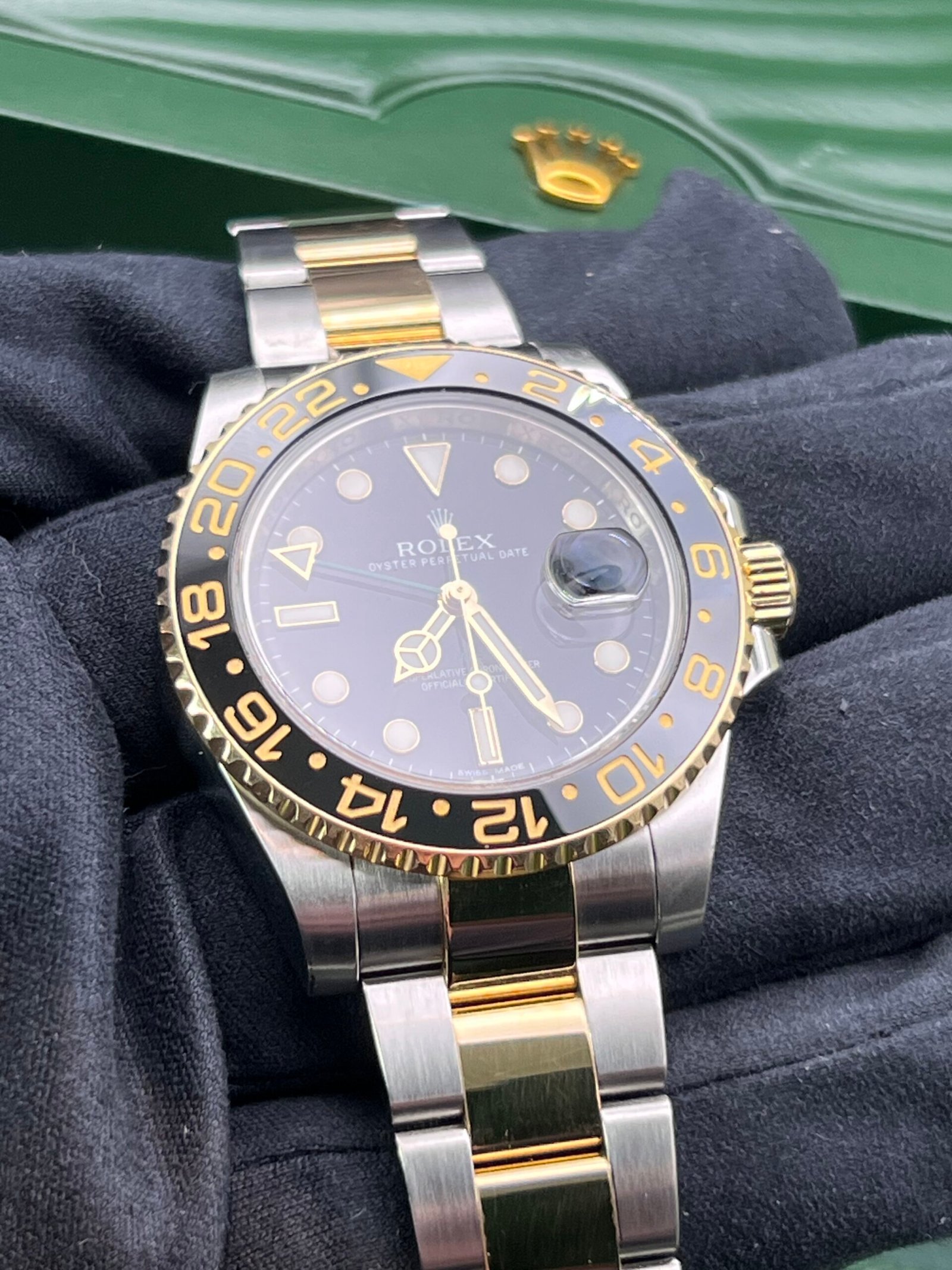 | Rolex Gmt Master II Watch reference 116713LN. This is the 40 mm case size predecessor to the modern root beer. The watch was originally sold in 2011 and comes with this original boxes, paper and accessories. You will also receive a Watch register certificate and Ebay’s authentication guarantee card. Watch is a very good condition for its year showing only a few light marks as evidence of wear. The bezel and glass are in very good condition. I watch has been inspected prior to listing and the Time graph picture shows how it’s running . Please see our other items, our feedback and all the photos and detail details |