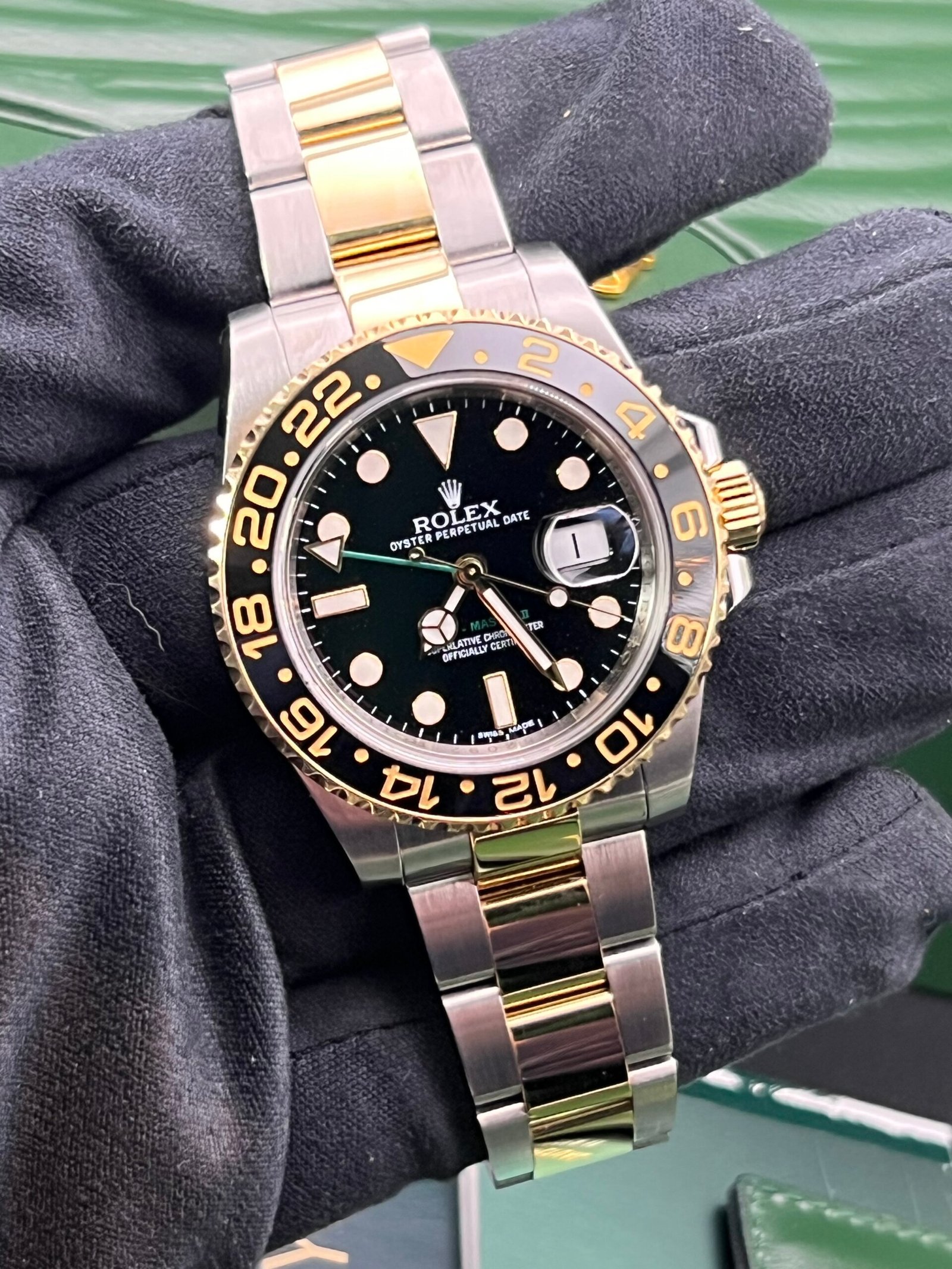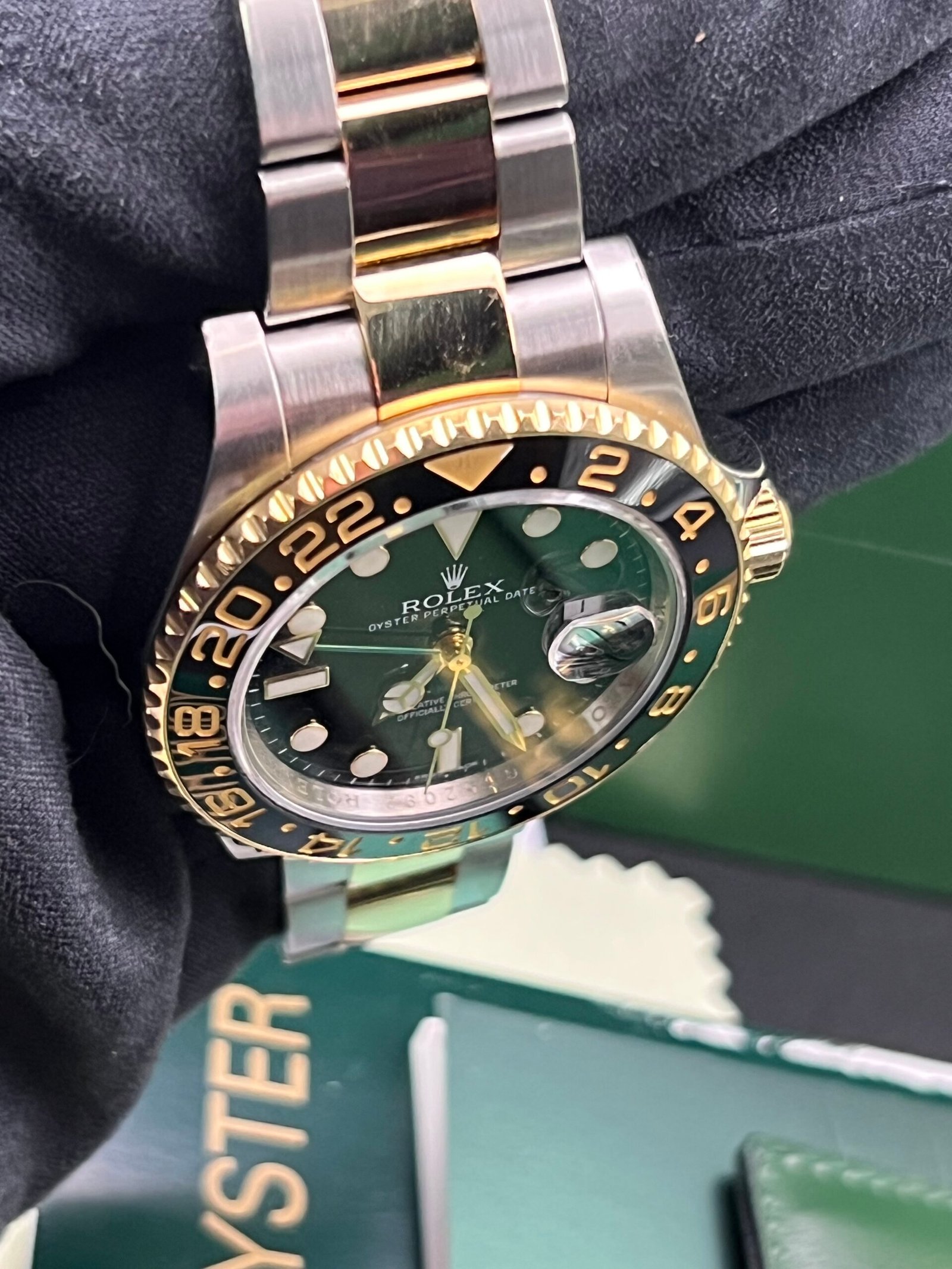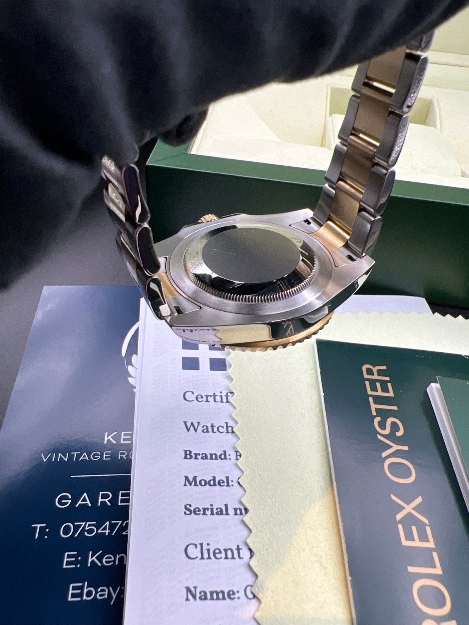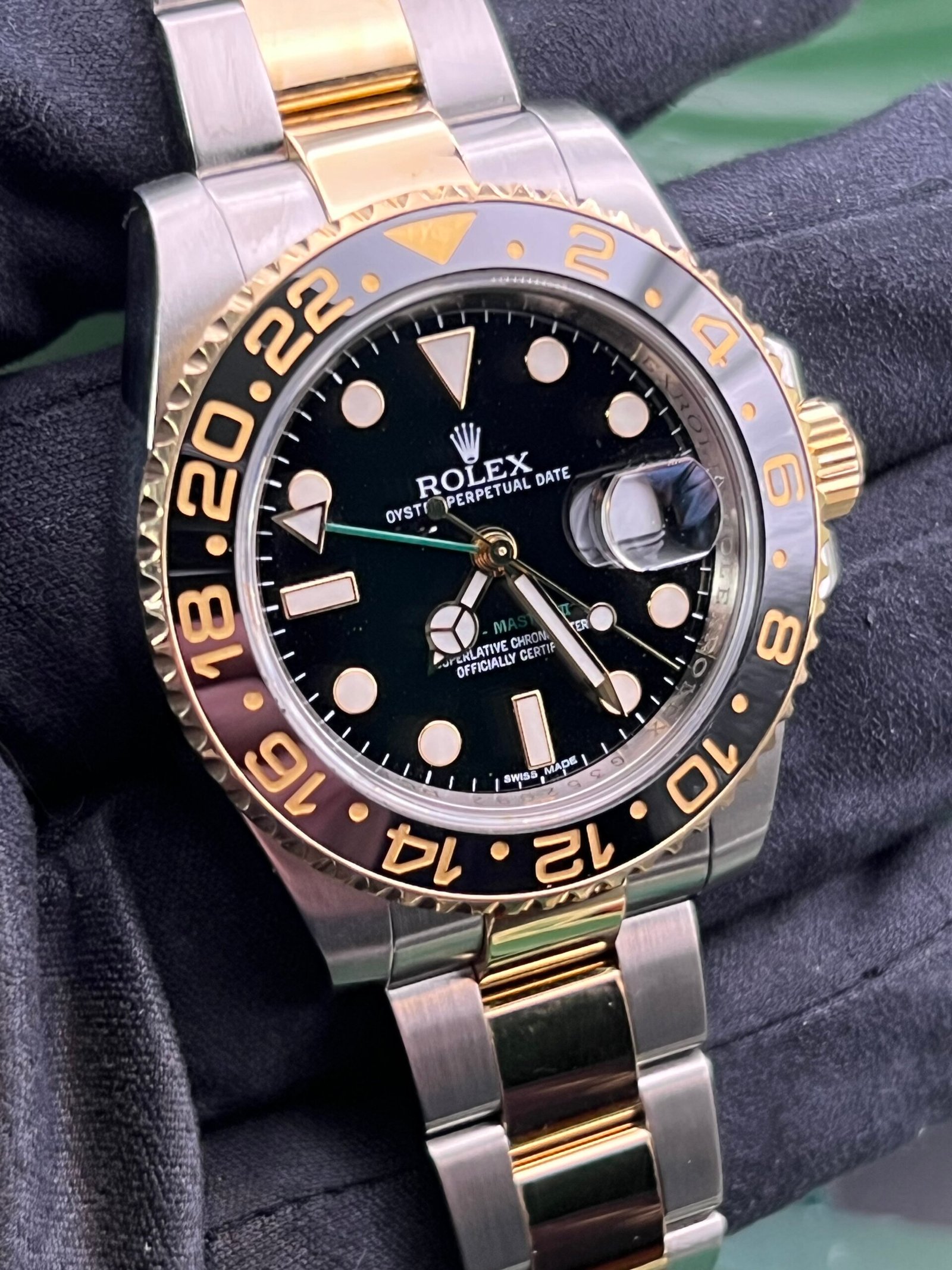 | Rolex Gmt Master II Watch reference 116713LN. This is the 40 mm case size predecessor to the modern root beer. The watch was originally sold in 2011 and comes with this original boxes, paper and accessories. You will also receive a Watch register certificate and Ebay’s authentication guarantee card. Watch is a very good condition for its year showing only a few light marks as evidence of wear. The bezel and glass are in very good condition. I watch has been inspected prior to listing and the Time graph picture shows how it’s running . Please see our other items, our feedback and all the photos and detail details |