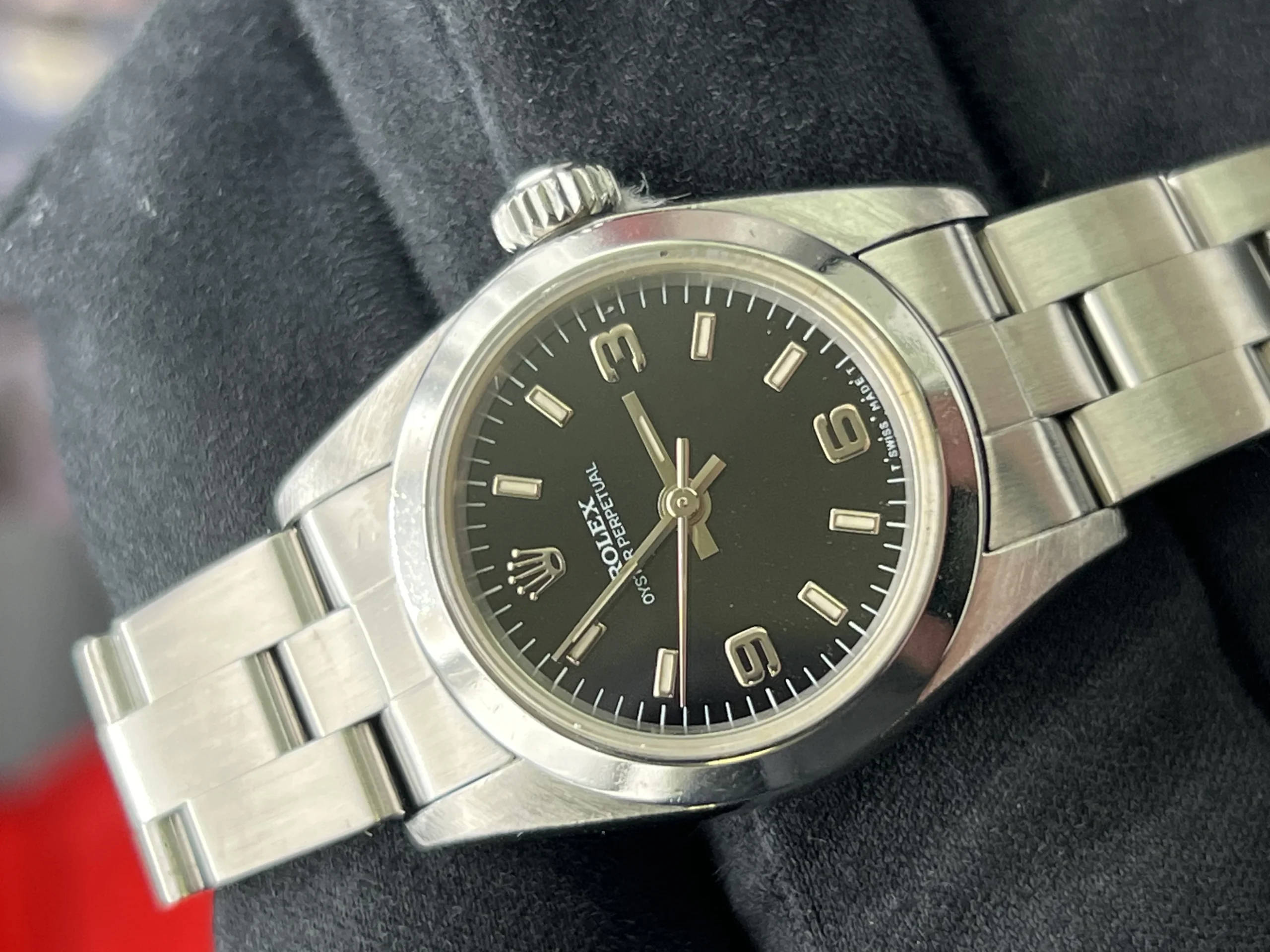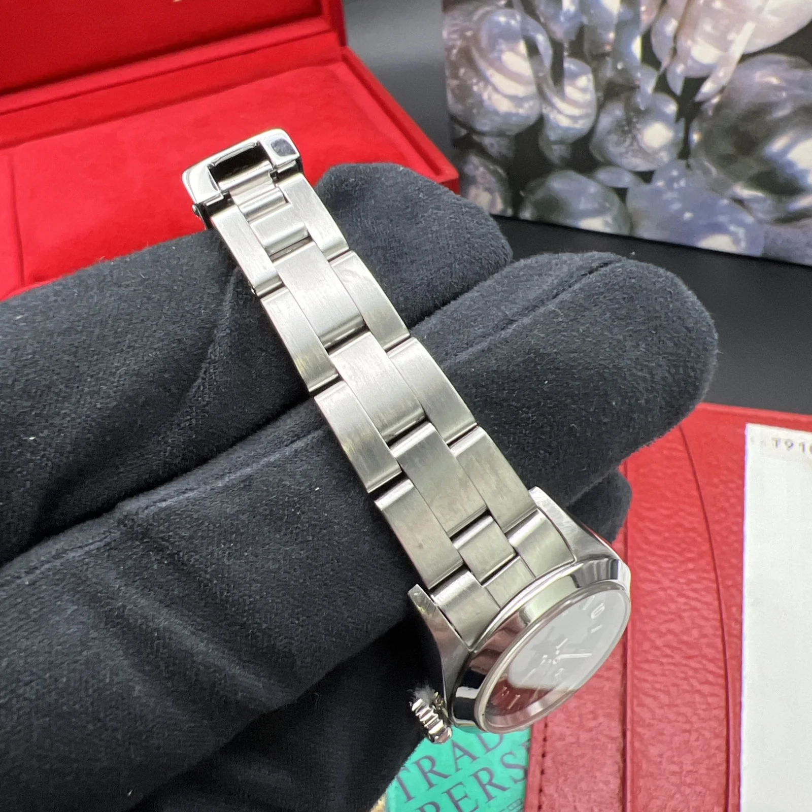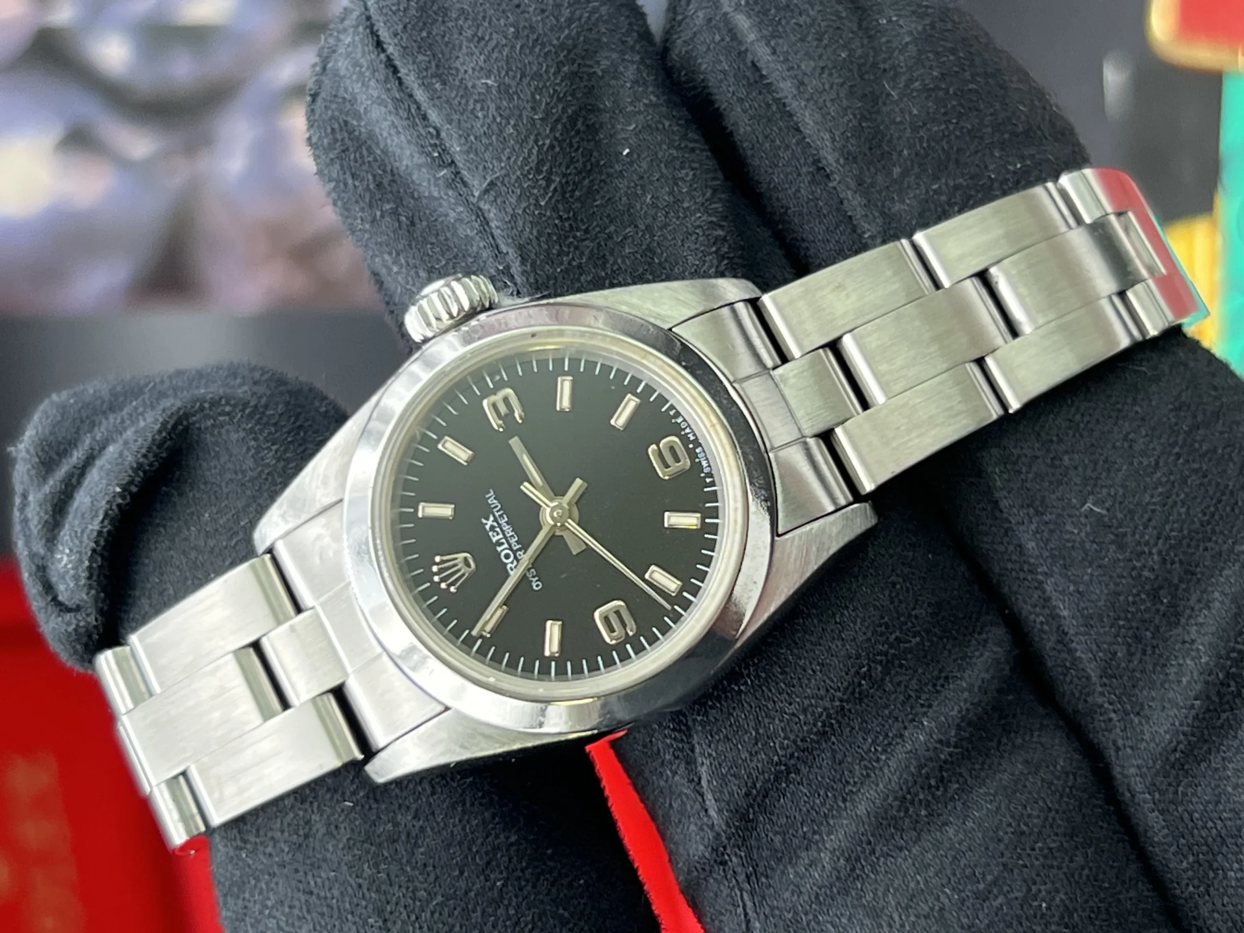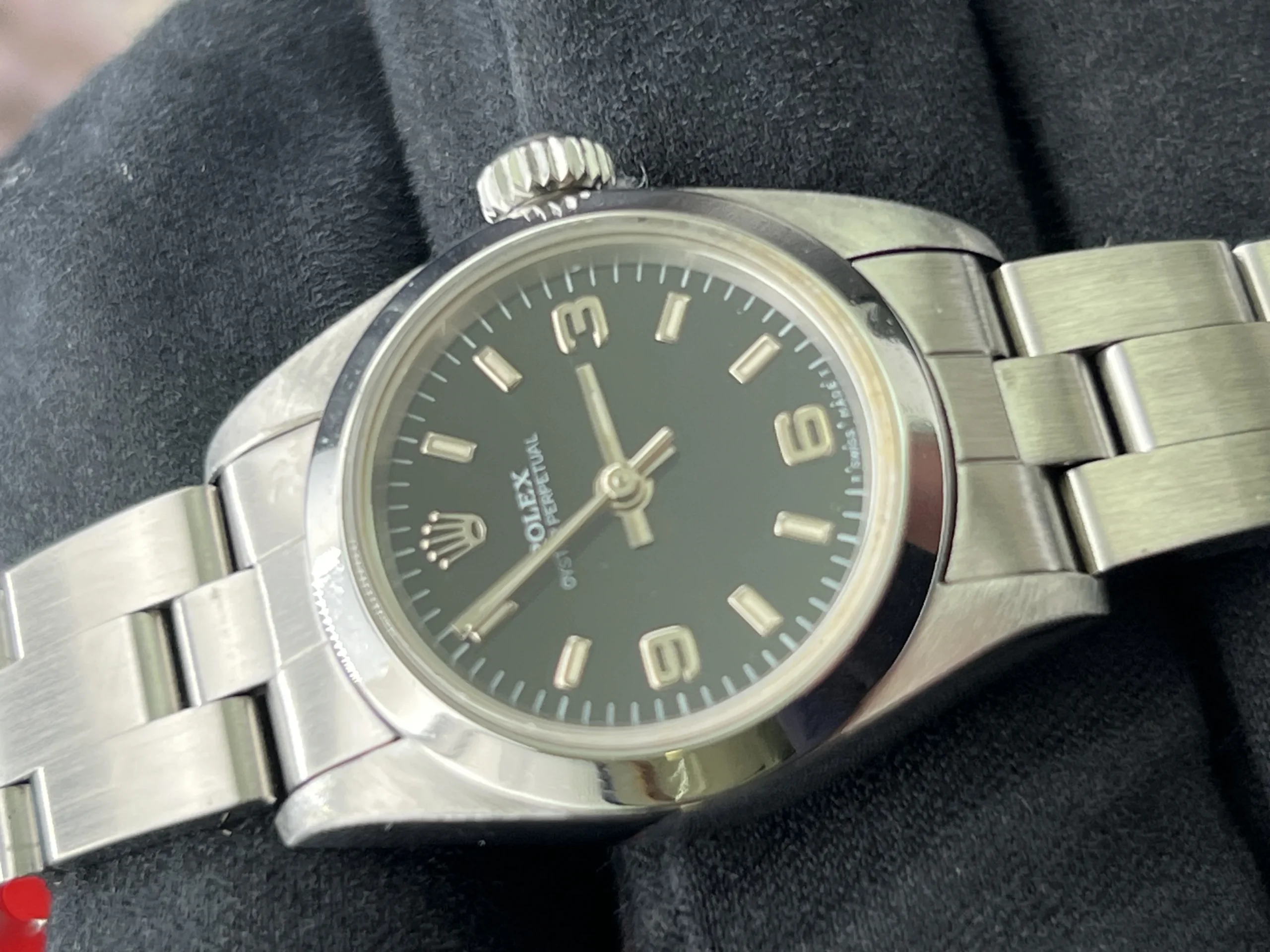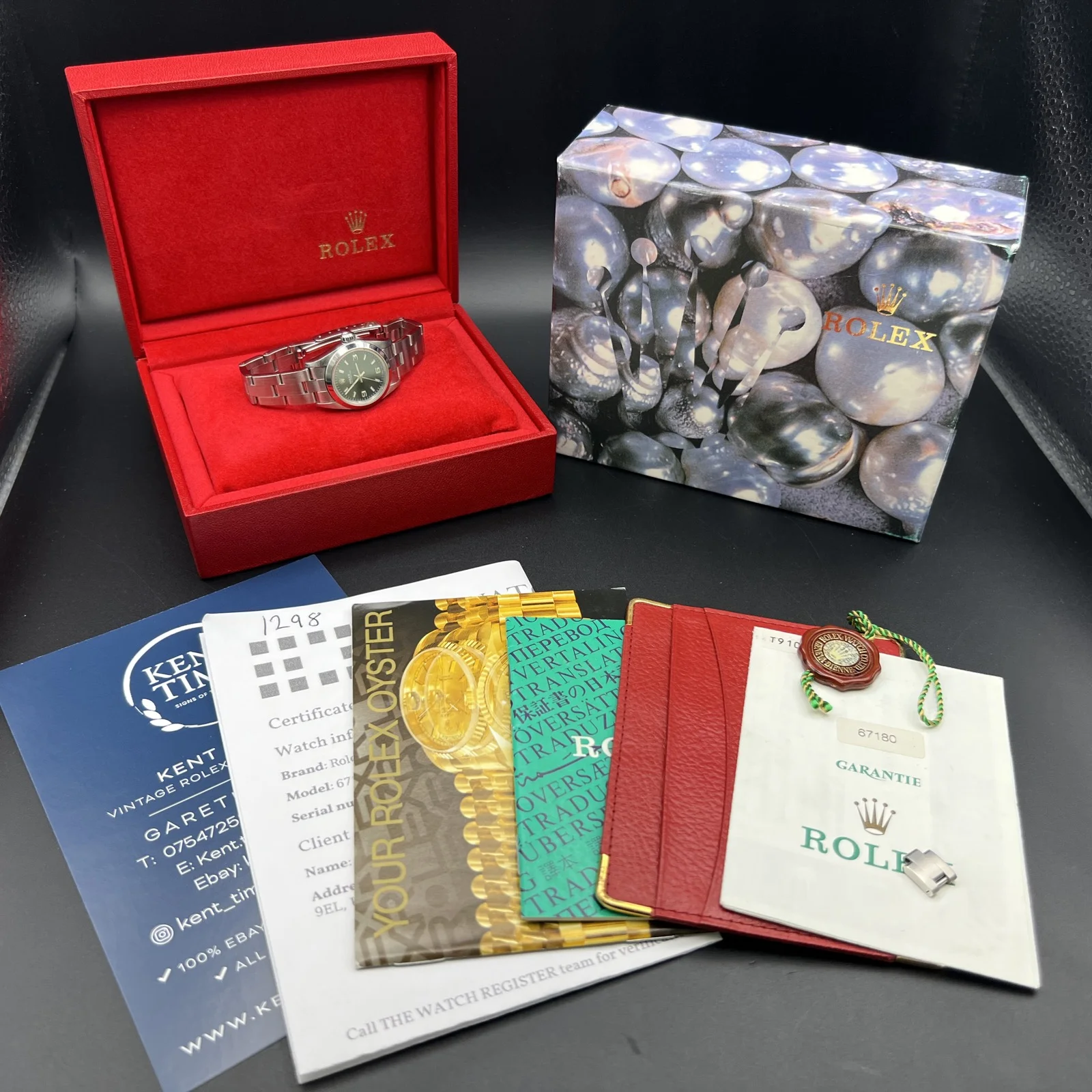 | Here we have a very nicely presented Rolex ladies Oyster Watch bearing the reference 67180. Watch first sold in 1997. It comes with an original Rolex boxes, original papers, booklets, wallet and Tag. You’ll also receive a Watch register certificate showing it’s free of claims. The Watches presented in very good condition very little evidence of use only only a few light marks. The glass is unmarked as is the Dial. It has been inspected and tested by a watchmaker and is keeping Time.. |