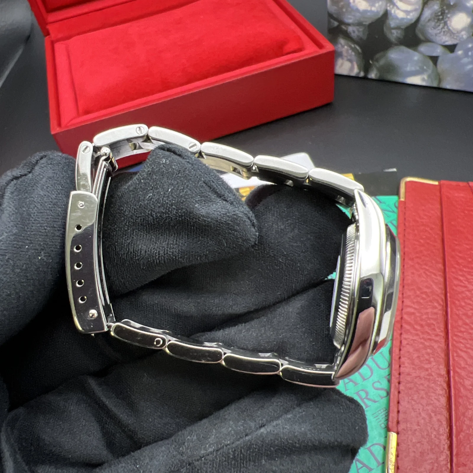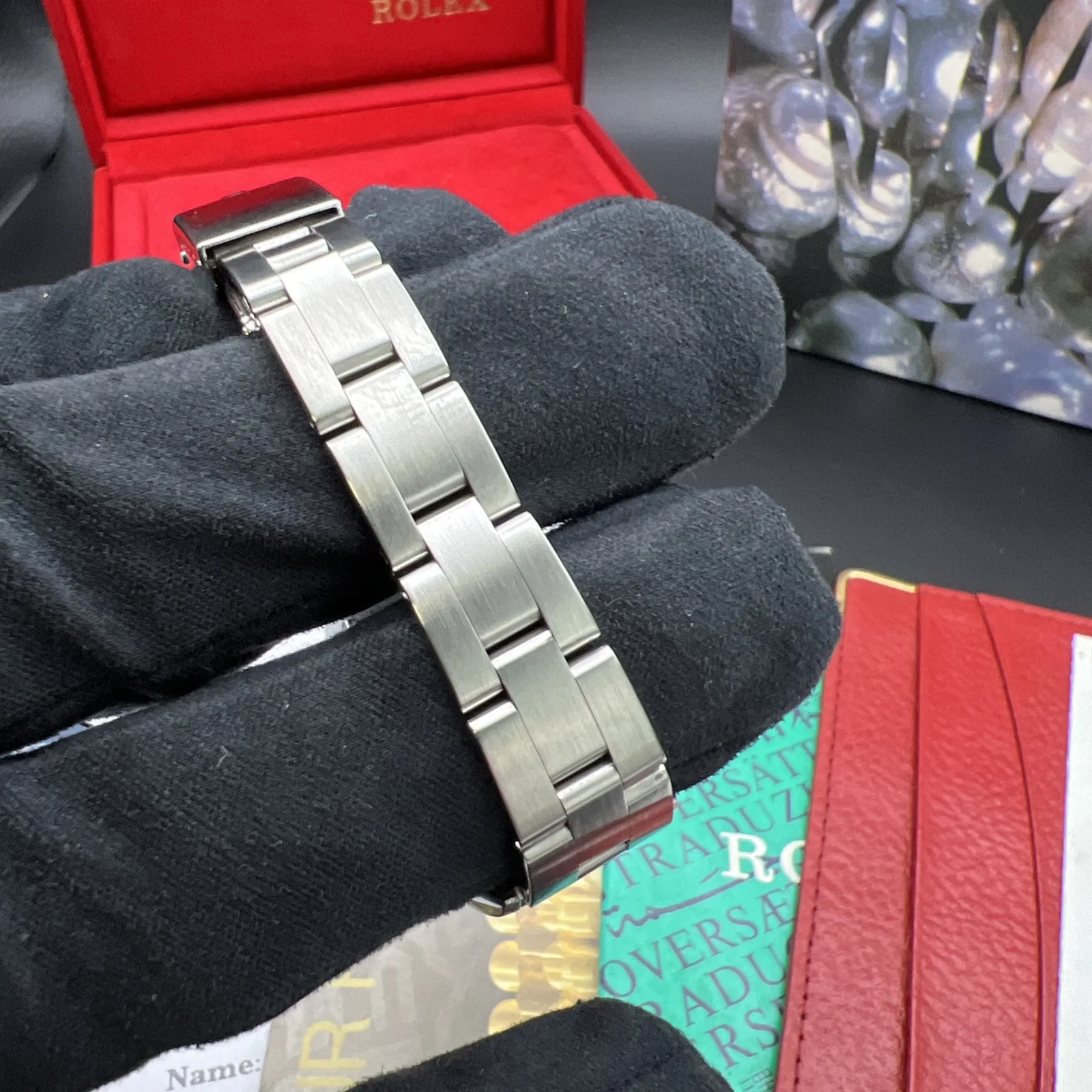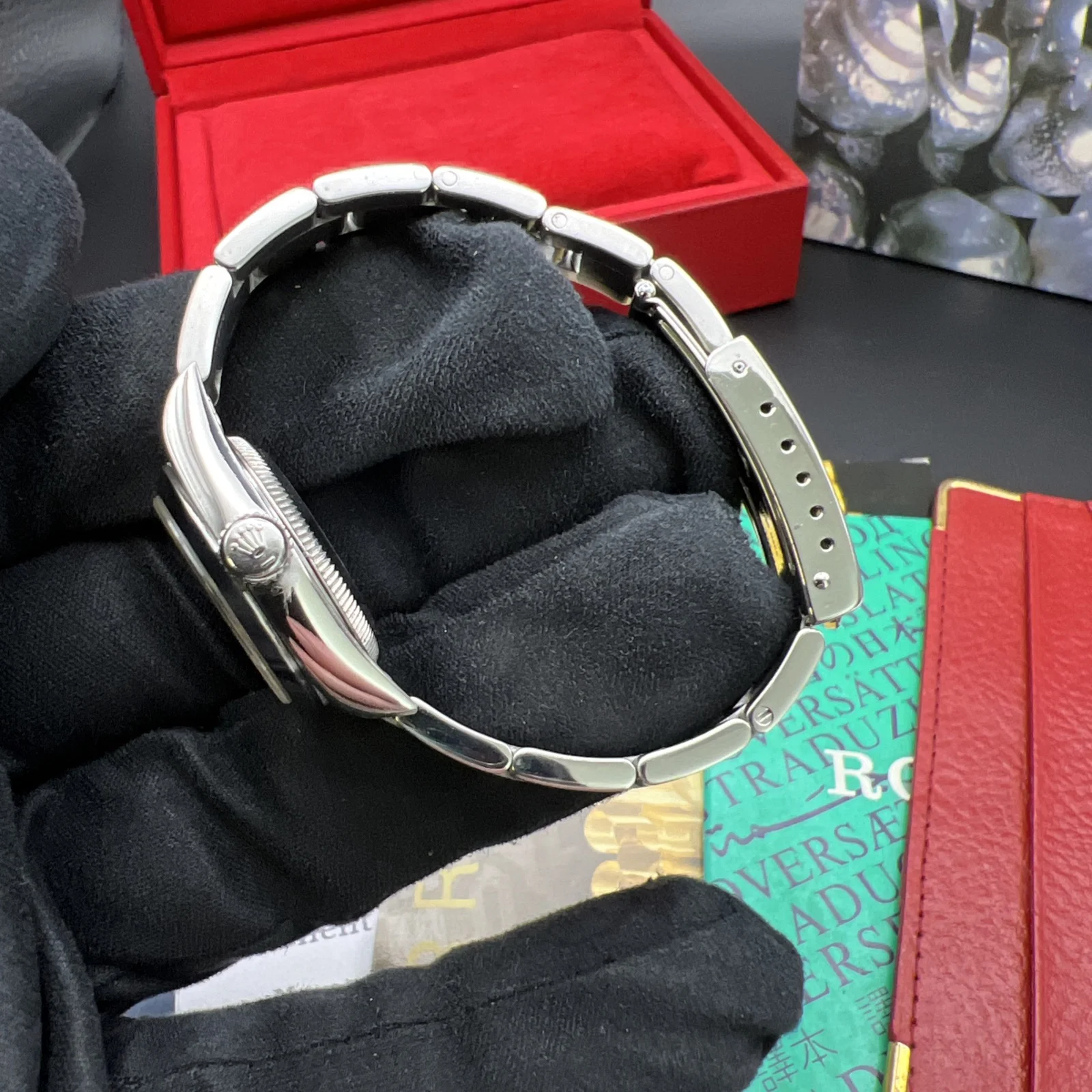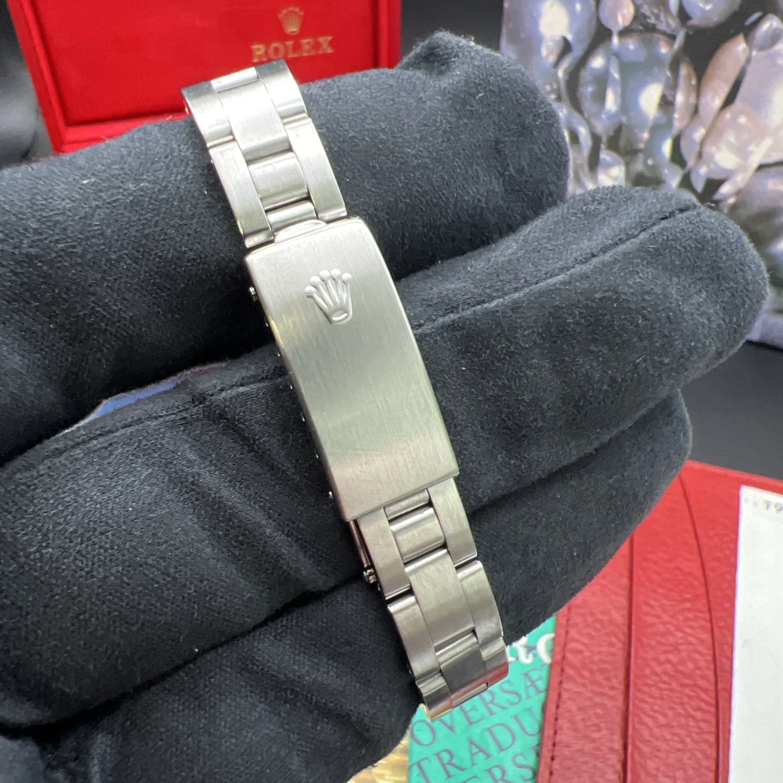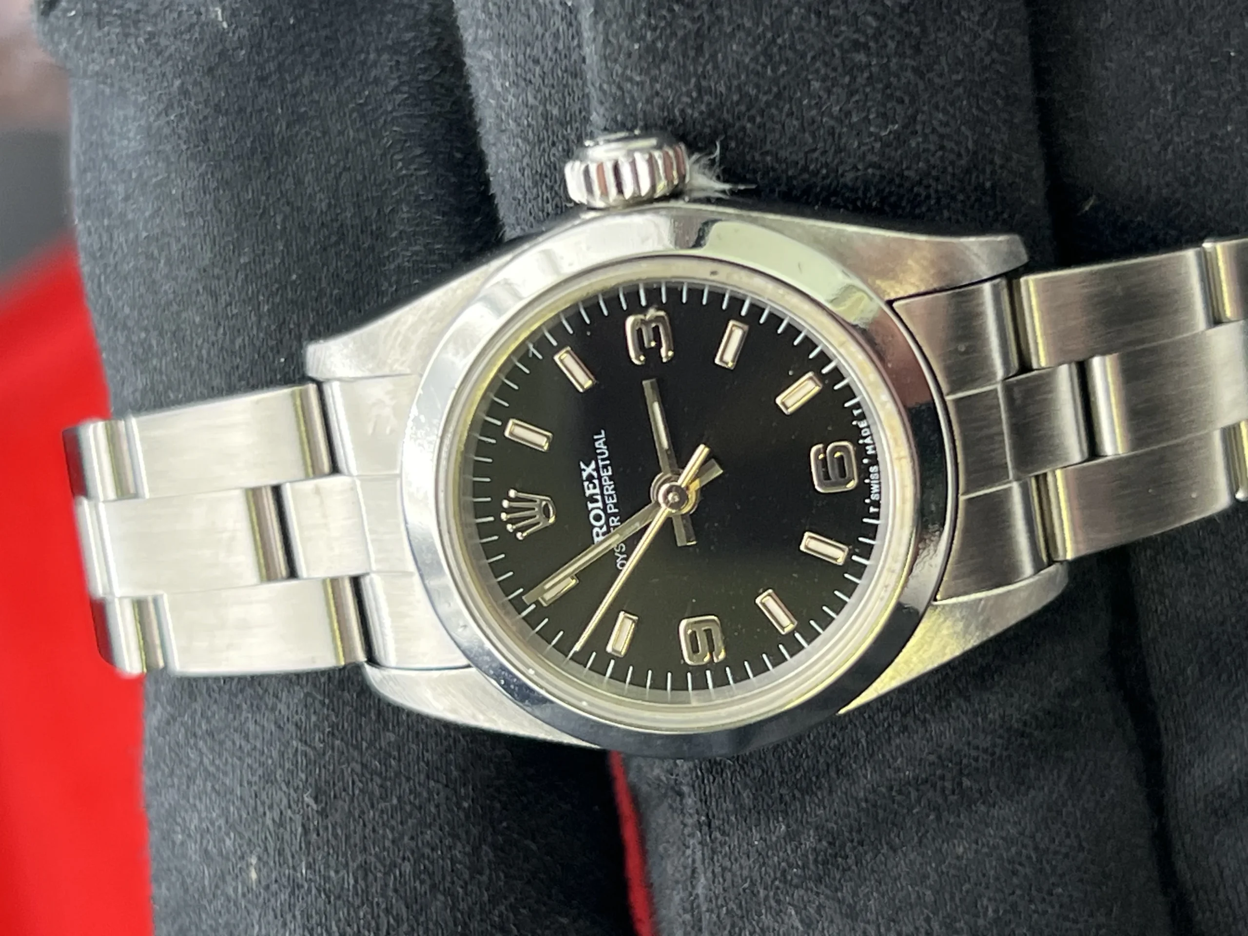 | Here we have a very nicely presented Rolex ladies Oyster Watch bearing the reference 67180. Watch first sold in 1997. It comes with an original Rolex boxes, original papers, booklets, wallet and Tag. You’ll also receive a Watch register certificate showing it’s free of claims. The Watches presented in very good condition very little evidence of use only only a few light marks. The glass is unmarked as is the Dial. It has been inspected and tested by a watchmaker and is keeping Time.. |