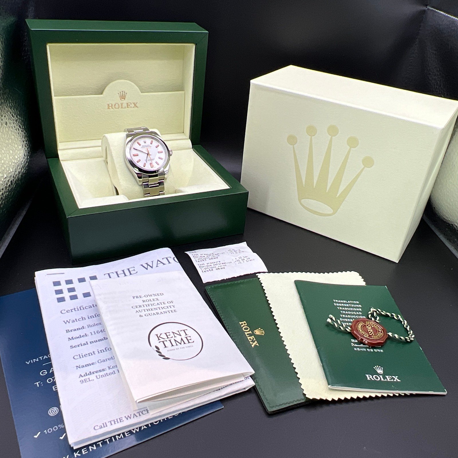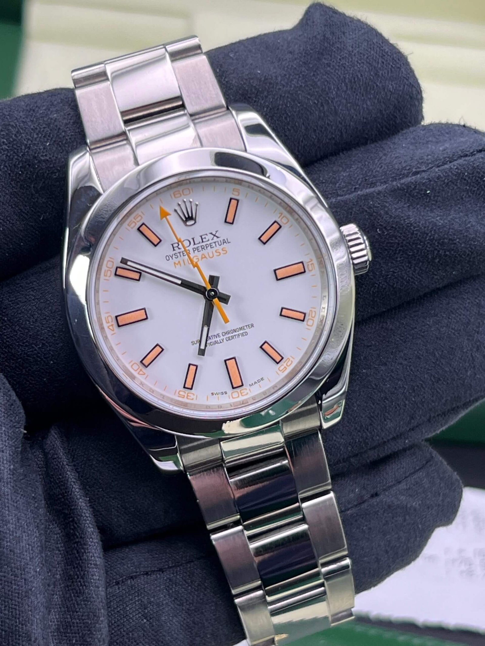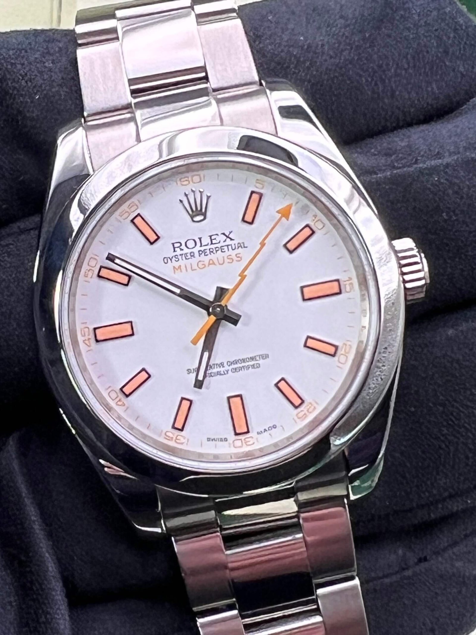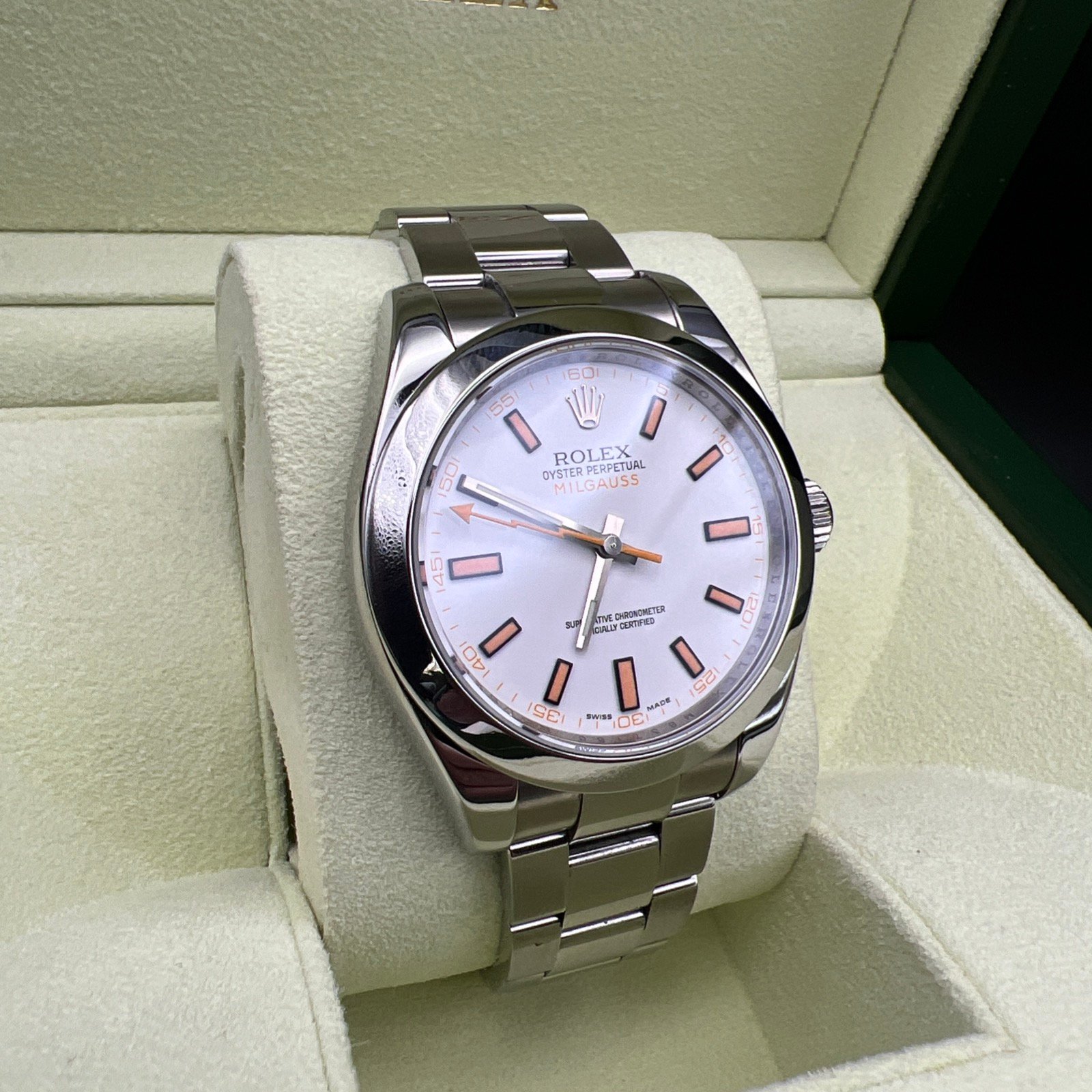 | Rolex Milgauss gents wristwatch reference 116400. This is the sort of white Dial and was made in 2008 . This model has the rehaut engraving around the site ring with the serial number in the 6 o’clock position. The watch is presented very good condition with only evidence of light marks from use to the bracelet. The case, glass and Dial are clean. The Watch has been pressure tested and serviced by our watchmaker and is running correctly. The watch comes with Rolex boxes, wallet, booklet and tag. You will also receive our certificate,a Watch register certificate and a pressure test ticket. No original card is present as has been misplaced, but we have printed a photo of the card. |