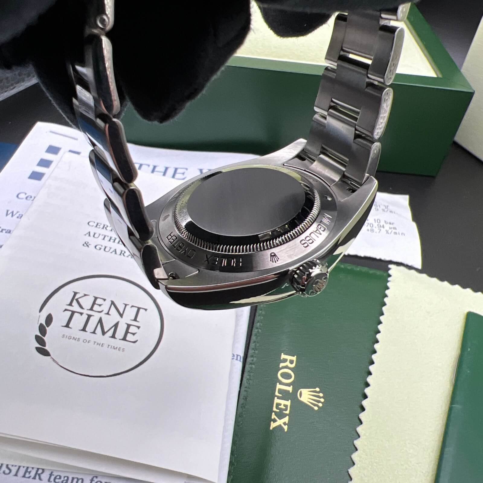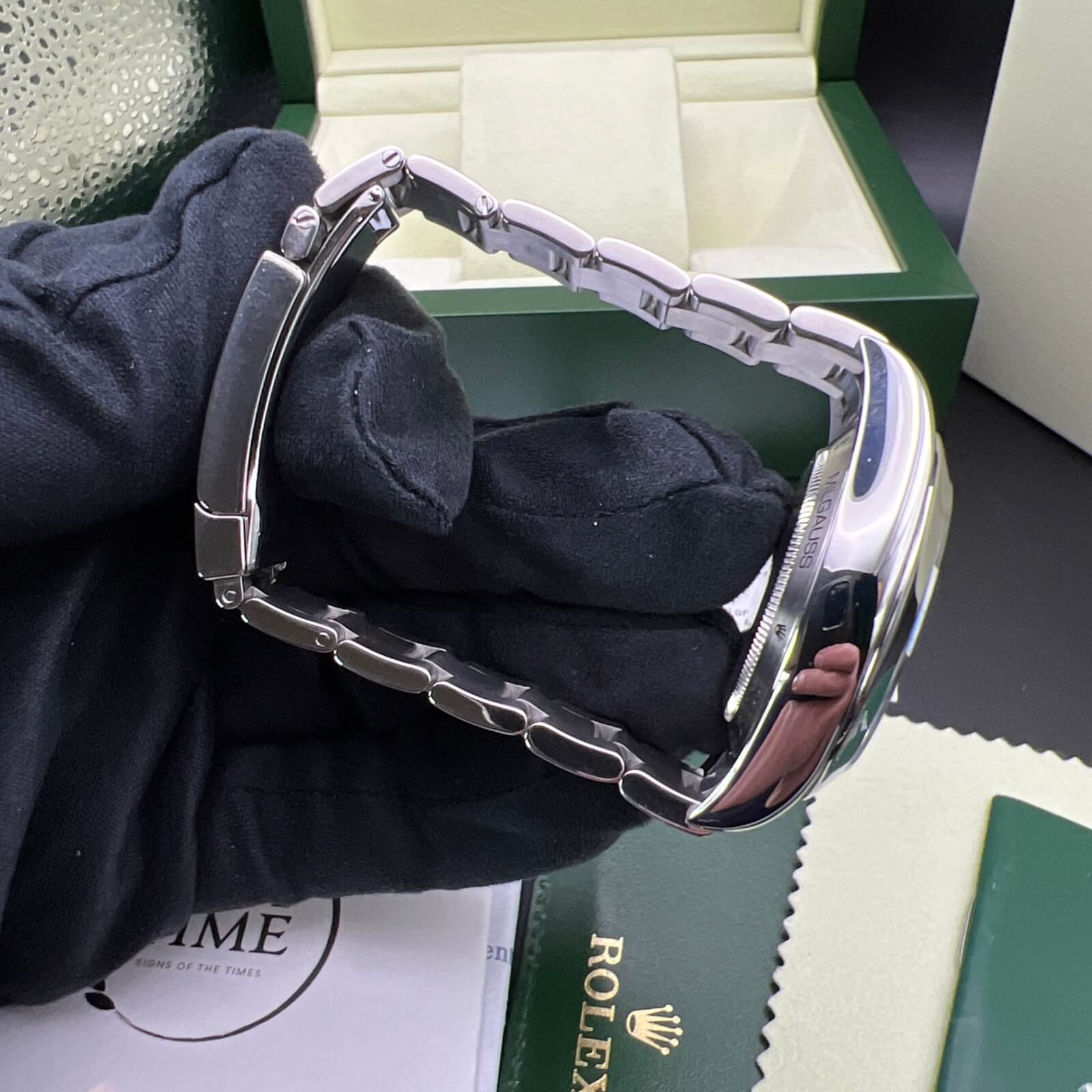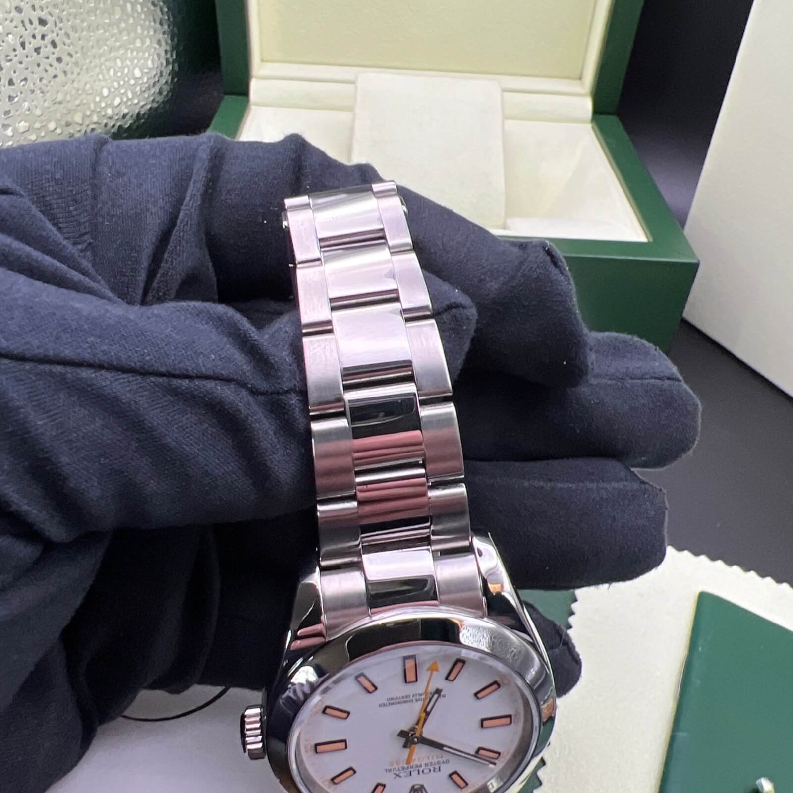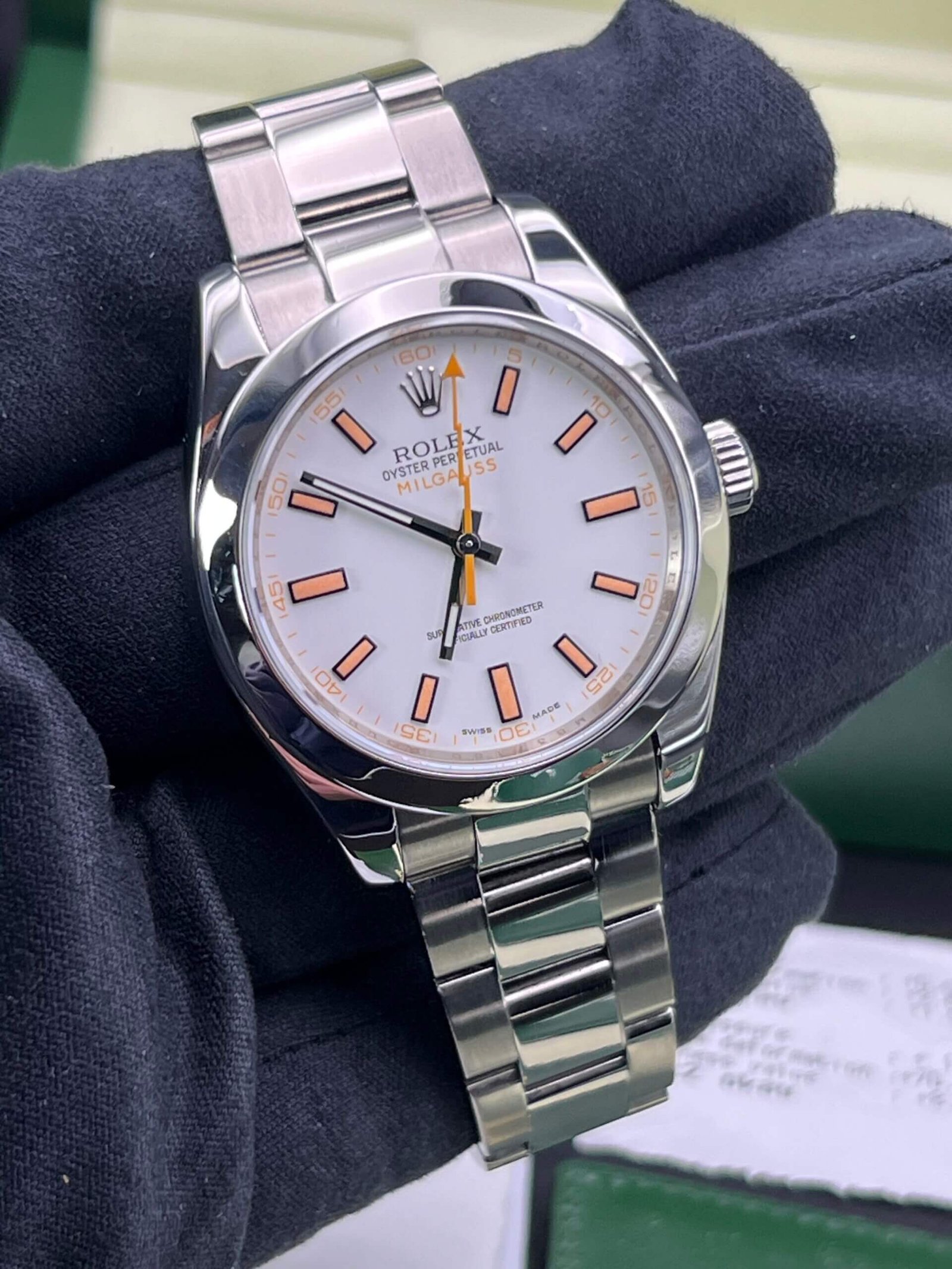 | Rolex Milgauss gents wristwatch reference 116400. This is the sort of white Dial and was made in 2008 . This model has the rehaut engraving around the site ring with the serial number in the 6 o’clock position. The watch is presented very good condition with only evidence of light marks from use to the bracelet. The case, glass and Dial are clean. The Watch has been pressure tested and serviced by our watchmaker and is running correctly. The watch comes with Rolex boxes, wallet, booklet and tag. You will also receive our certificate,a Watch register certificate and a pressure test ticket. No original card is present as has been misplaced, but we have printed a photo of the card. |