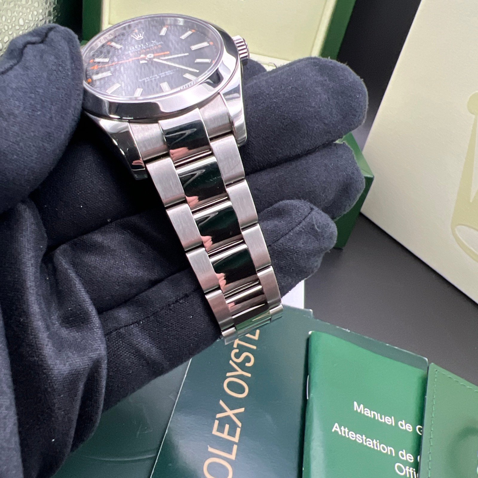 Rolex milgauss 116400. The watch dates to 2008. It comes presented in excellent condition (see photos) and working as it should. It has a few light marks from being used but otherwise you’d not know it wasn’t new. It’s been inspected by our watchmaker and is keeping time. It comes with Rolex boxes, warranty card and accessories. You will receive our certificate of authenticity, watch register certificate showing it’s free of claims. Please see our feedback and other listings |
