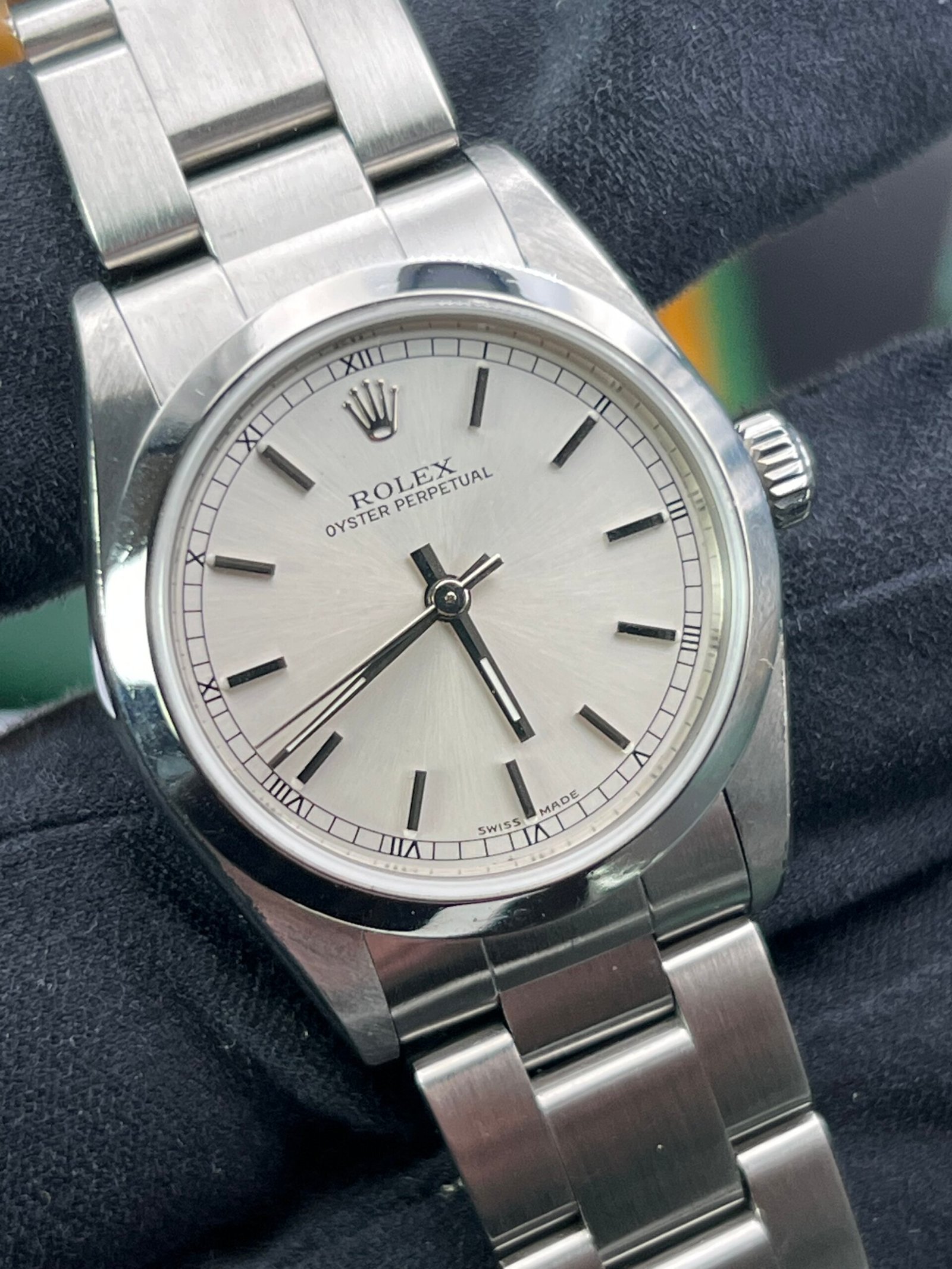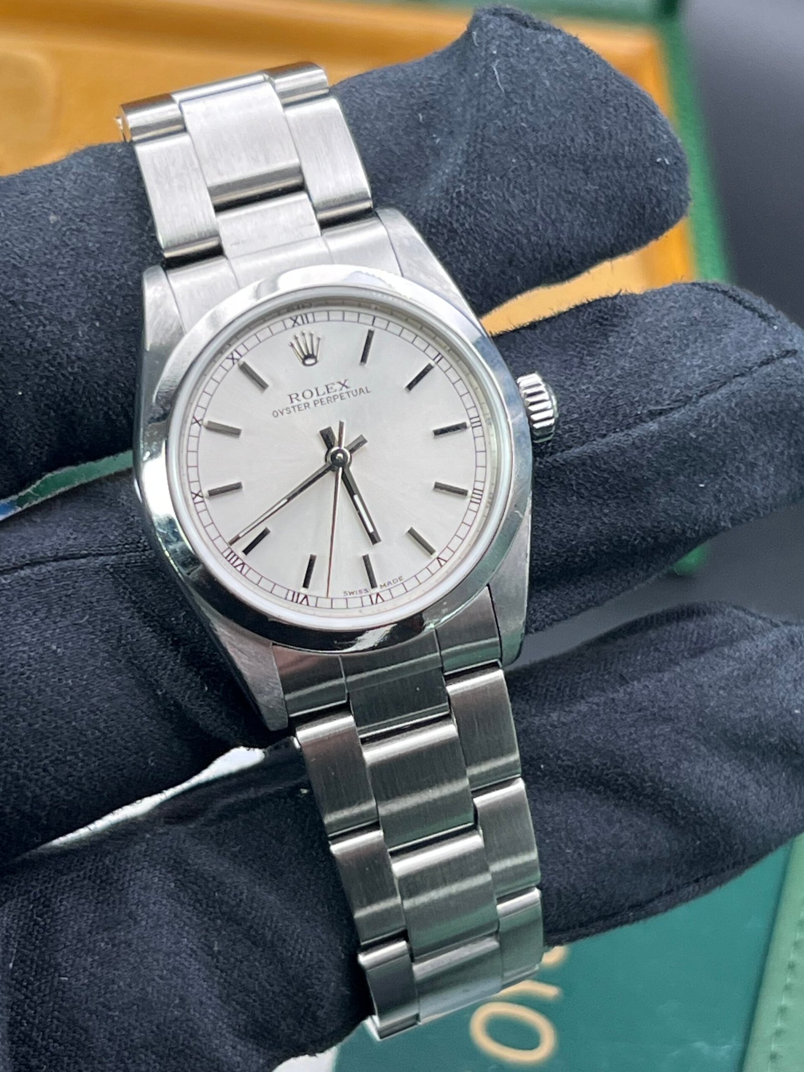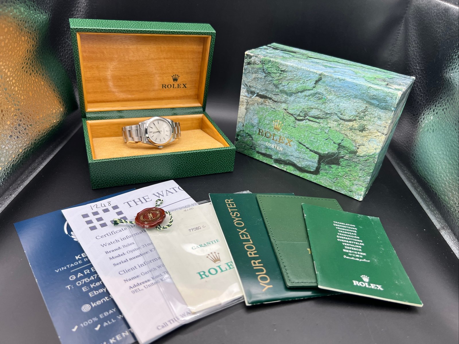 | This is a 31 mm Rolex oyster perpetual originally made and sold in 2001. It comes to presented in very nice condition and with its original box and papers. Watch has previously mentioned is in very good condition with only very light signs of where in the form of surface marks. The Watch has been inspected and was found to be running correctly and keeping In Time. It comes presented with original box, papers, booklets wallet and Tag. You will also receive a Watch register certificate showing it’s free of claims. This would make an idea Watch for a lady or maybe a boy’s first Rolex. |