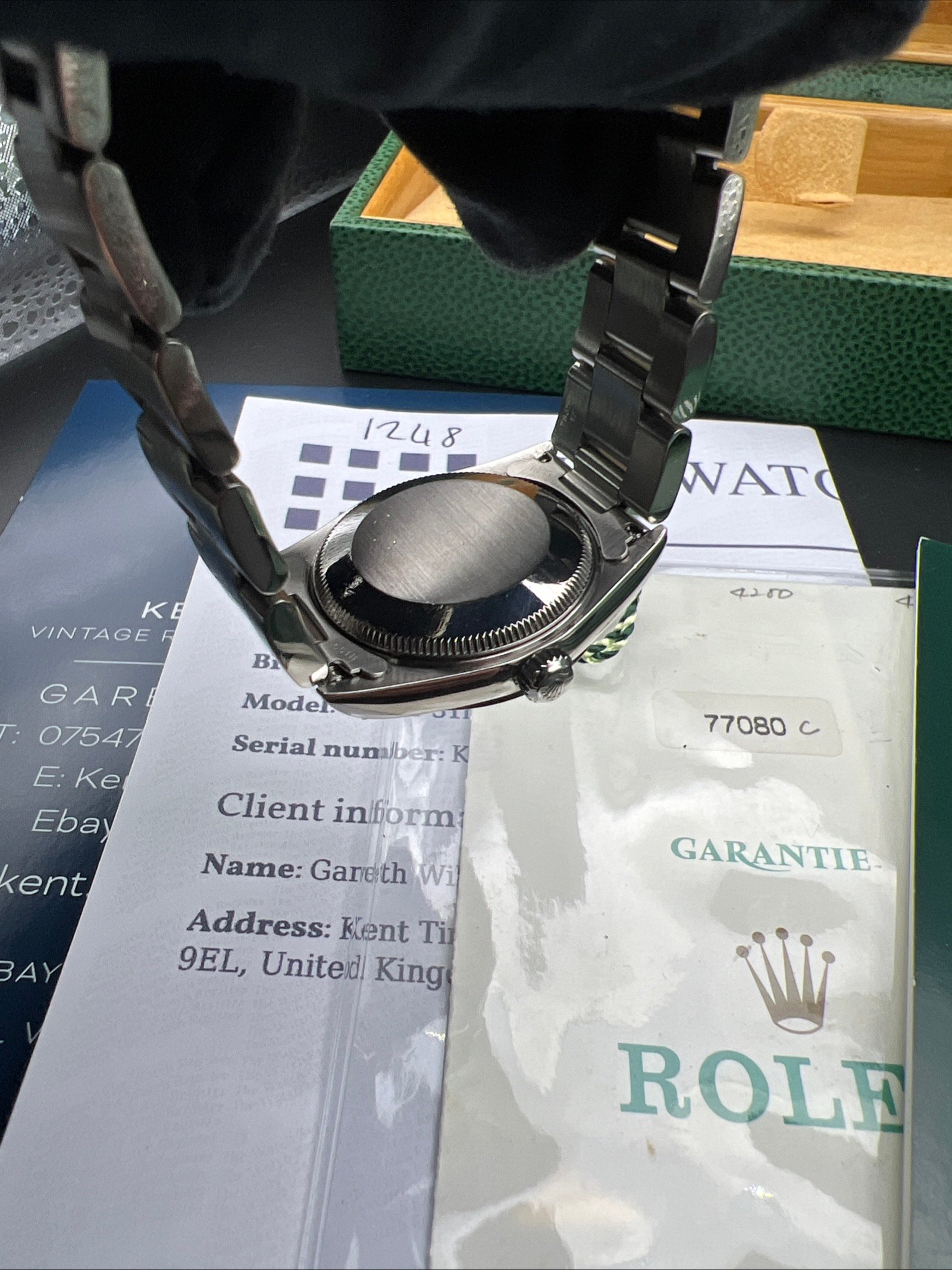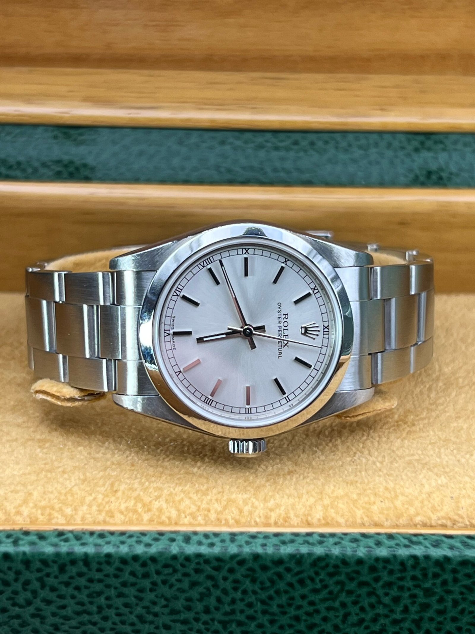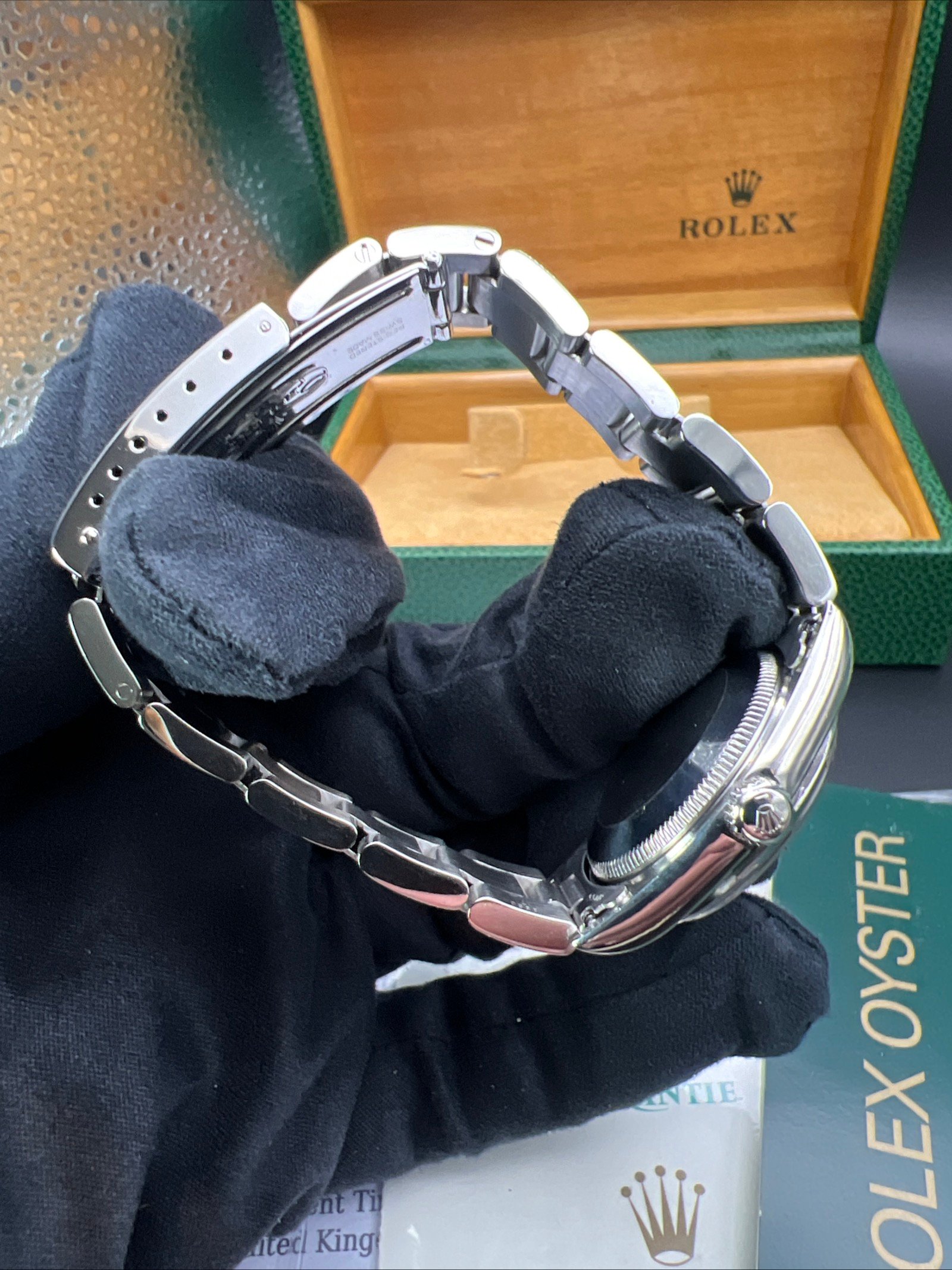 | This is a 31 mm Rolex oyster perpetual originally made and sold in 2001. It comes to presented in very nice condition and with its original box and papers. Watch has previously mentioned is in very good condition with only very light signs of where in the form of surface marks. The Watch has been inspected and was found to be running correctly and keeping In Time. It comes presented with original box, papers, booklets wallet and Tag. You will also receive a Watch register certificate showing it’s free of claims. This would make an idea Watch for a lady or maybe a boy’s first Rolex. |