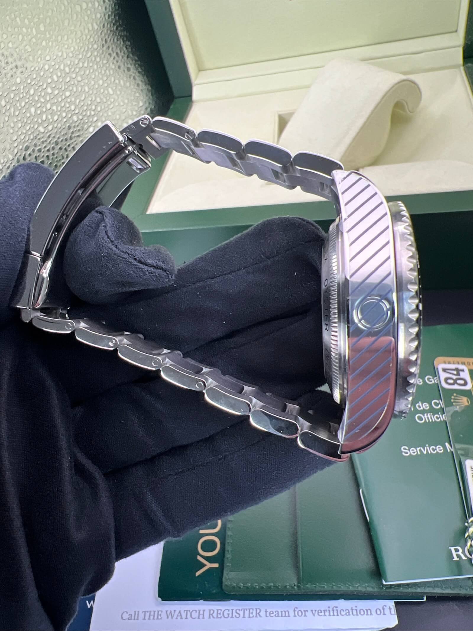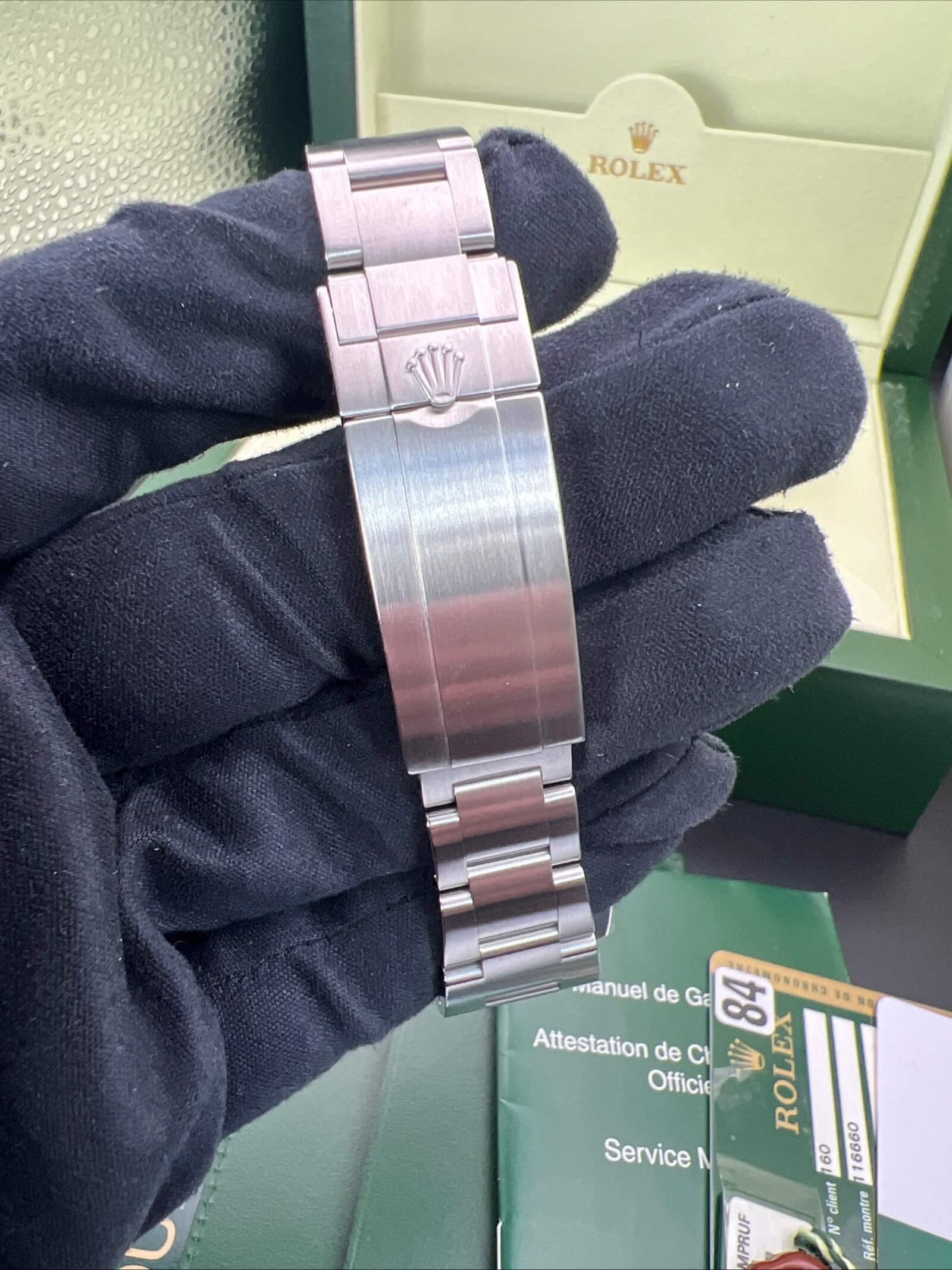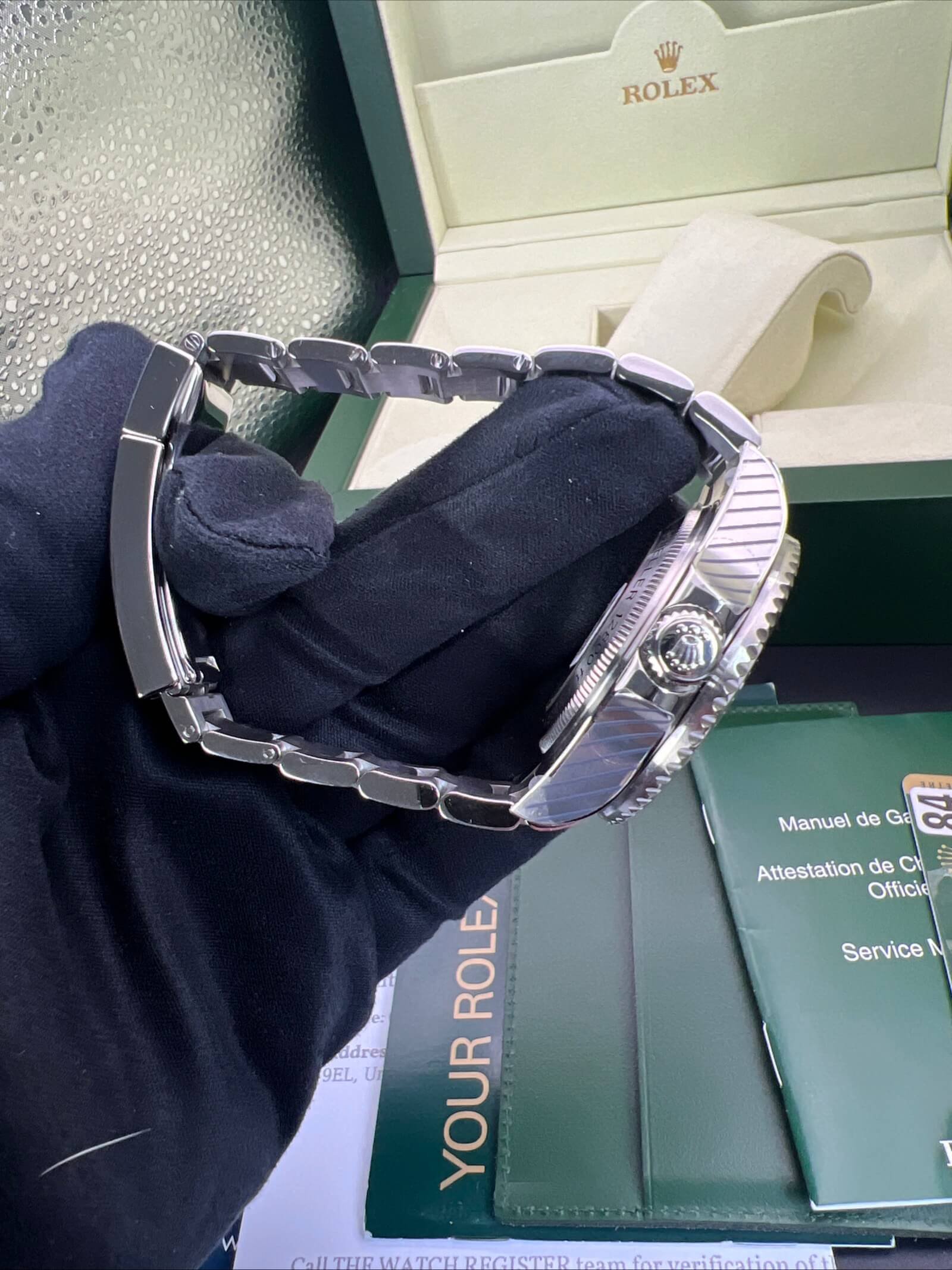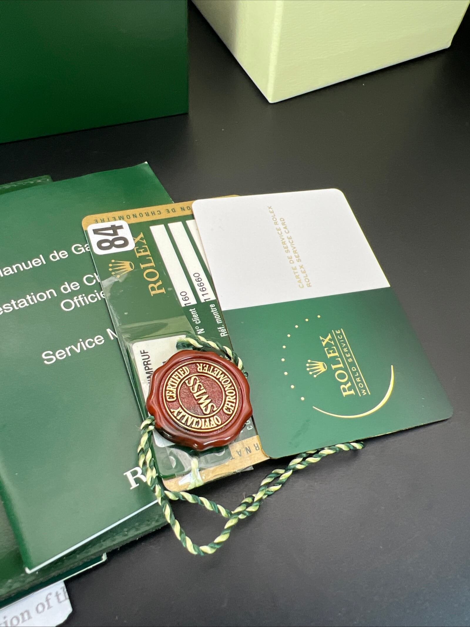 It comes presented with its original Rolex boxes, papers, booklets, wallet and hang tags. You will also receive a Watch register certificate showing it’s free of claims, the Rolex service guarantee card.