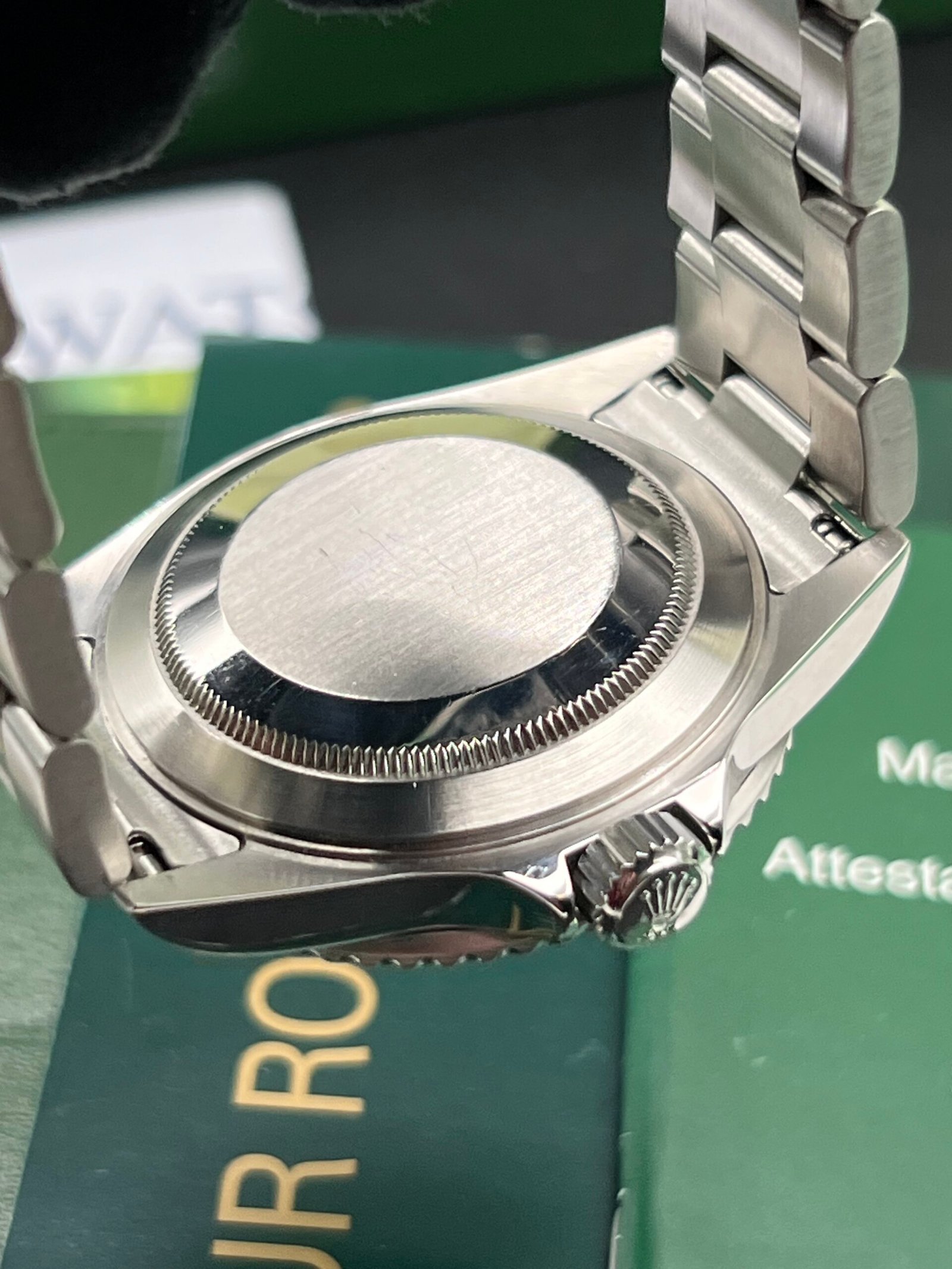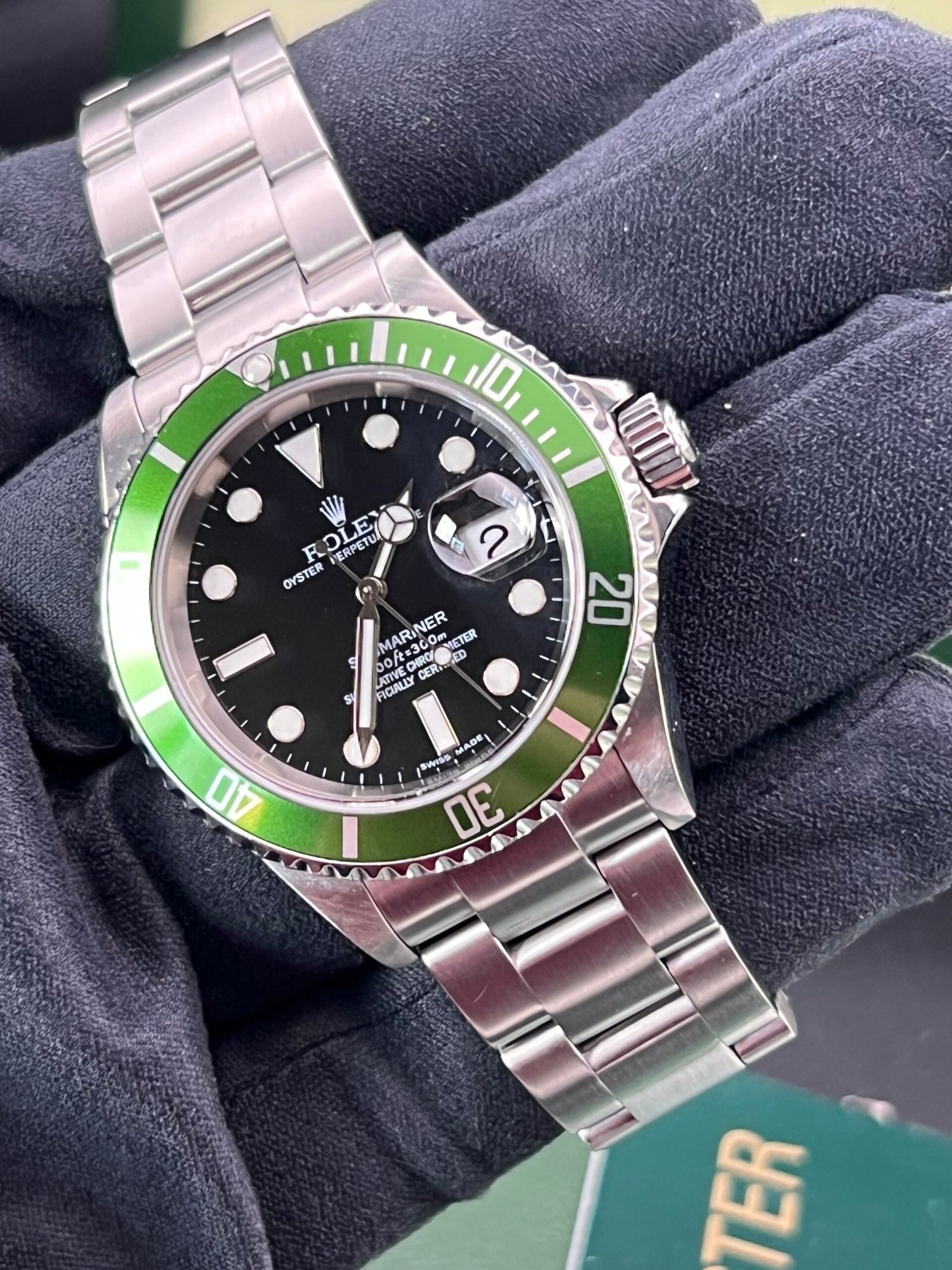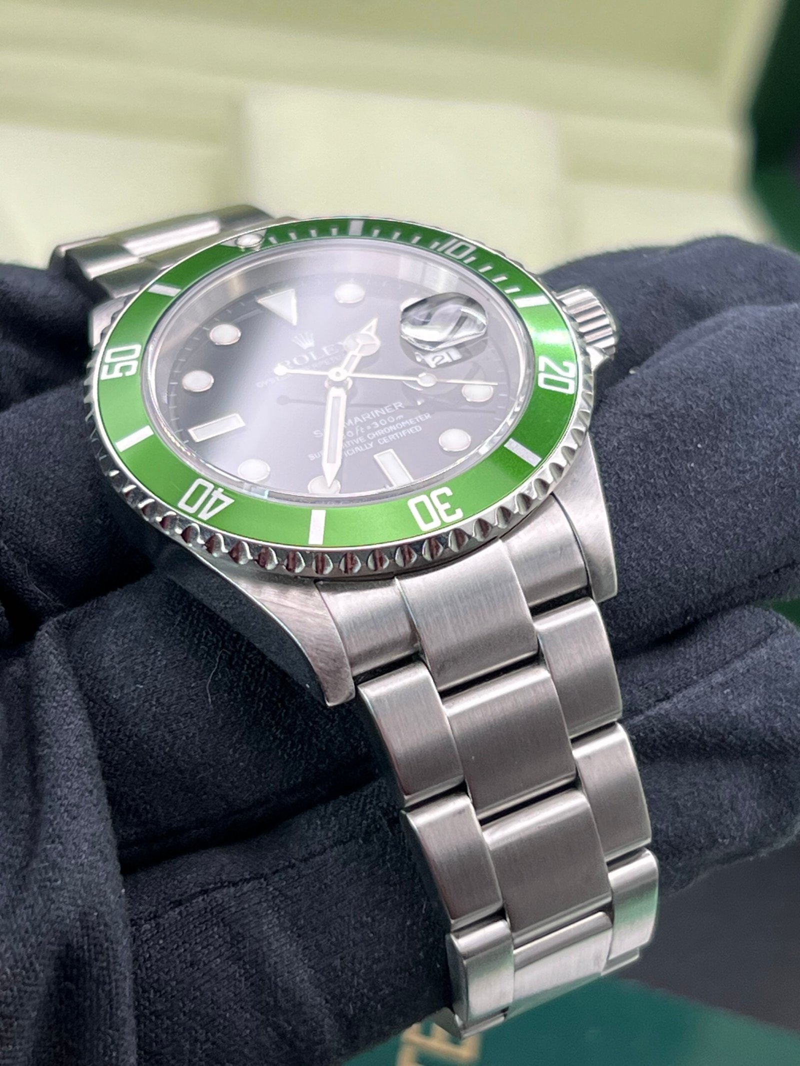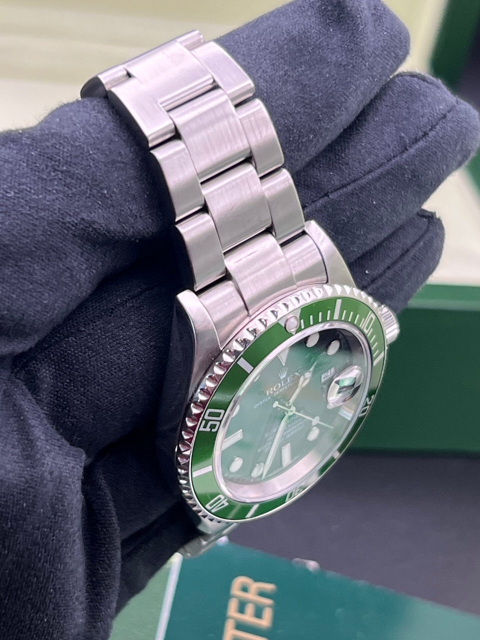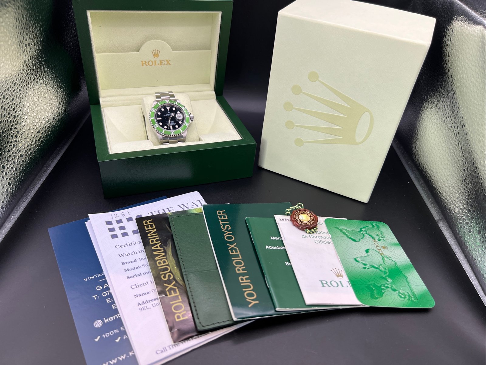 Here we have the sort after Rolex submariner Kermit. This particular Watch was first sold in 2007 and lightly manufactured in 2006. It was originally sold in the United Kingdom.