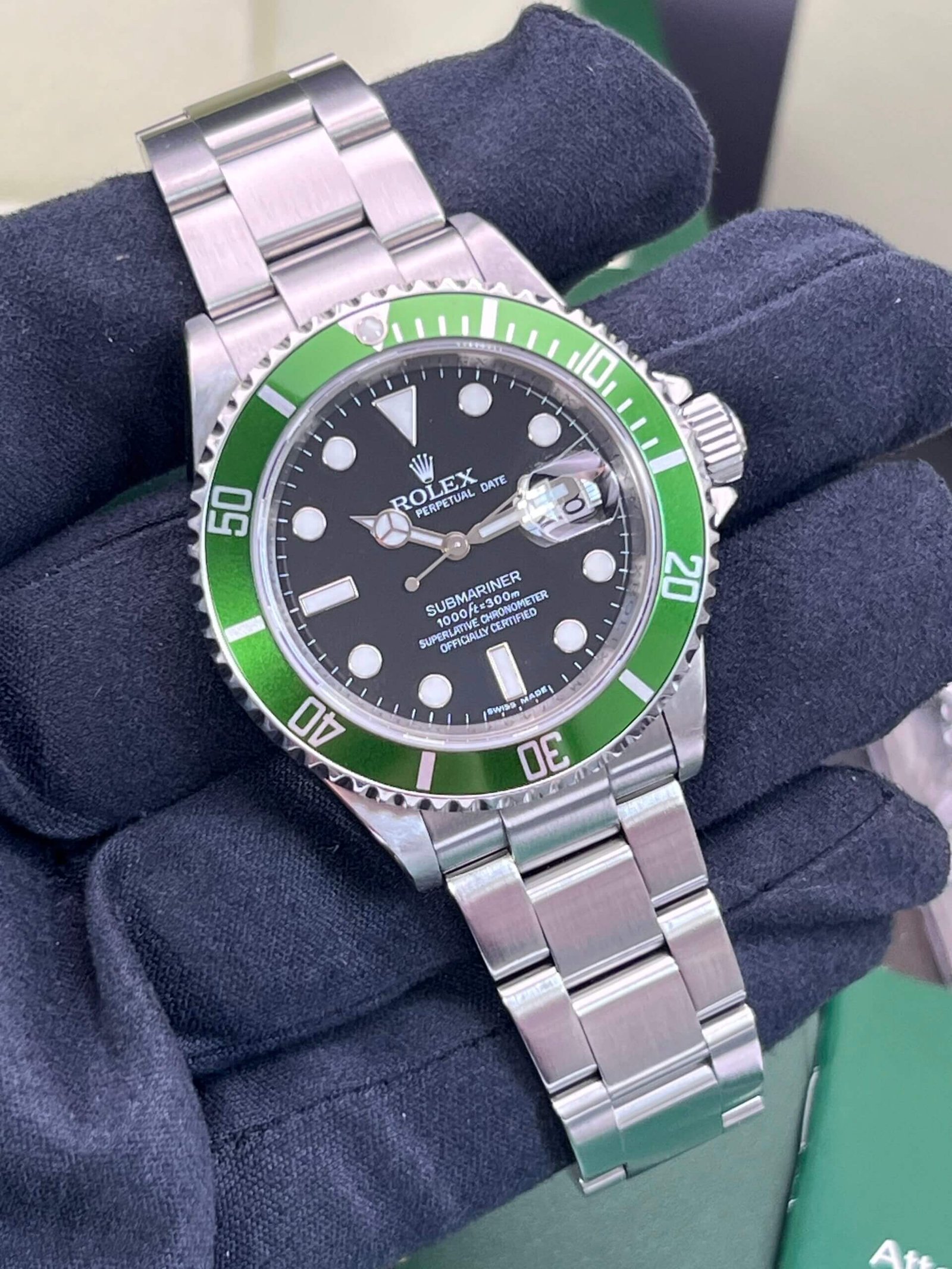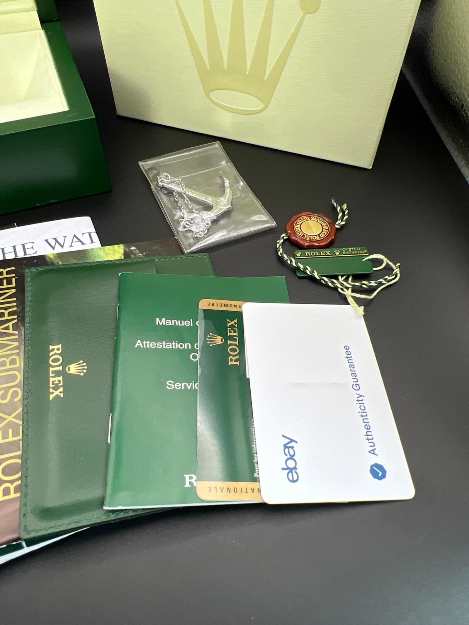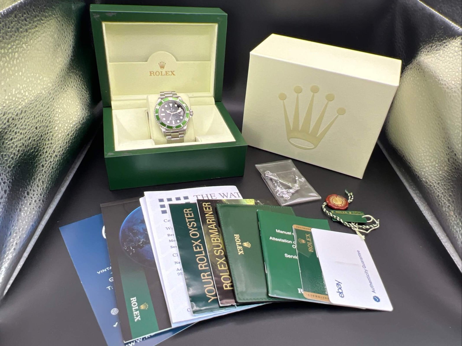 | Here we have the sort after Rolex submariner Kermit. This particular Watch was first sold in 2008. It was originally sold in the United Kingdom. The Watch comes presented in very good condition with only light surface marks as evidence of use. Remembering it’s a 20 year-old Watch it is in good condition. The Watch has been inspected prior to listing and was found to operate correctly and keep time. The Watch comes with its original box and papers. Also included are Rolex booklets, wallet, anchor and Tags. You are also receive a Watch register certificate to show it’s free of claims. |