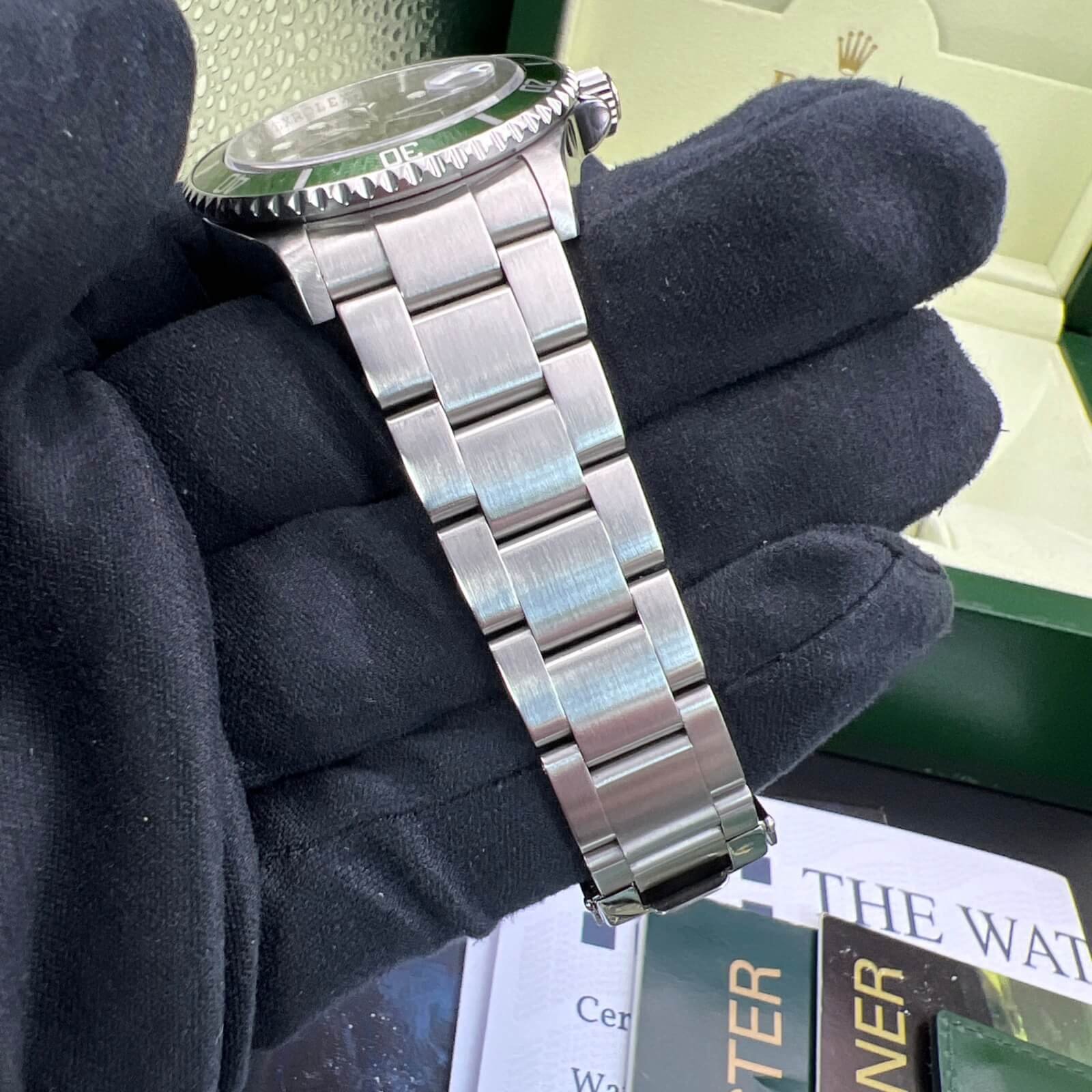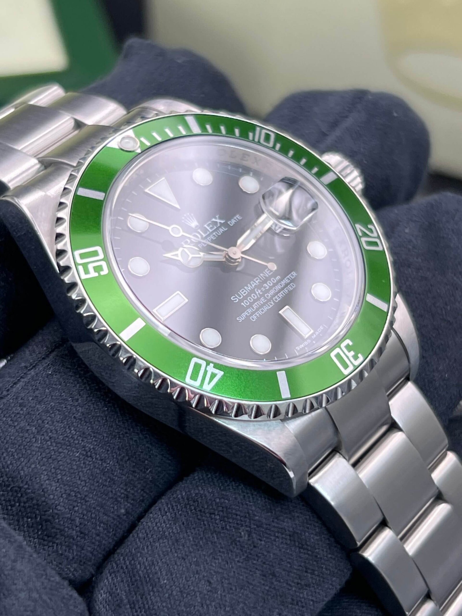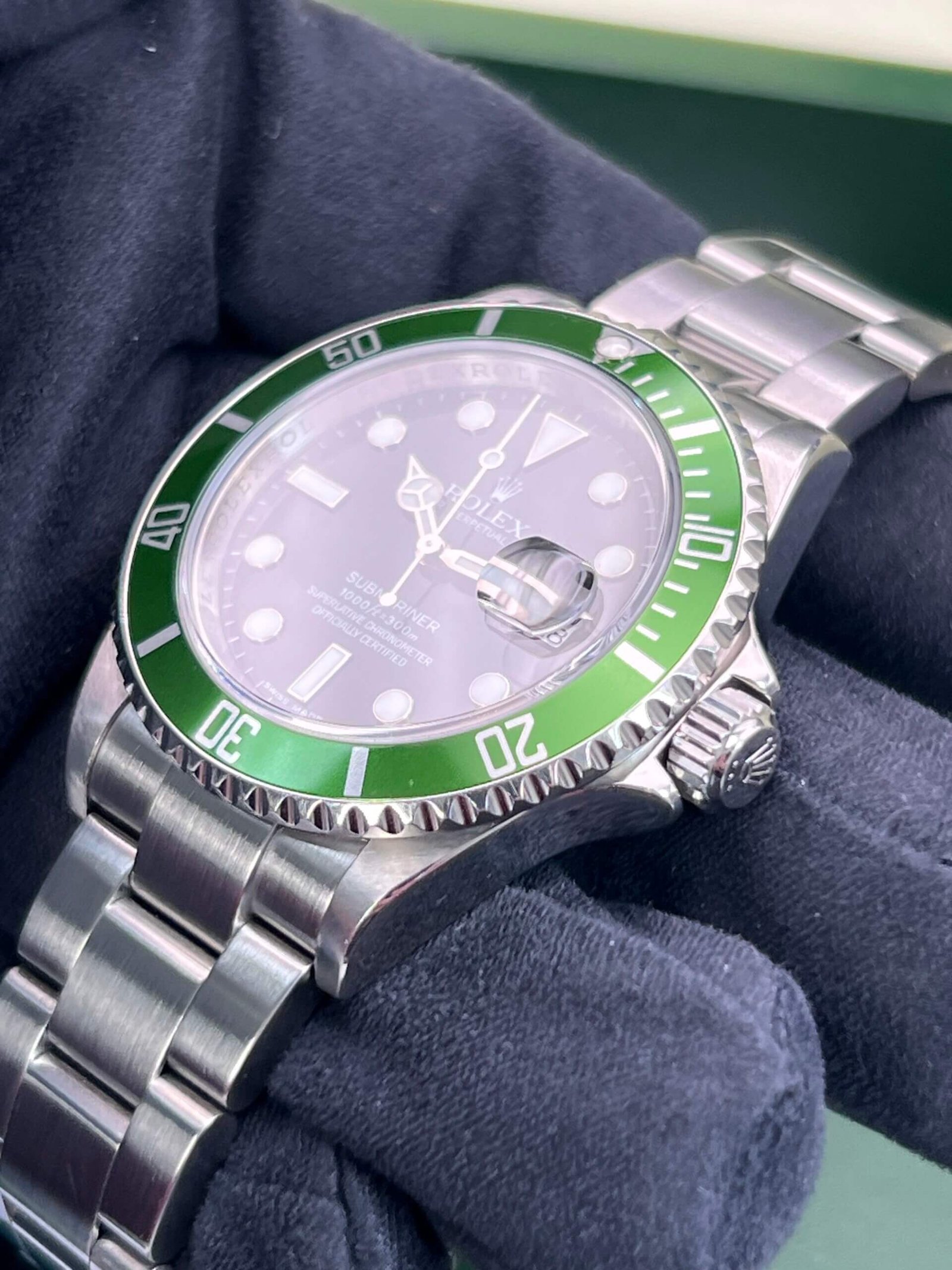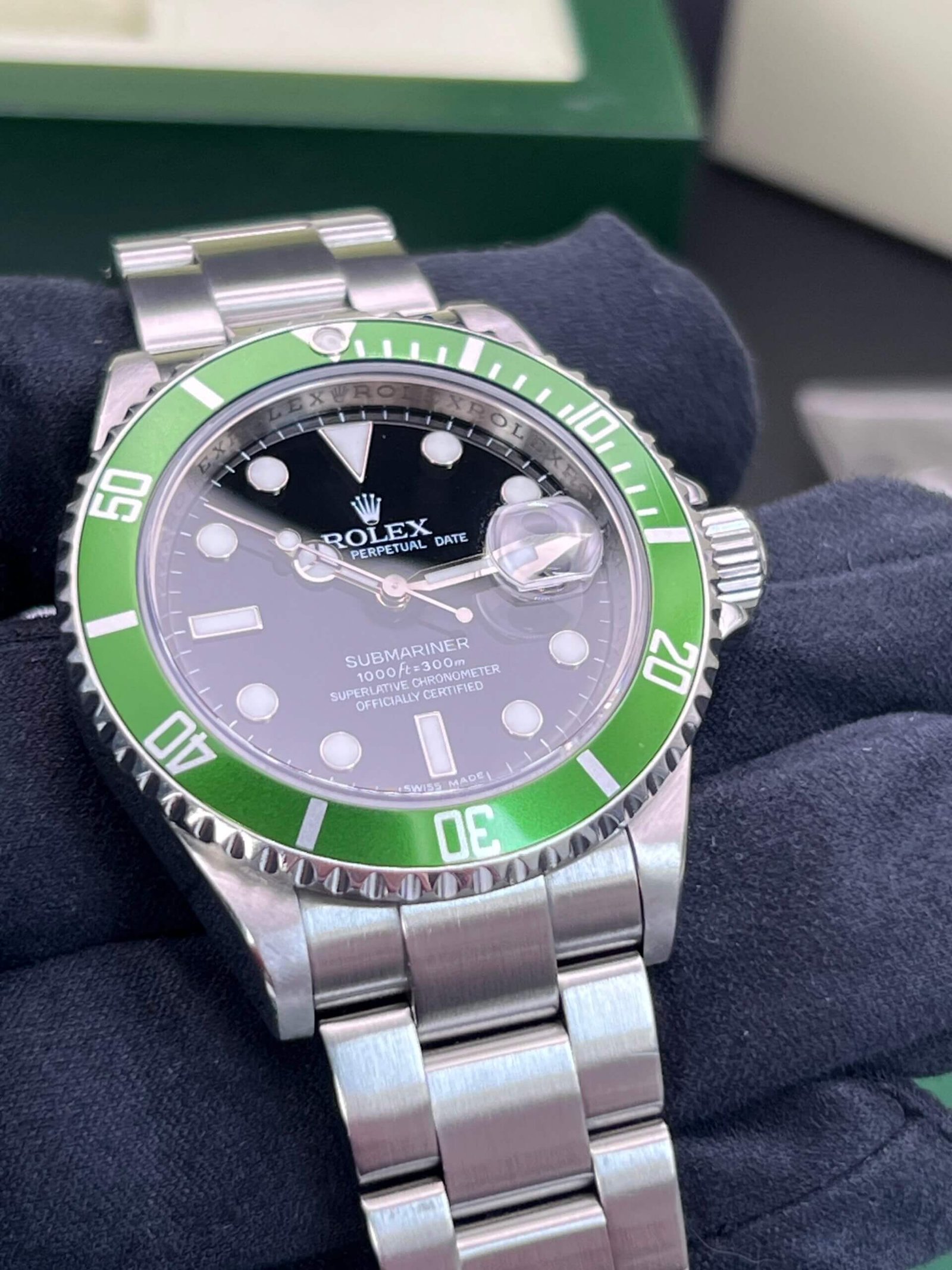 | Here we have the sort after Rolex submariner Kermit. This particular Watch was first sold in 2008. It was originally sold in the United Kingdom. The Watch comes presented in very good condition with only light surface marks as evidence of use. Remembering it’s a 20 year-old Watch it is in good condition. The Watch has been inspected prior to listing and was found to operate correctly and keep time. The Watch comes with its original box and papers. Also included are Rolex booklets, wallet, anchor and Tags. You are also receive a Watch register certificate to show it’s free of claims. |
