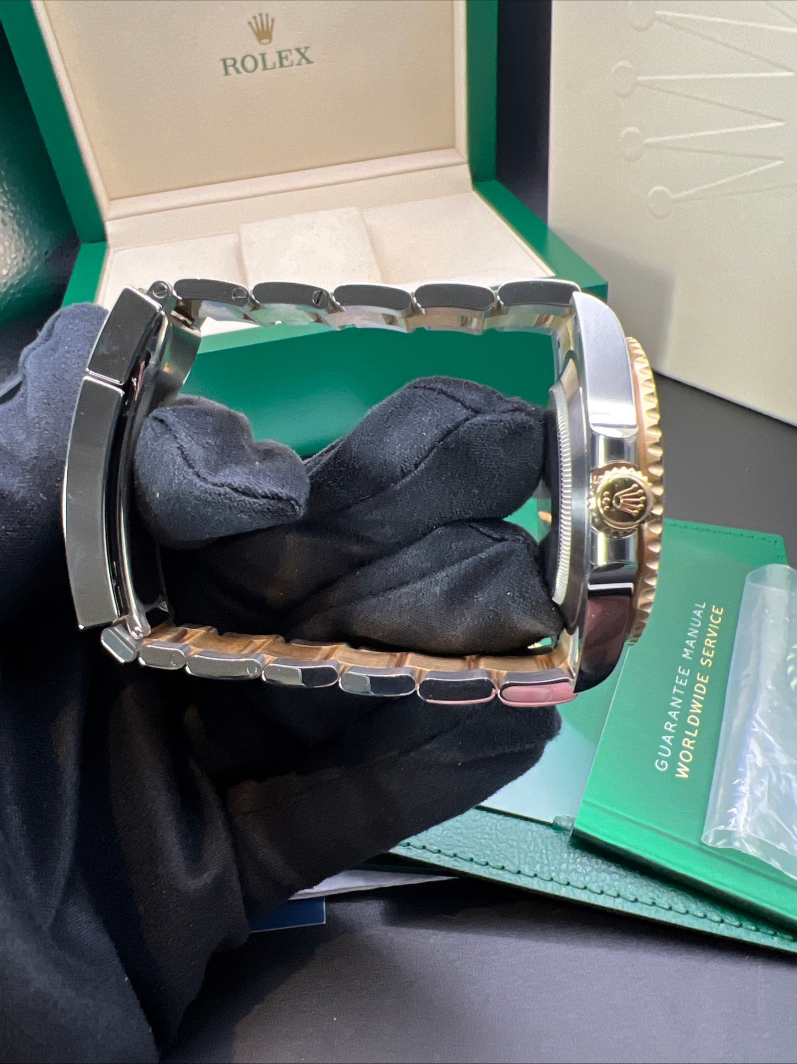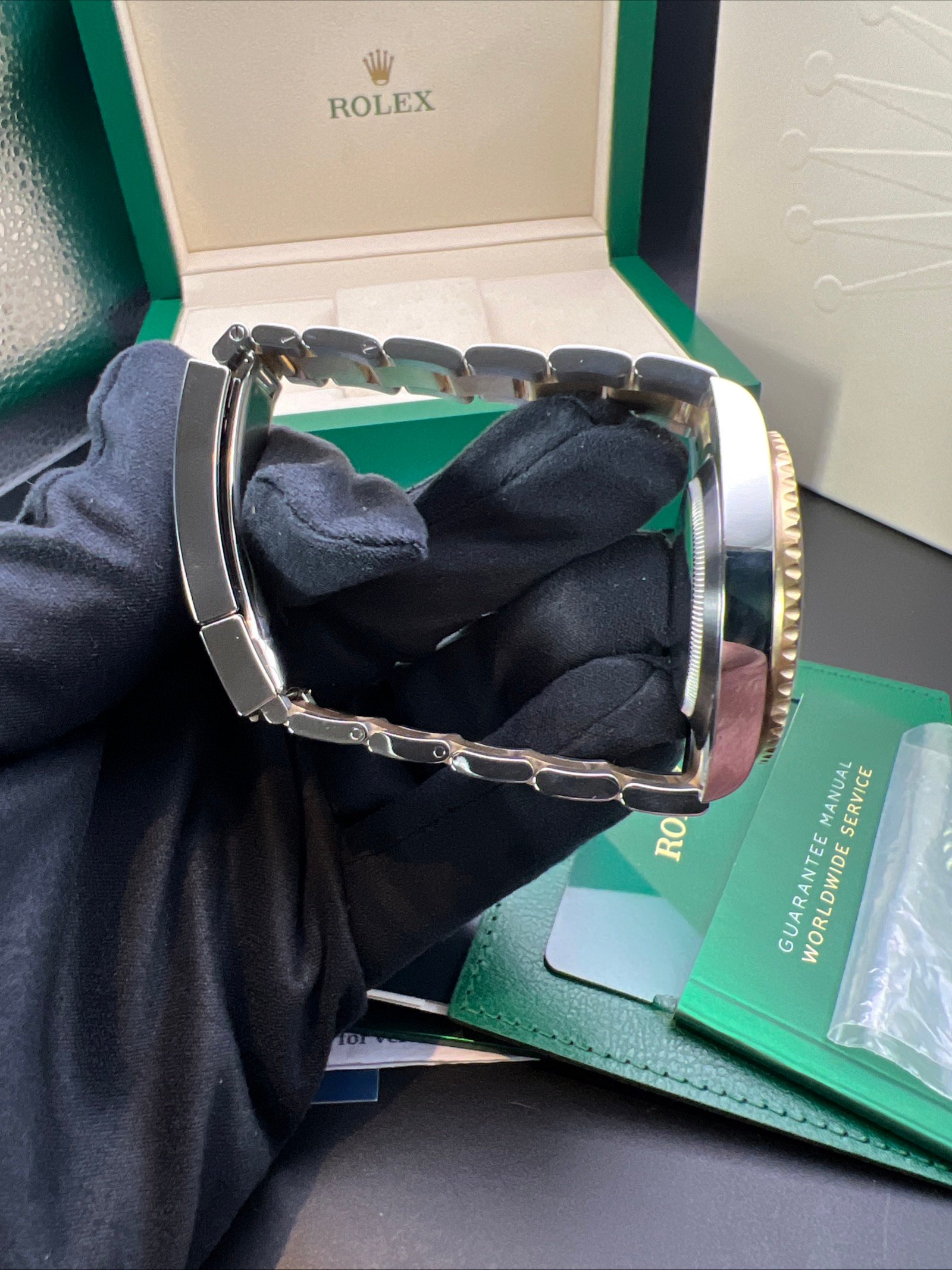 Included in the sale are the original Rolex boxes, papers (card), booklets, wallet, Tag and original purchase receipt. You will also receive a Watch register certificate showing it’s free of