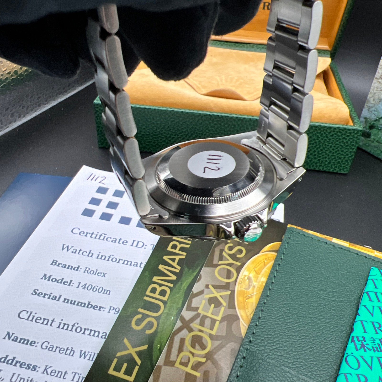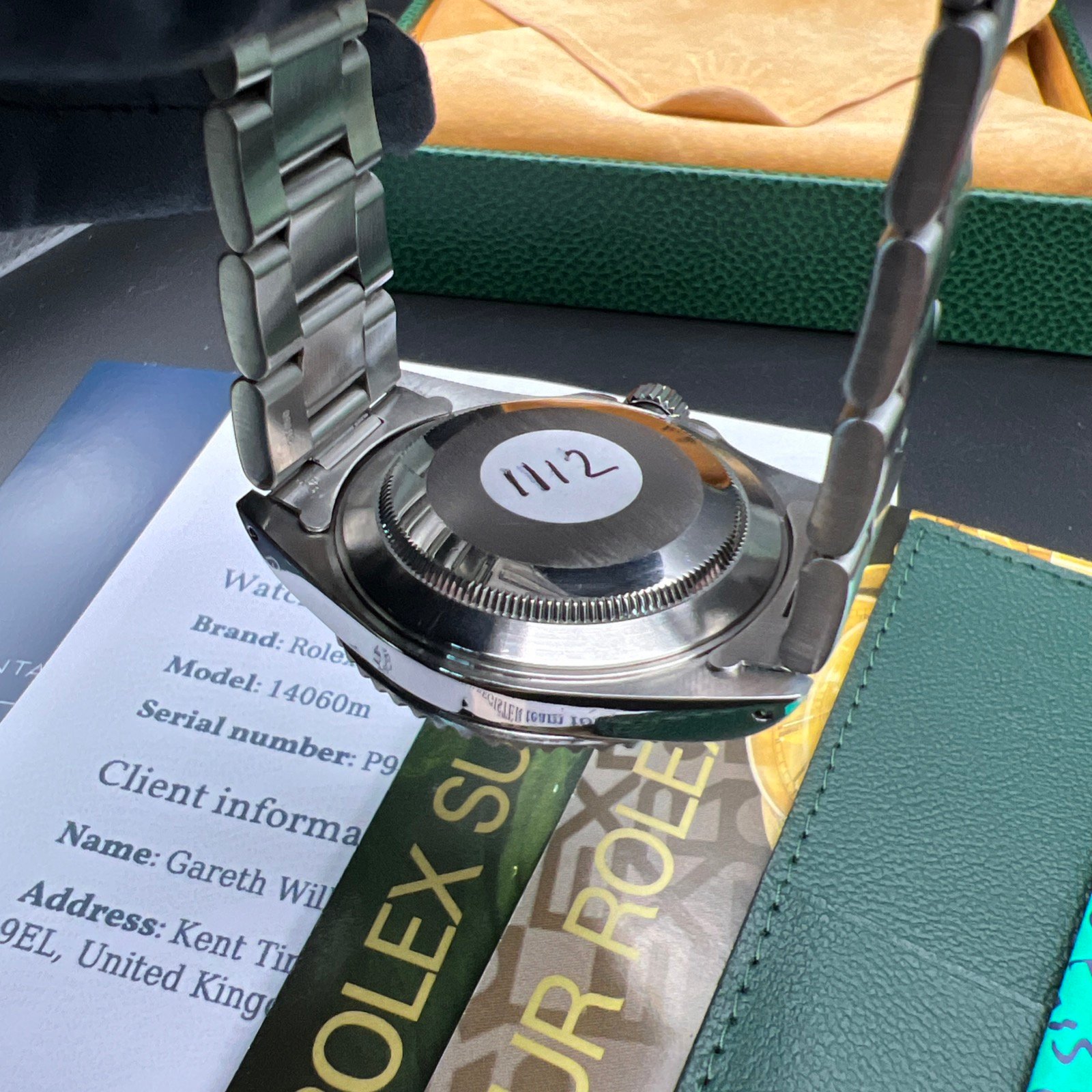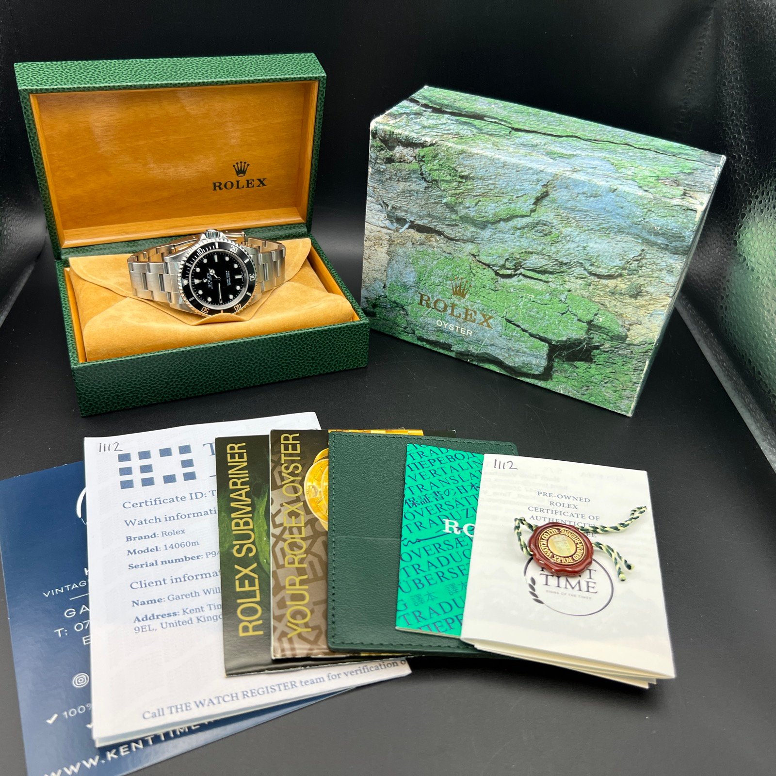| Rolex submariner 14060M no date gents watch . Year 2000 2 liner model. The watch is presented in very good condition and working correctly. It’s been inspected for time keeping and functionality prior to listing by our watchmaker. There is evidence of use in the form of light marks and wear as it is a used item. Comes complete with Rolex box, booklets,wallet and tag. Also included is a watch register certificate and our certificate. |