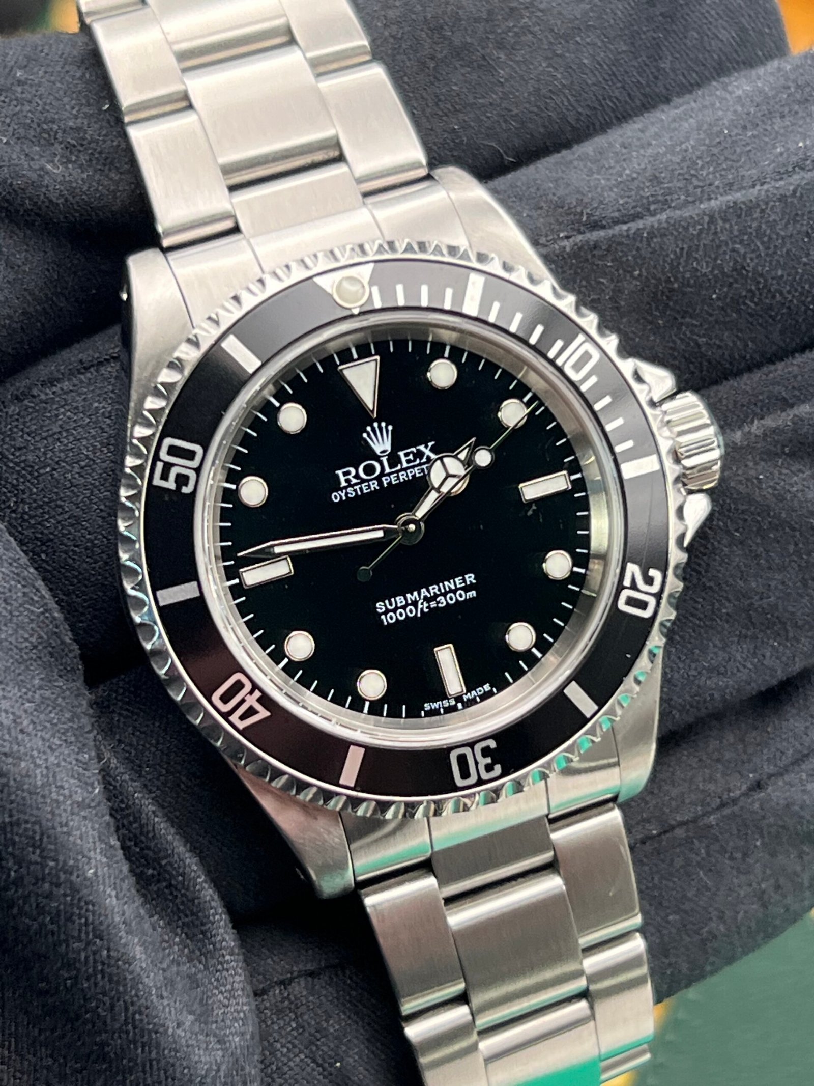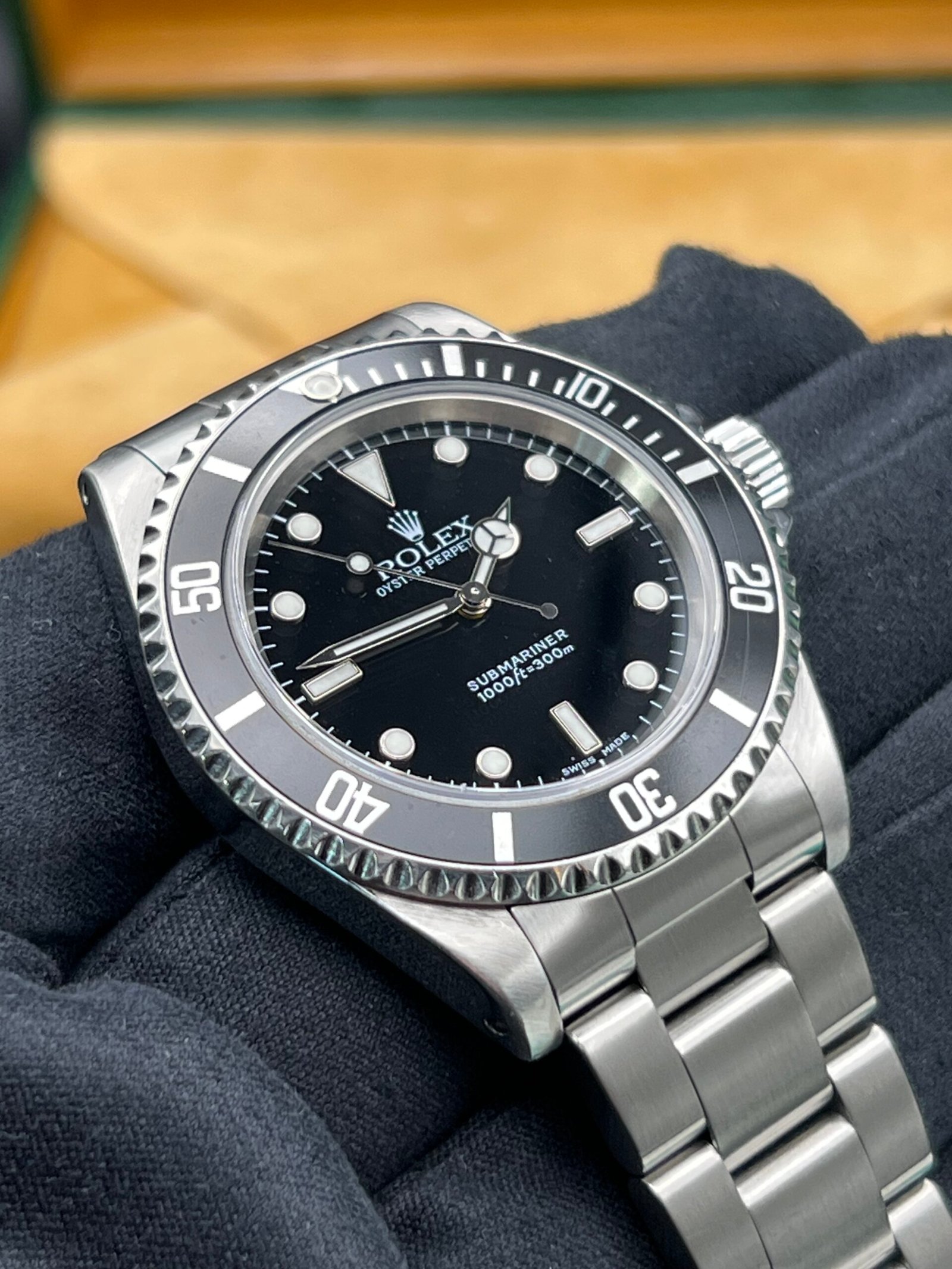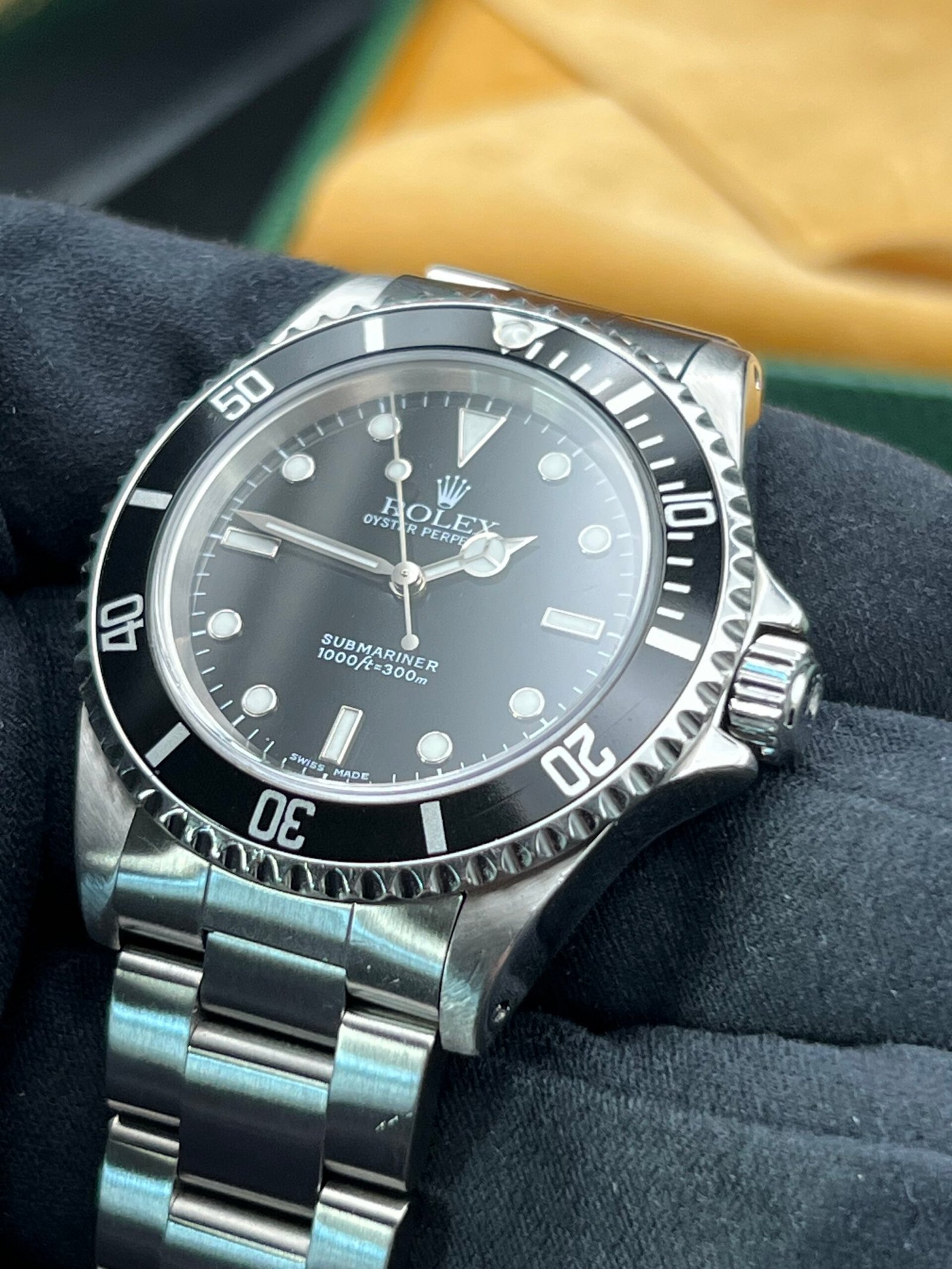 | Rolex submariner 14060M no date gents watch . Year 2000 2 liner model. The watch is presented in very good condition and working correctly. It’s been inspected for time keeping and functionality prior to listing by our watchmaker. There is evidence of use in the form of light marks and wear as it is a used item. Comes complete with Rolex box, booklets,wallet and tag. Also included is a watch register certificate and our certificate. |