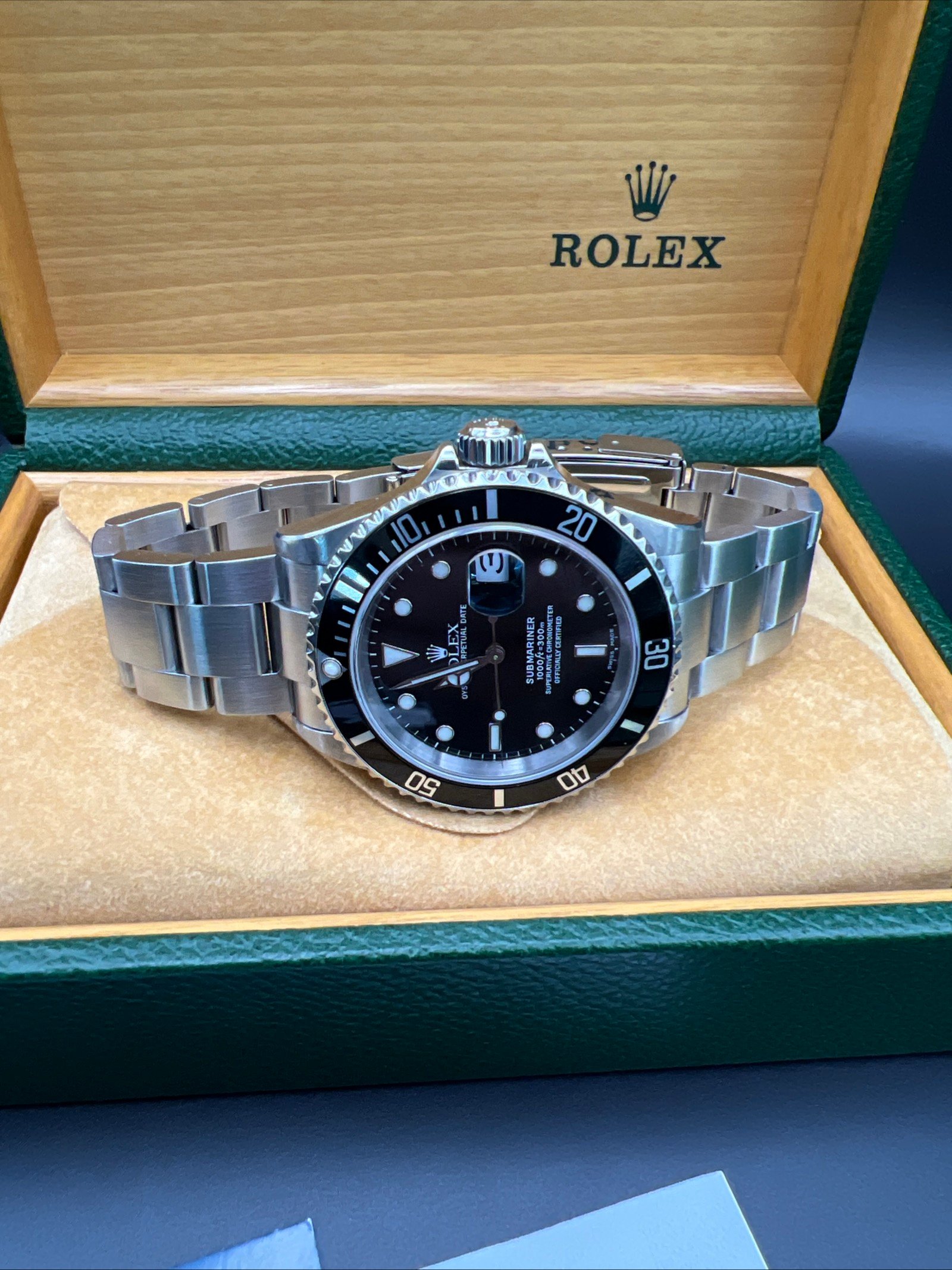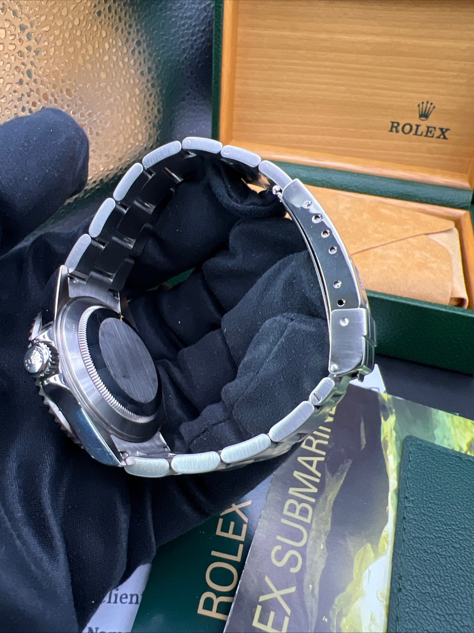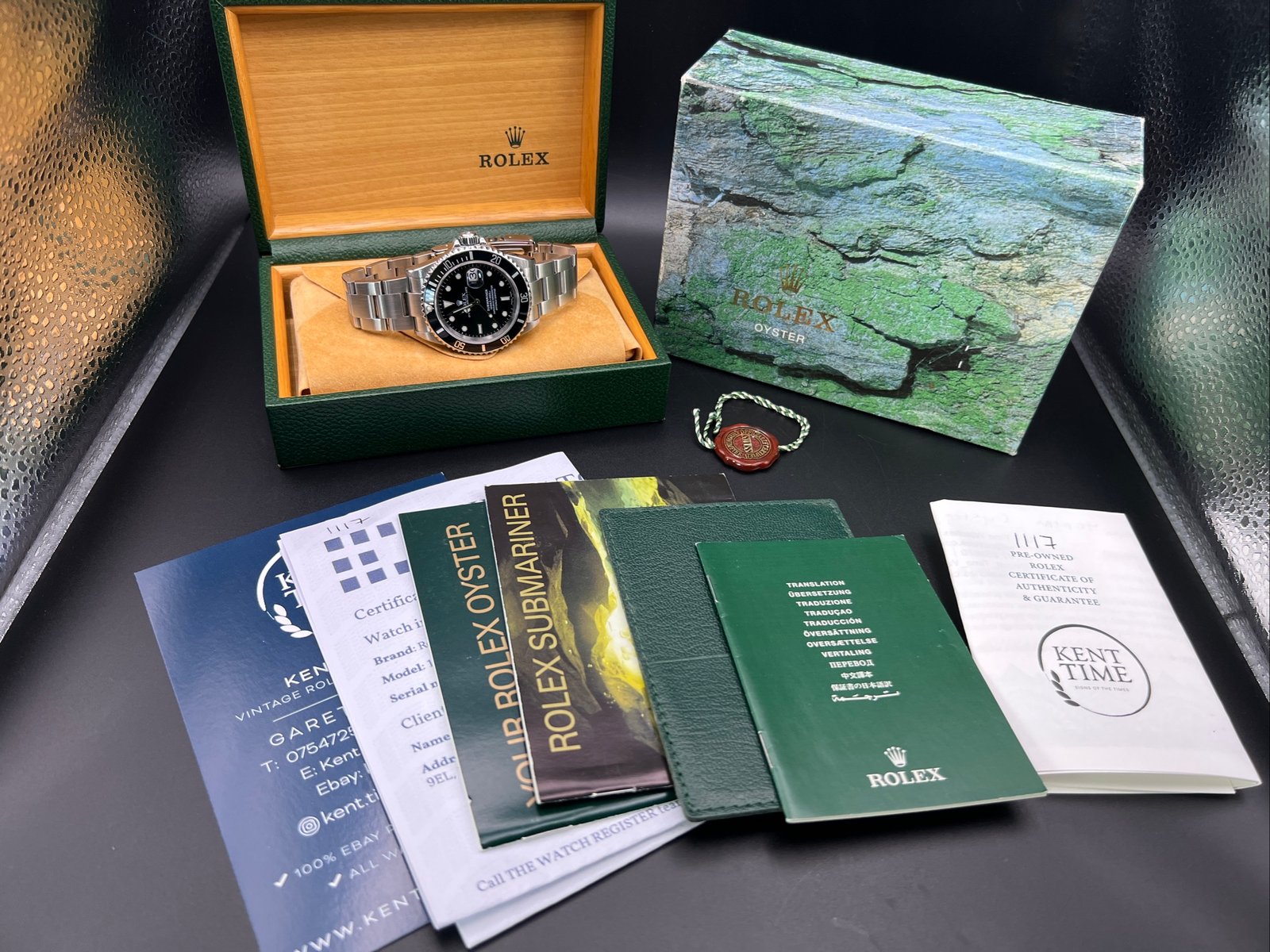 | Rolex submariner 16610 just in stock . Comes with Rolex box and accessories. This was made in 2005. The watch comes with Rolex box,Rolex booklets, wallet and tag. -The watch is in good order and running very well , please see timegraph photo. It shows only light marks from wear . Please see the pictures. -The dial is unmarked as is the glass . You will receive a watch register certificate showing it’s clear of claims, our certificate ,No papers .
