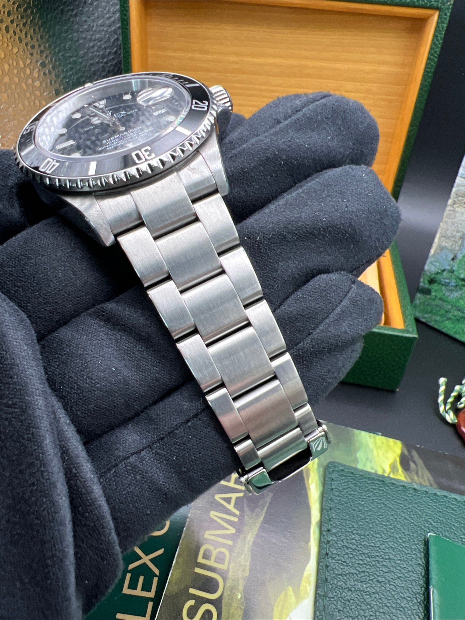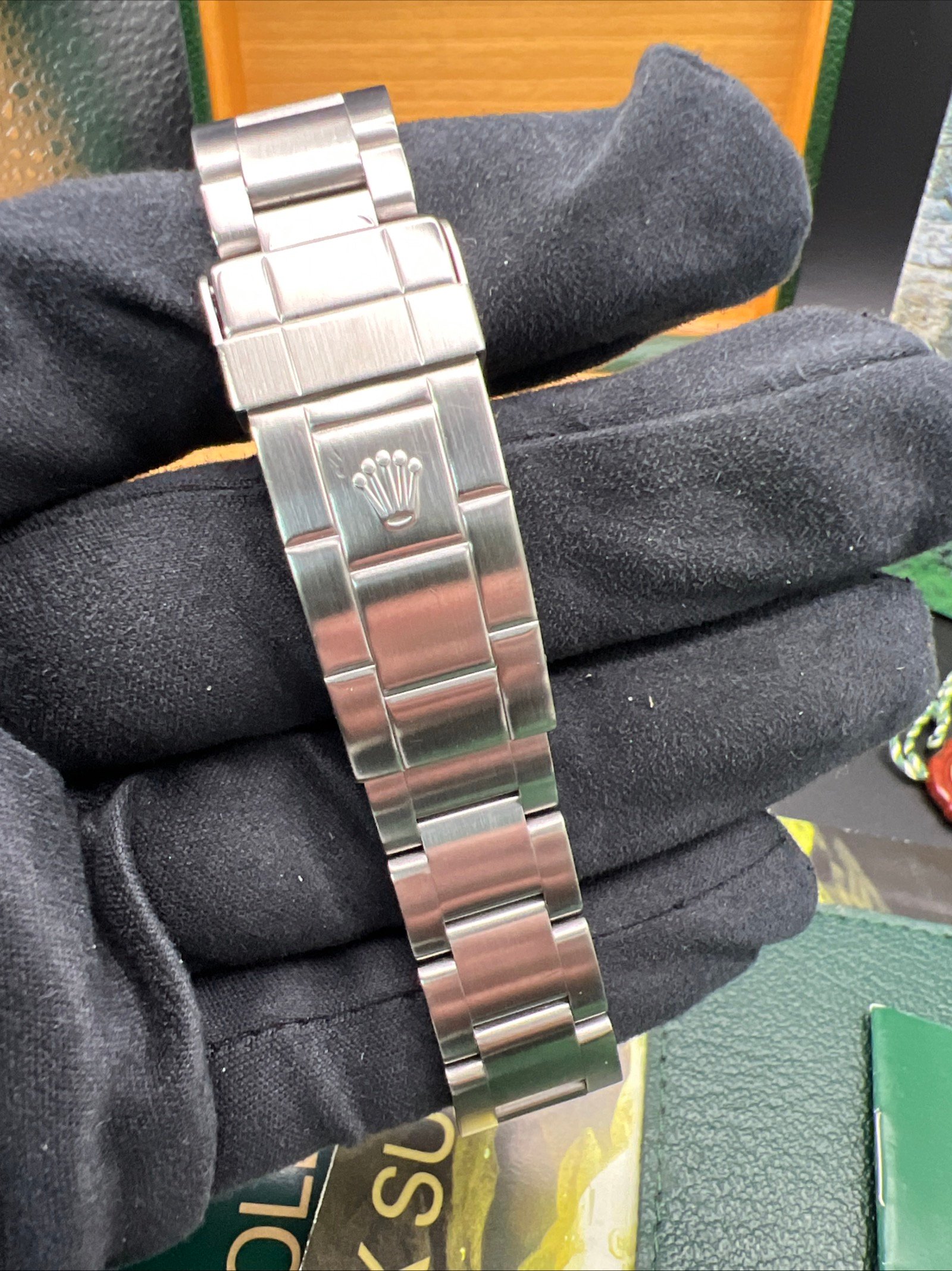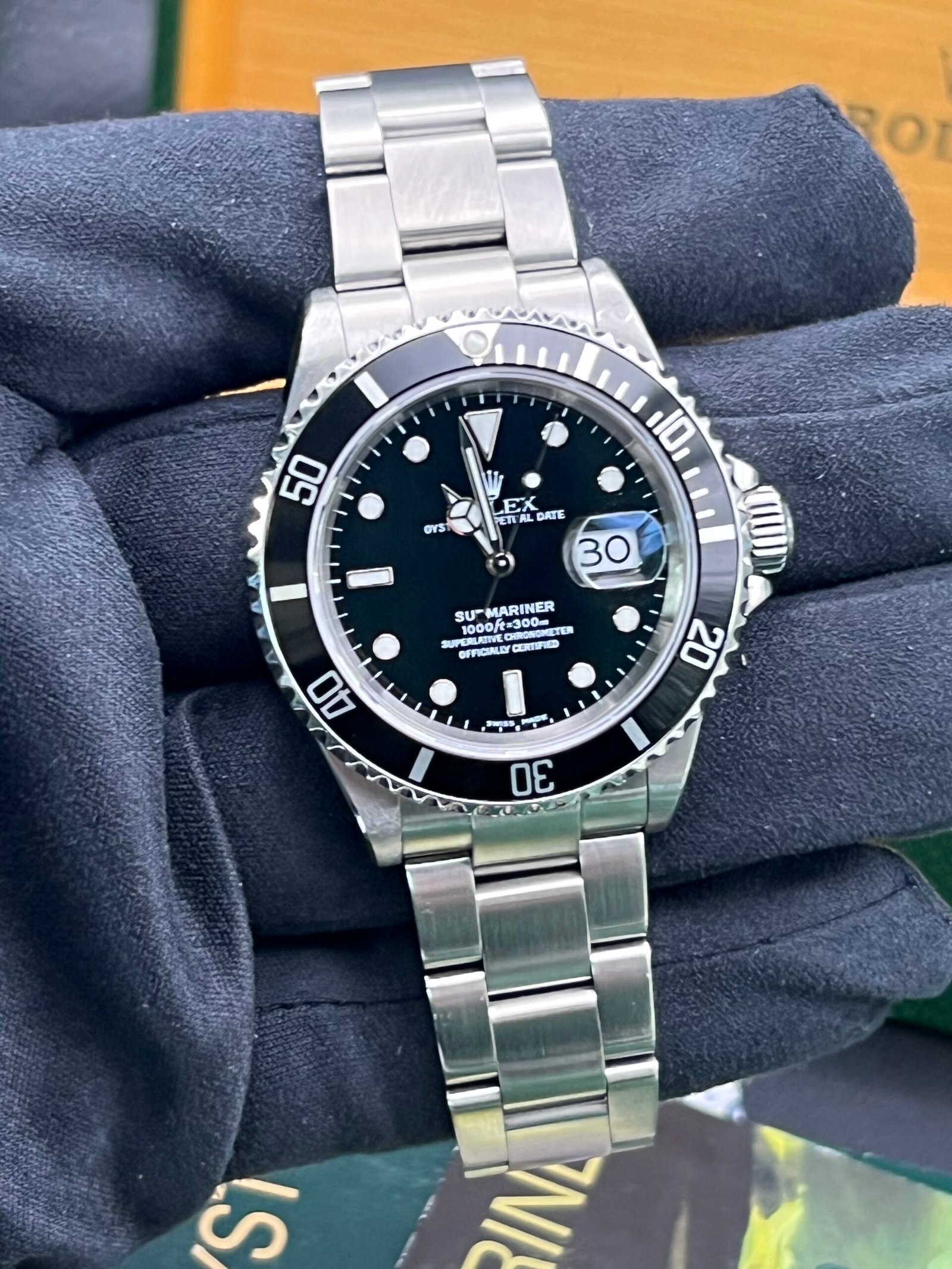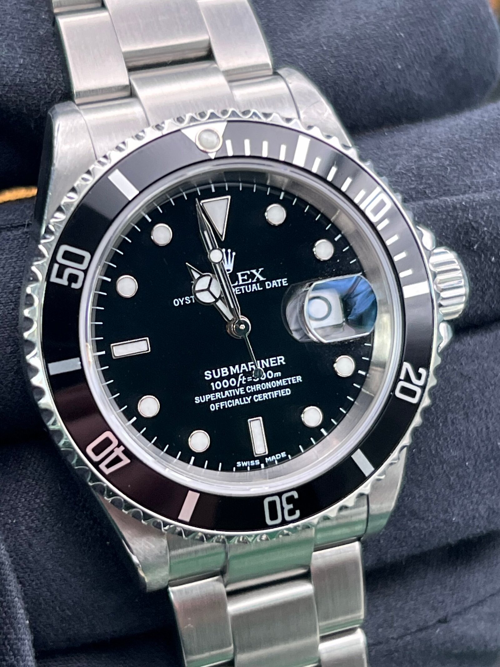 | Rolex submariner 16610 just in stock . Comes with Rolex box and accessories. This was made in 2005. The watch comes with Rolex box,Rolex booklets, wallet and tag. -The watch is in good order and running very well , please see timegraph photo. It shows only light marks from wear . Please see the pictures. -The dial is unmarked as is the glass . You will receive a watch register certificate showing it’s clear of claims, our certificate ,No papers .