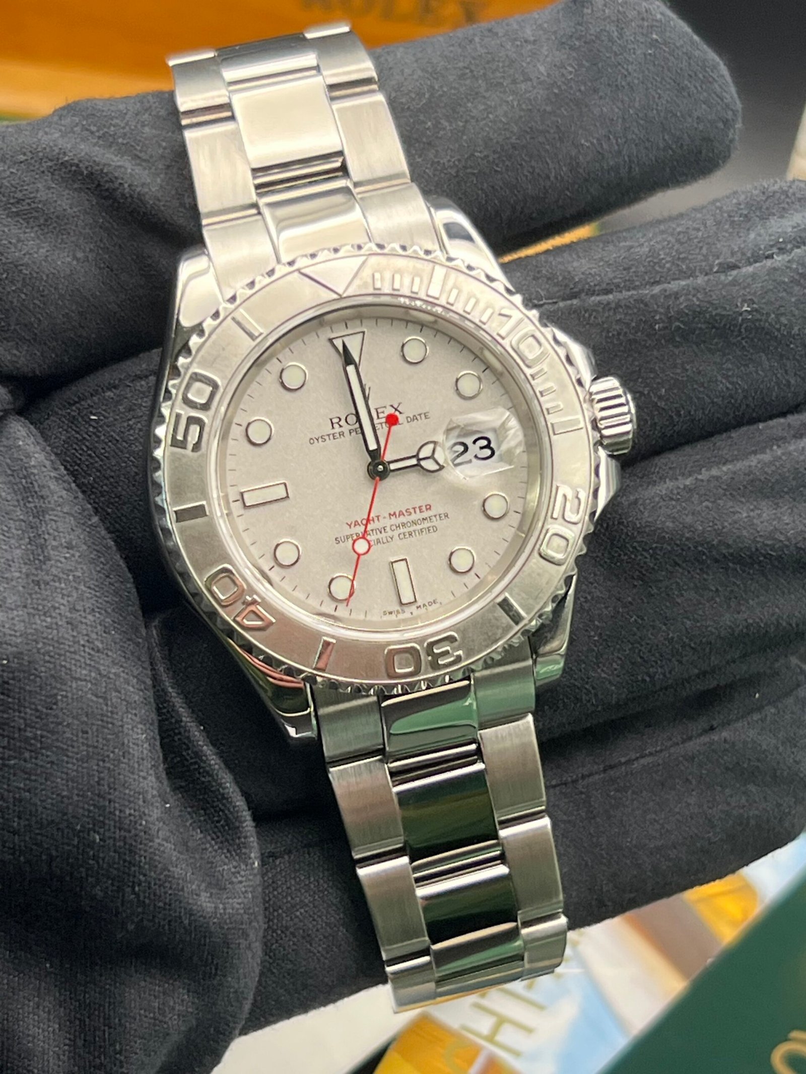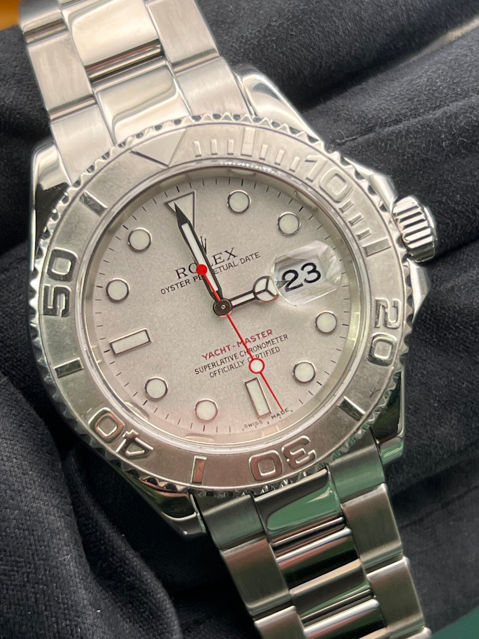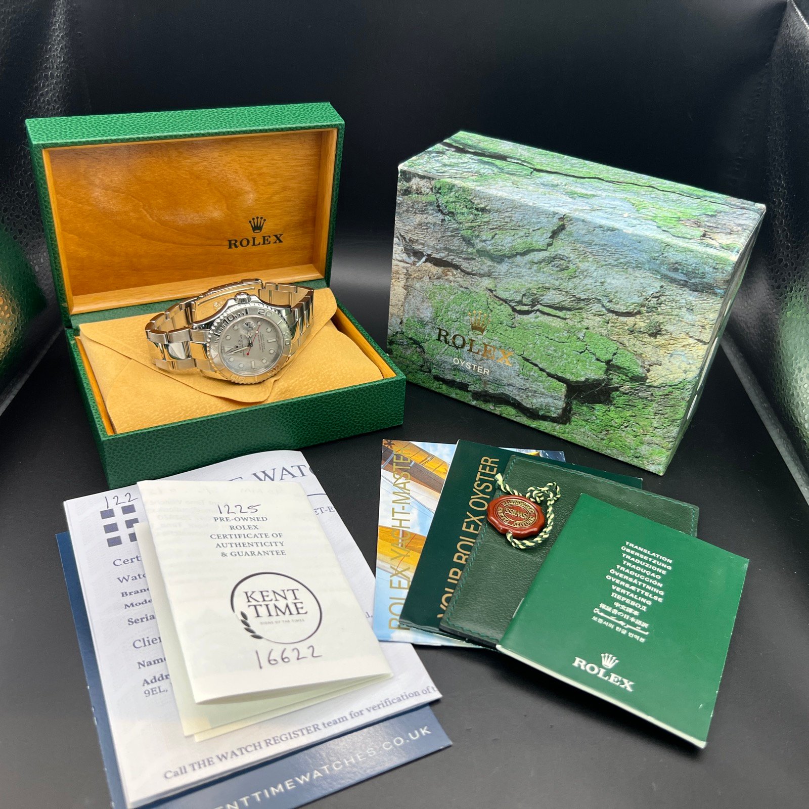 | Rolex yacht master reference 16622 40 mm gents stainless steel Watch. This Watch was made in 2006. The Watch has been inspected prior to listing and was found to be running very well (please see the Time graph pictures). The Watch is presented in good condition. It does have light marks from use as you’d expect from a Watch that is 20 years old. It comes with Rolex boxes, booklets, wallet and Tag. You will also receive a copy of a Watch register check, our own authentication |