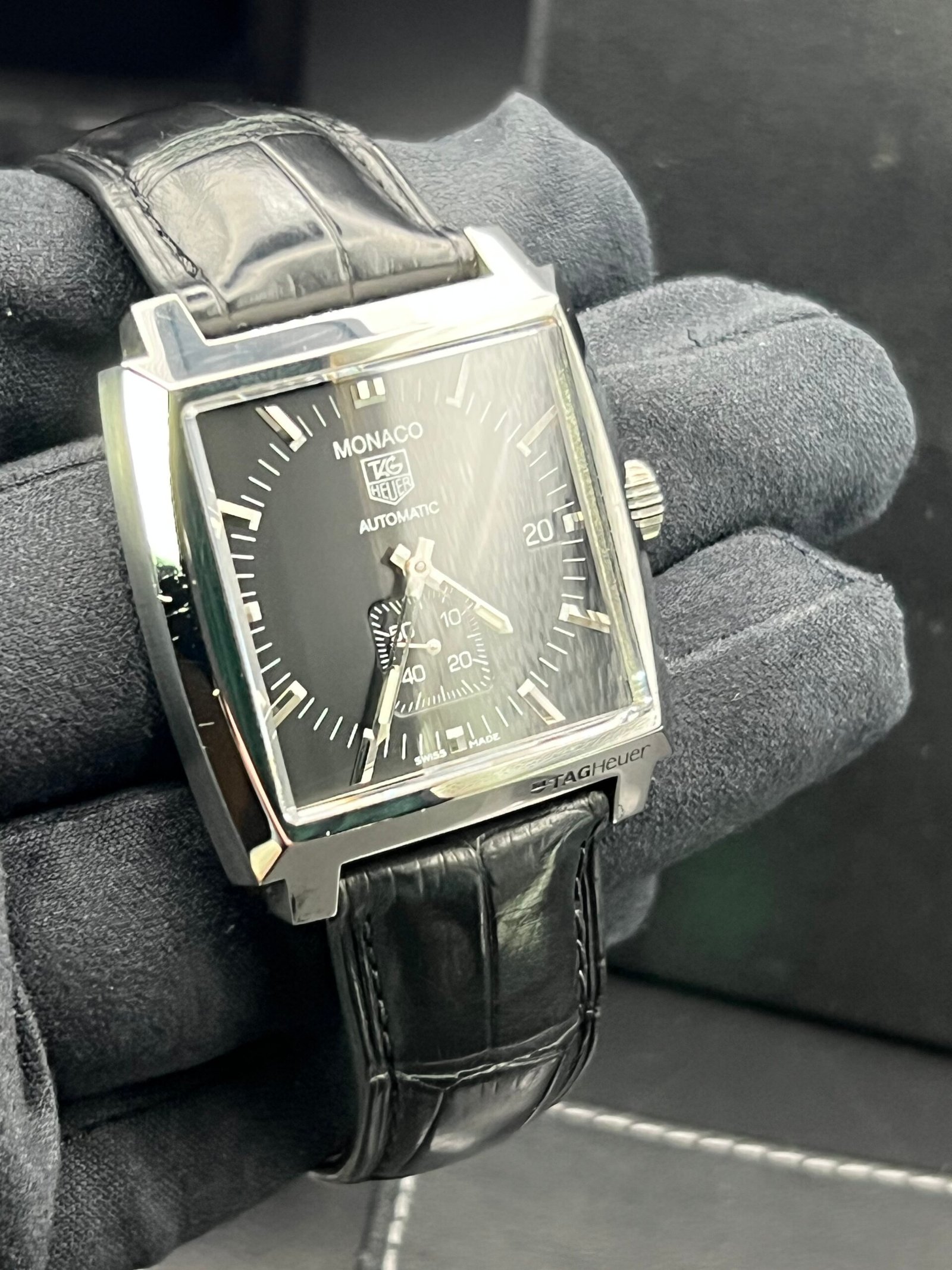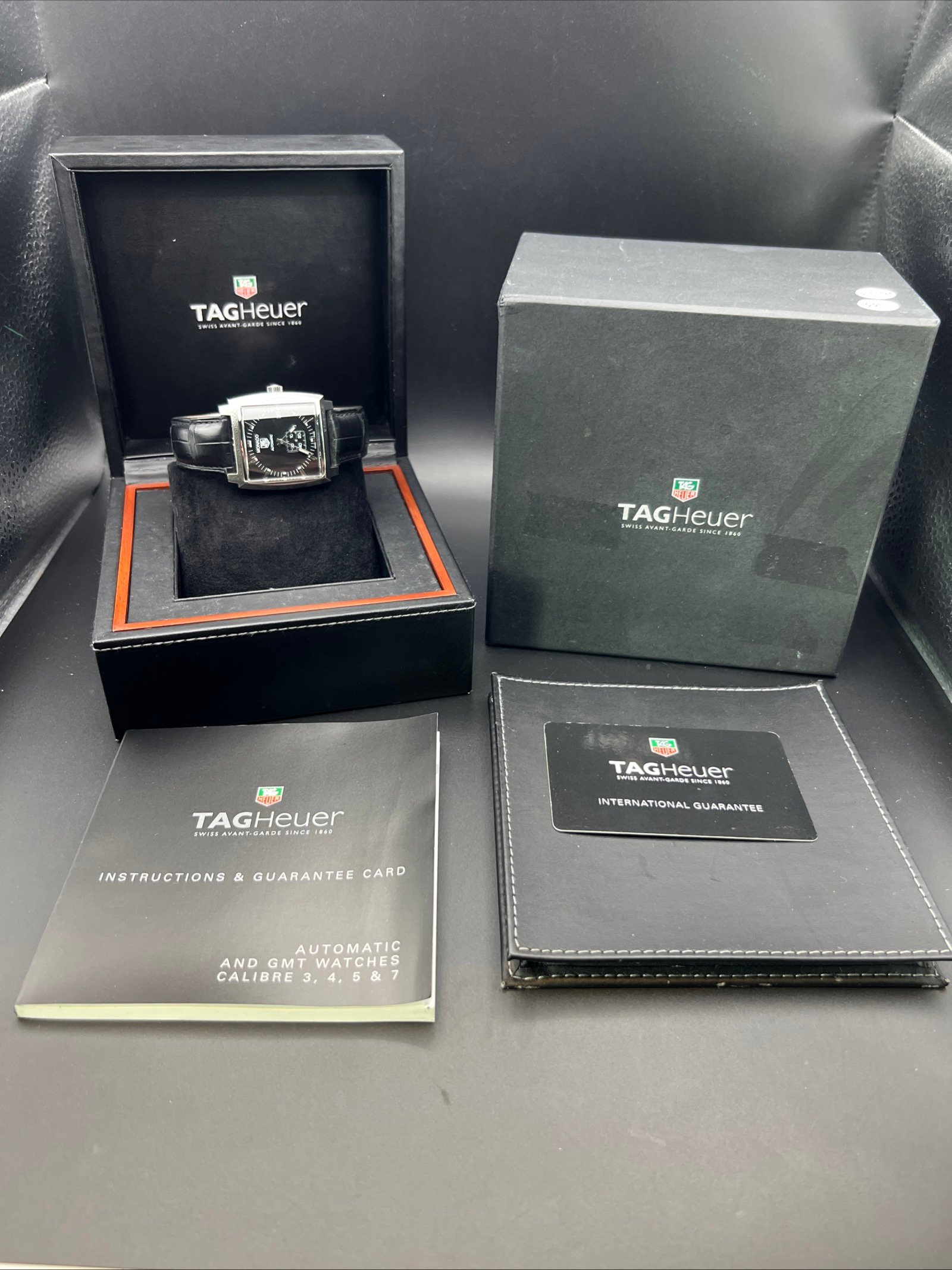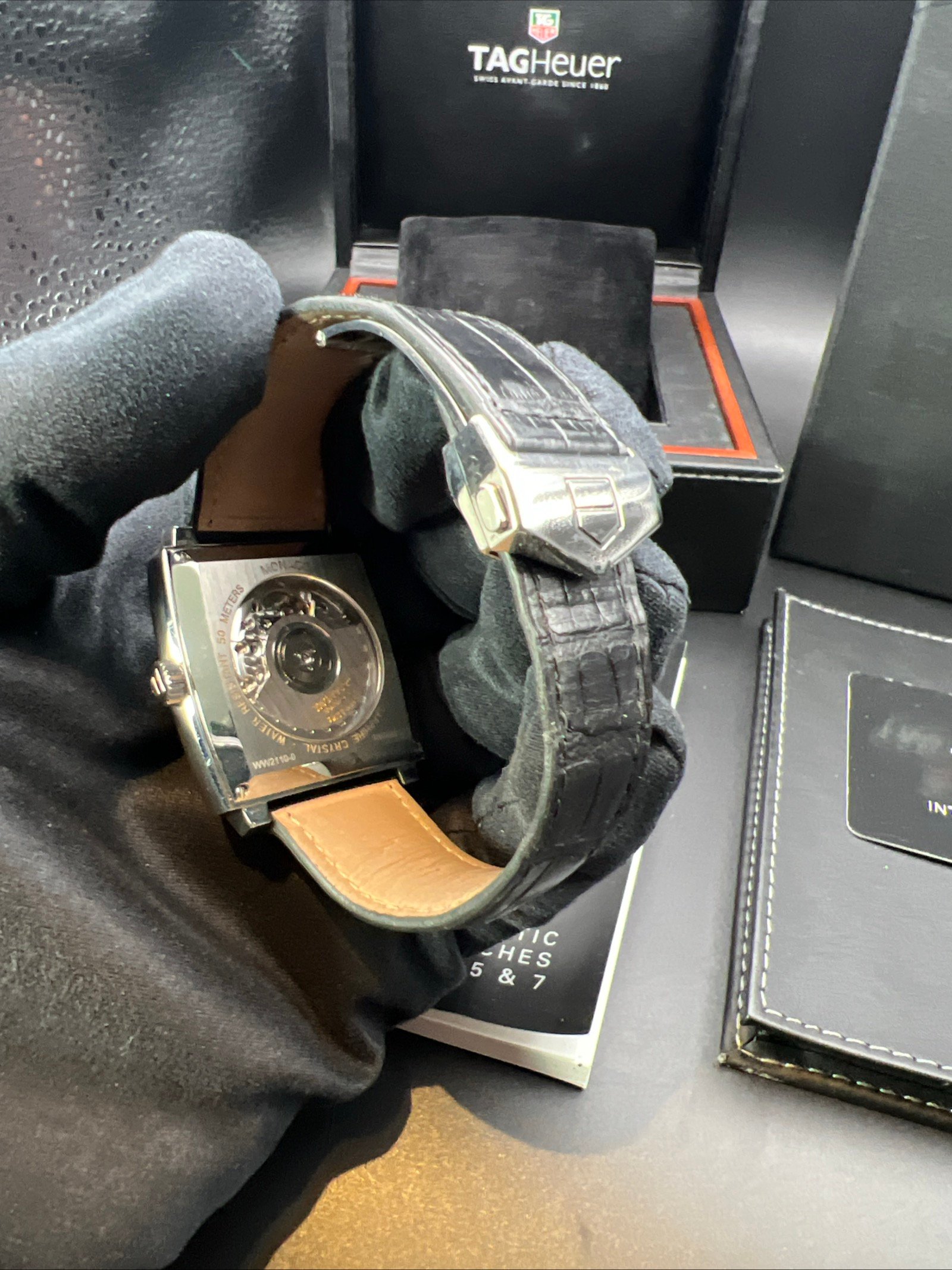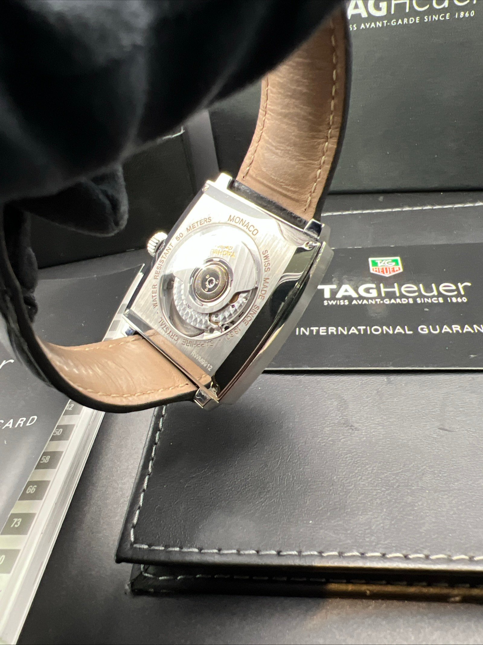 | Tag Heuer Monaco automatic gents wristwatch. This is the reference WW2110–0 it was originally sold in 2009. The watch comes with its original boxes, warranty card (papers) and instruction booklet. The watch is in good condition with only a few light marks from wear. It has just been serviced this week so is running perfectly and keeping time. The watch is presented on next original strap with deployment clap. Please see photos, our other listings and our feedback thank you. |