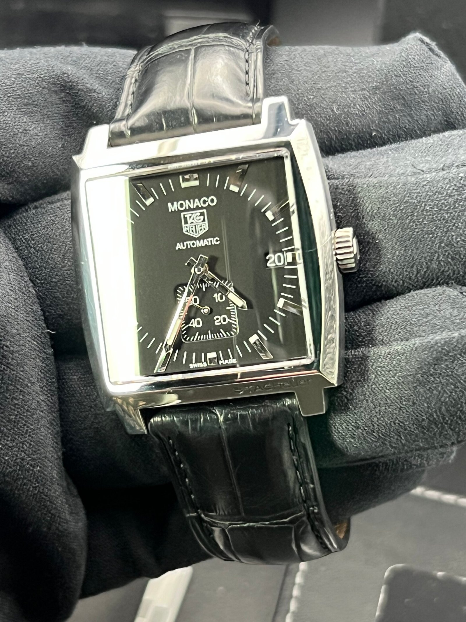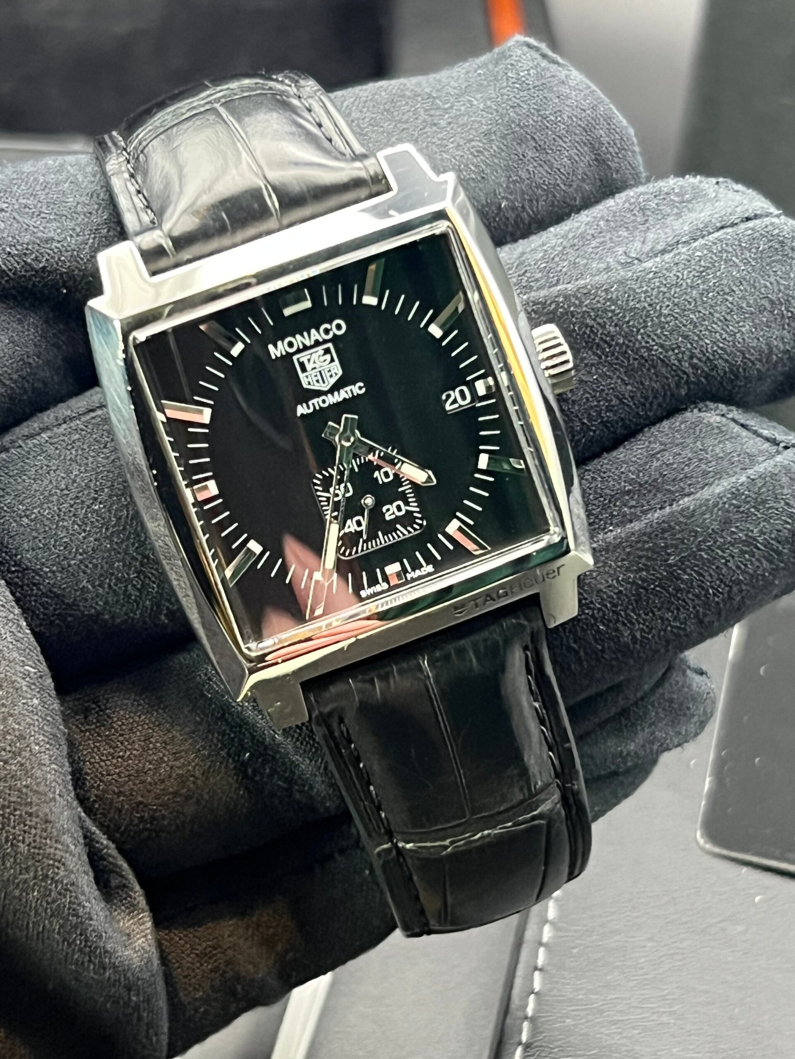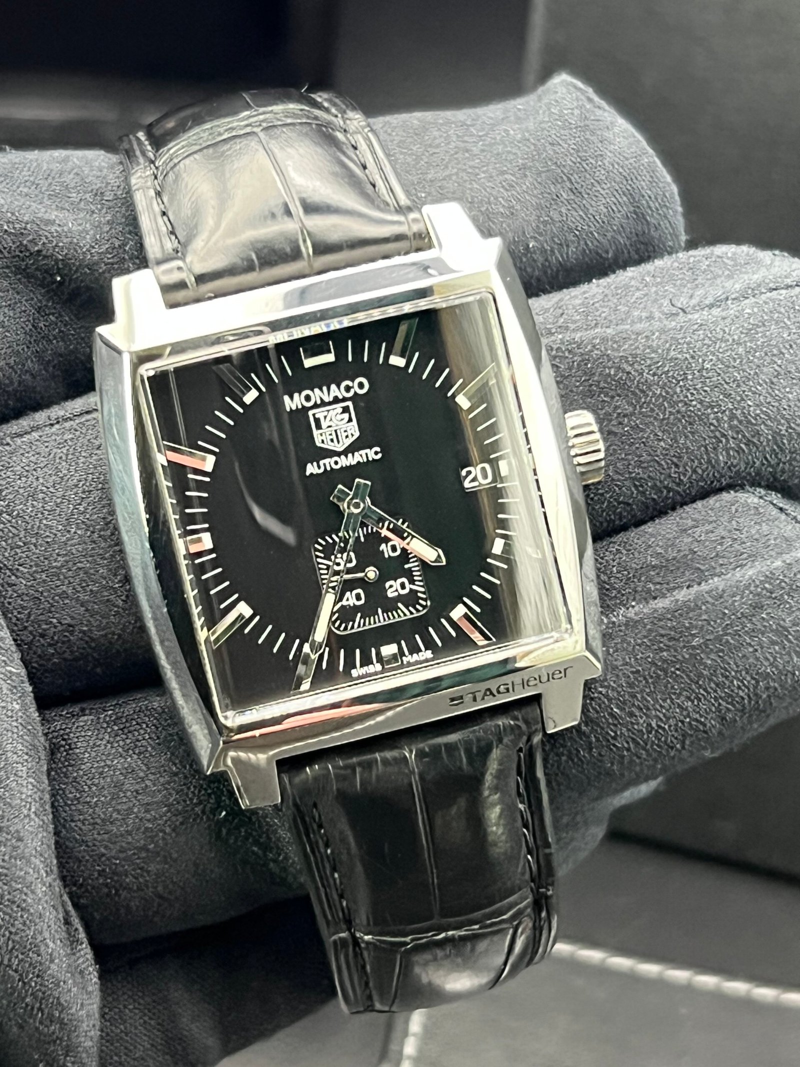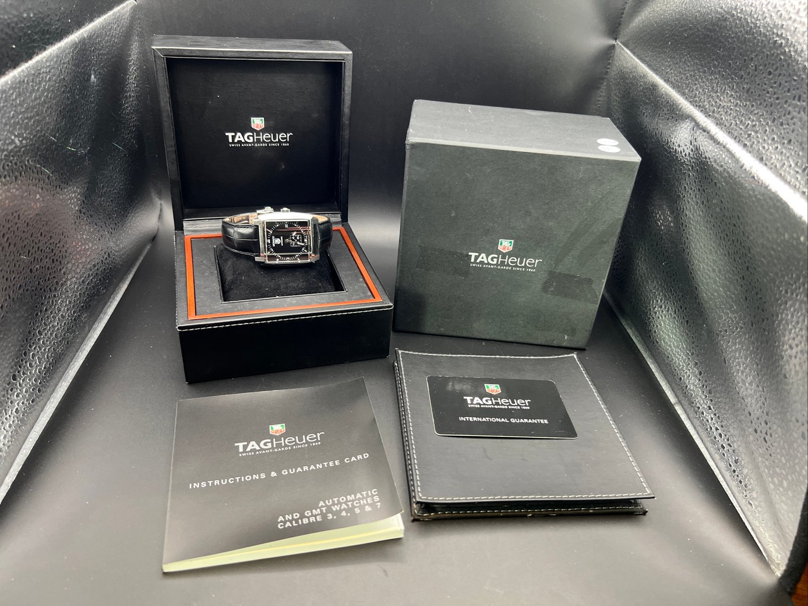 | Tag Heuer Monaco automatic gents wristwatch. This is the reference WW2110–0 it was originally sold in 2009. The watch comes with its original boxes, warranty card (papers) and instruction booklet. The watch is in good condition with only a few light marks from wear. It has just been serviced this week so is running perfectly and keeping time. The watch is presented on next original strap with deployment clap. Please see photos, our other listings and our feedback thank you. |