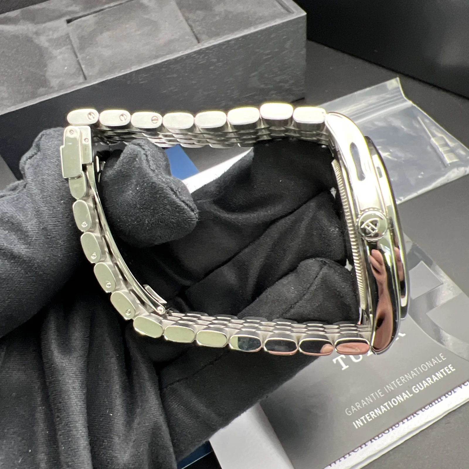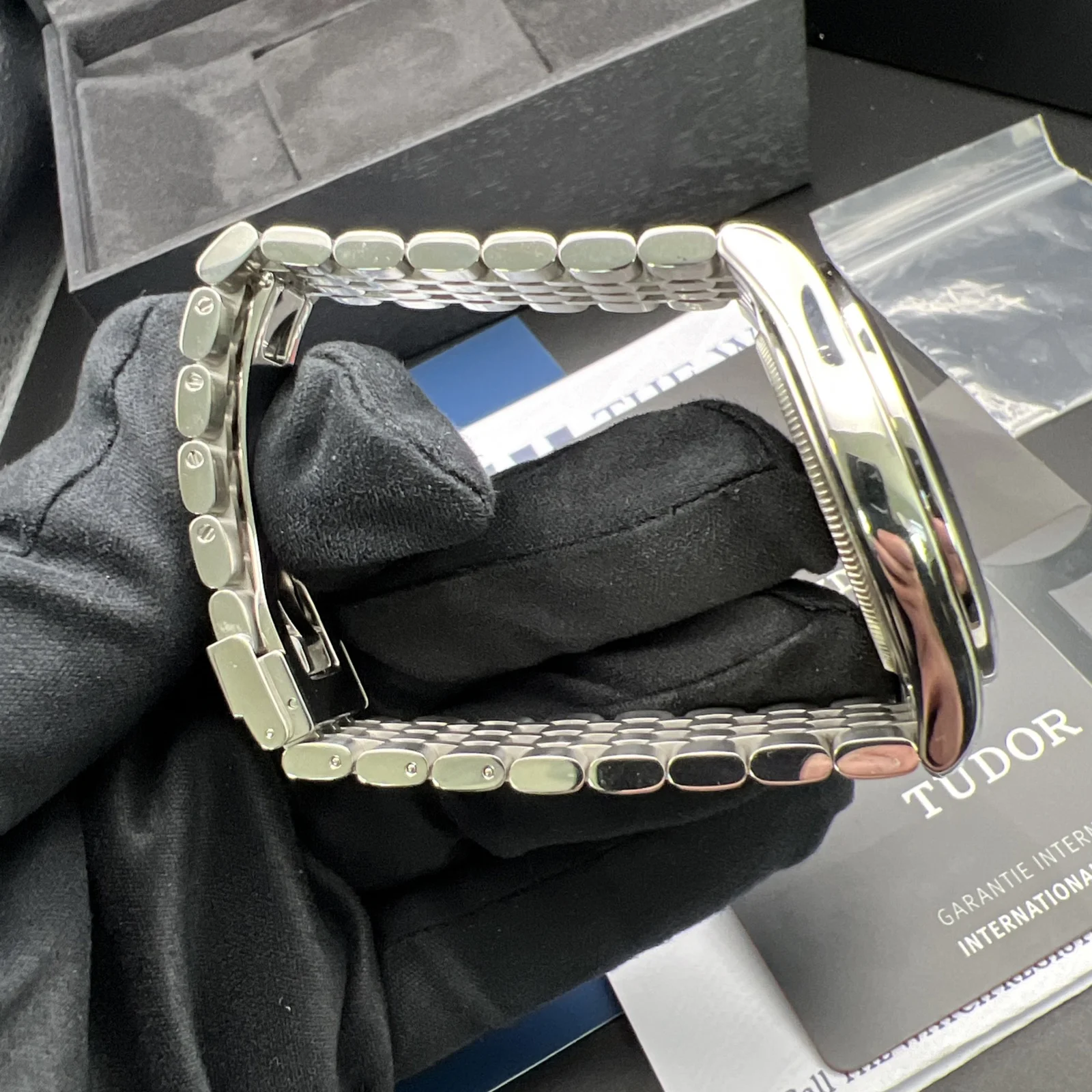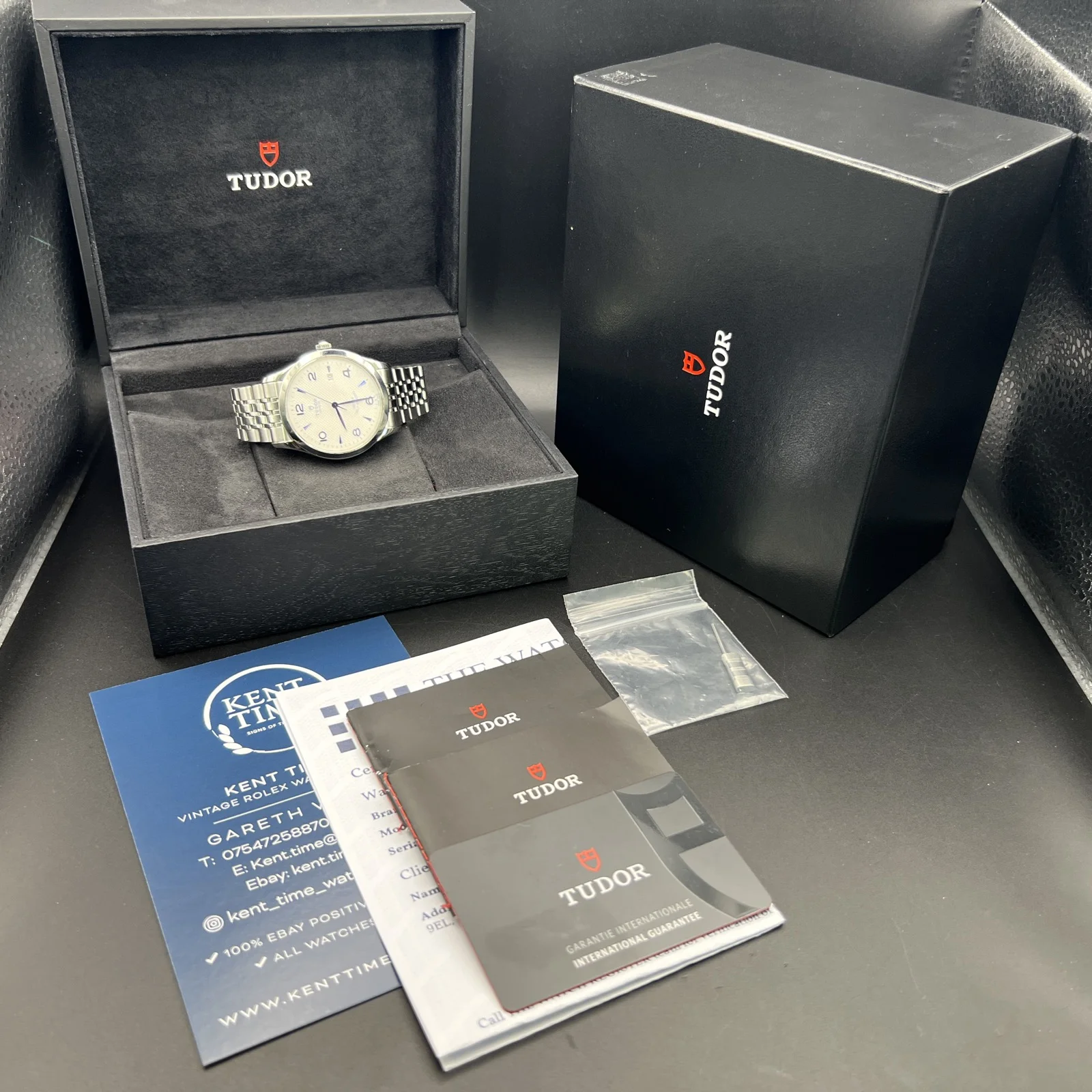 It comes with its original boxes, warranty card and booklets. It has a full compliment of links. It has been Watch register Checked.